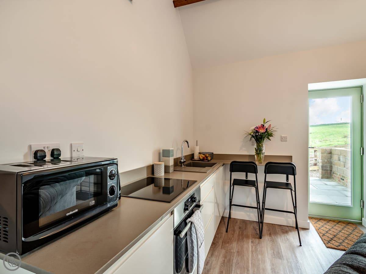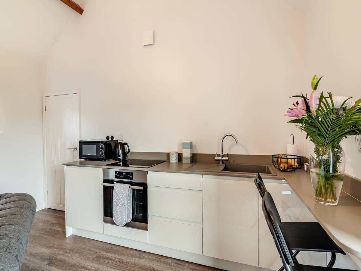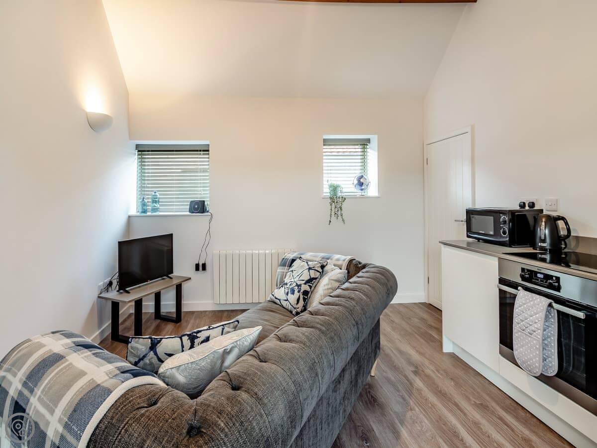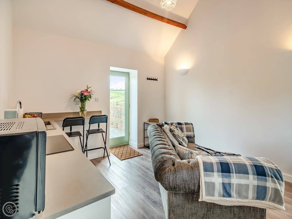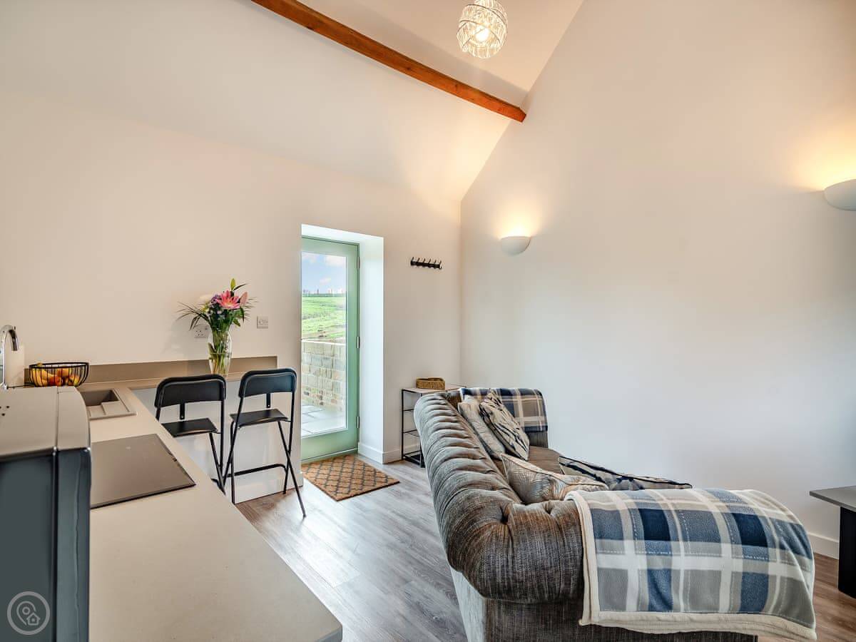 This is Cart Shed on our farm in Normanby. It's just two of us here, so it's a one-bedroom place for two people. It's a converted barn, so it's one big room downstairs with the kitchen and living area, and the bedroom with a kingsize bed is upstairs.