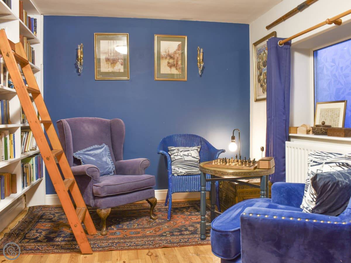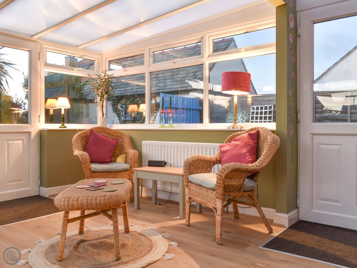 The garden at the back is enclosed. It gets the sun and has flowers in the warmer months. The dining room and the sun room both have doors out to it. The kitchen is in the middle of the house and has a pantry. There's a separate living room with a TV and a small study at the front with a telescope. You can watch the ships from there.