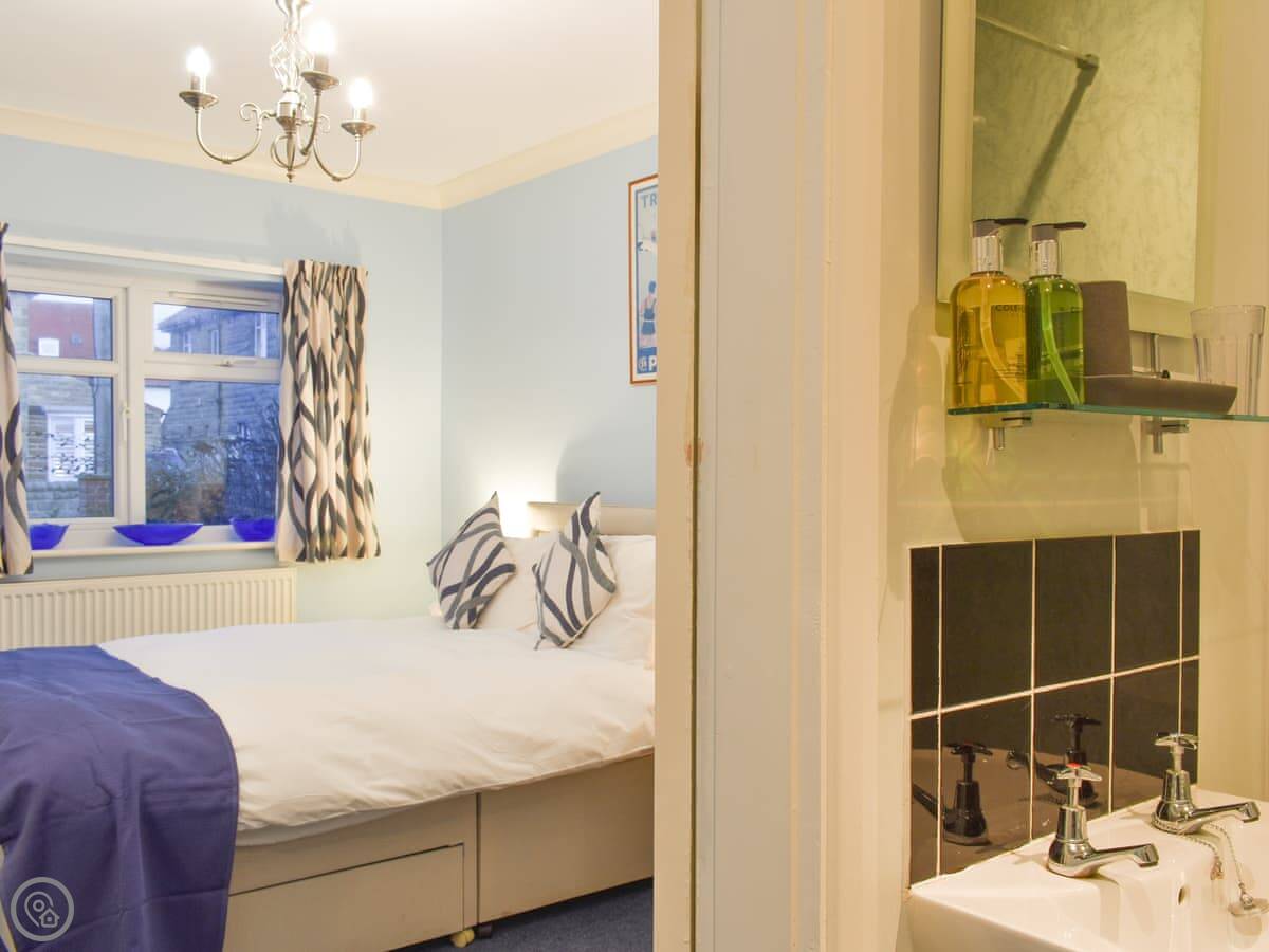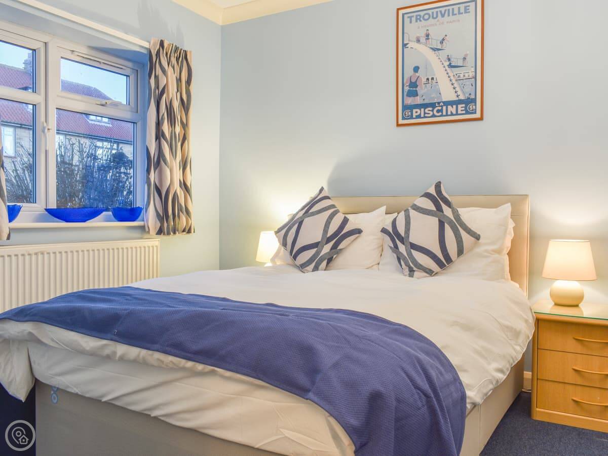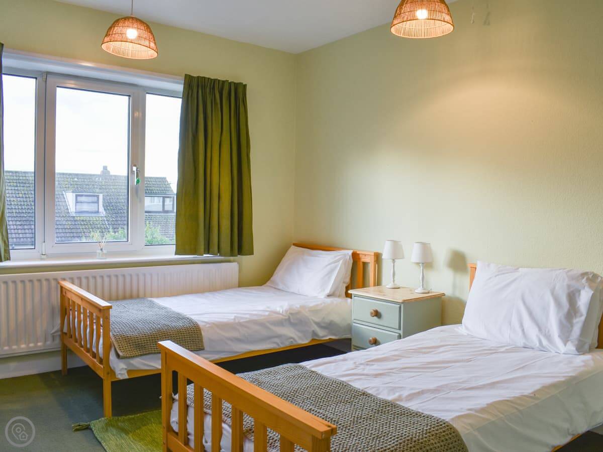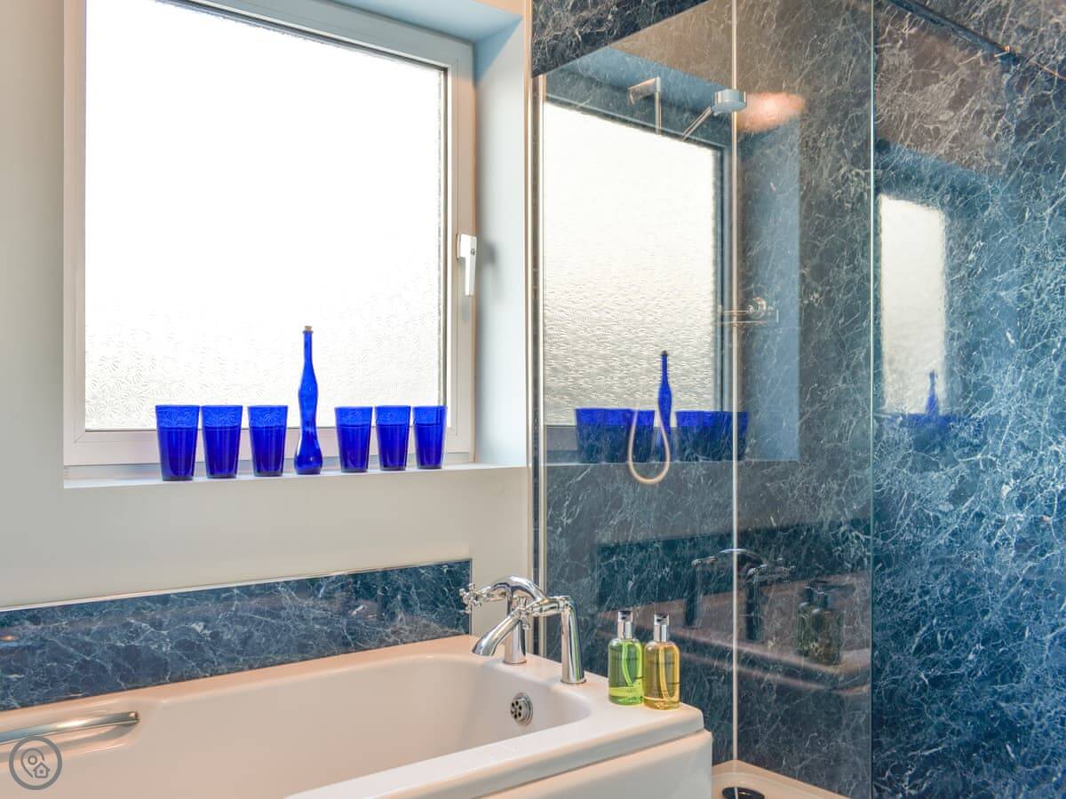 It sleeps eight. Four bedrooms, three bathrooms. One of the bedrooms is on the ground floor with its own shower room. The other three are upstairs and all have a view of the sea. The main bedroom has a walk-in dressing area and an ensuite bathroom. It's got a 4 Star rating, so it's comfortable and well-equipped.