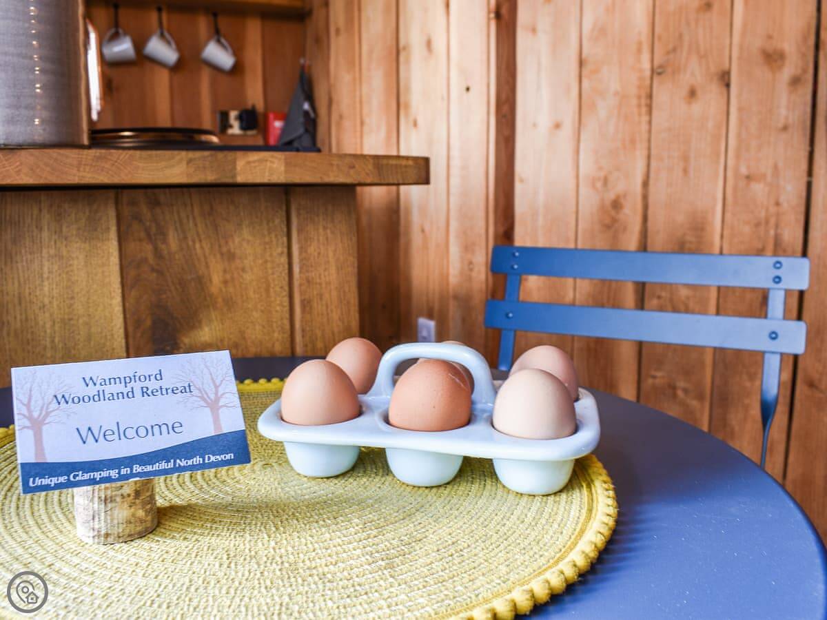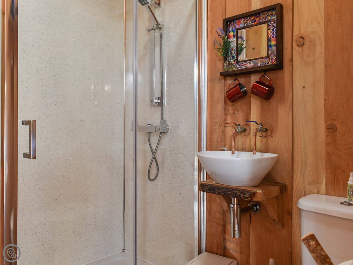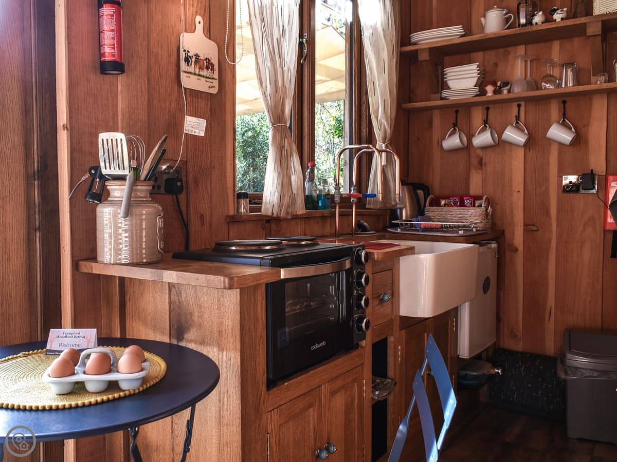 On the inside there’s a delightful open-plan living space which has been thoughtfully designed. There’s a comfortable, hand-crafted, kingsize bed where you can start the day by waking up to the gorgeous view on offer. There is also a cosy wood burner for those out-of-season escapes. The kitchen area is equipped with all of your ‘glamping’ needs including a mini cooker with two-ring hob, a fridge with icebox and of course the all-important kettle! There’s also a spacious shower room complete with a double shower cubicle.