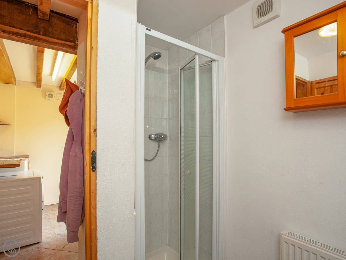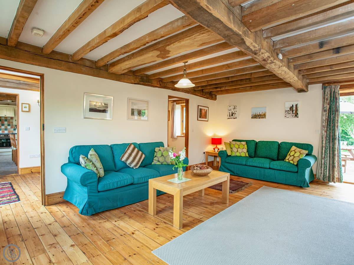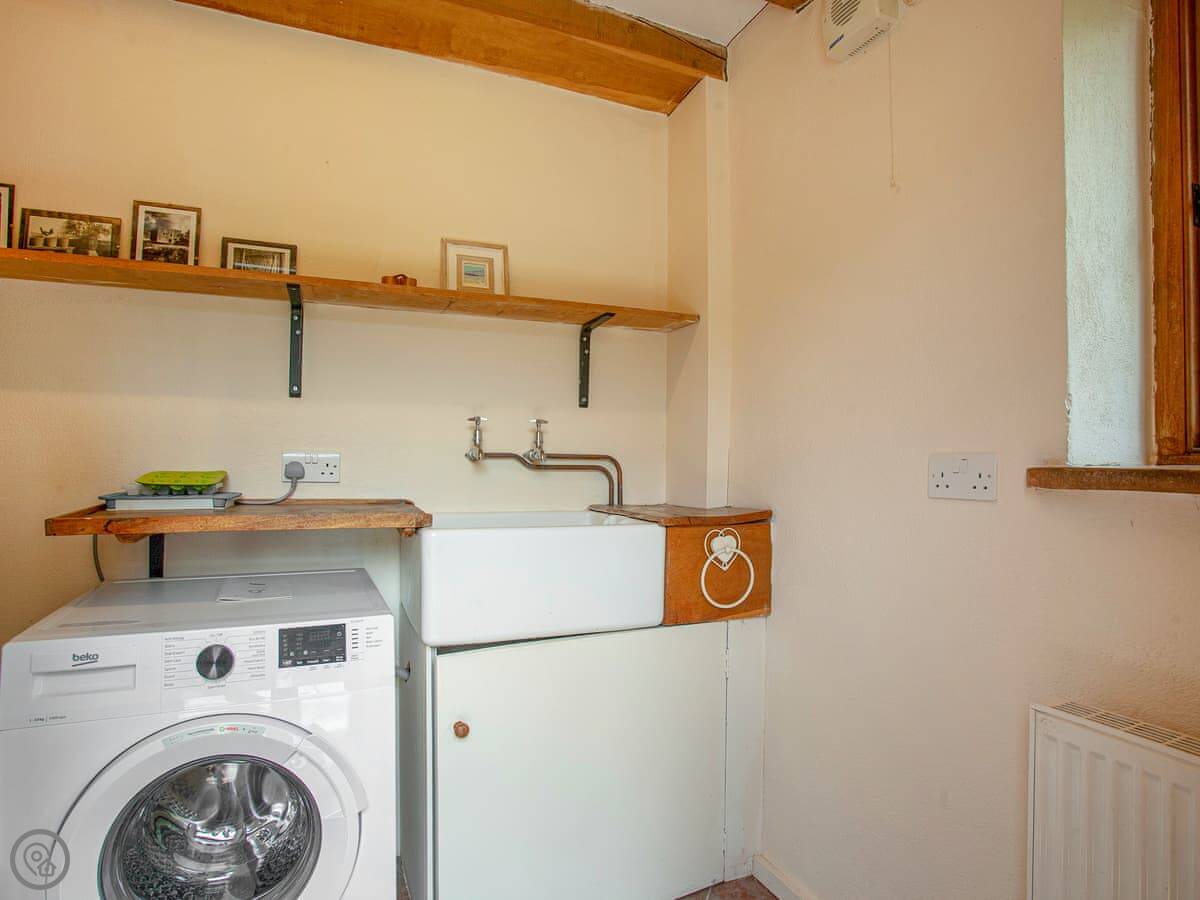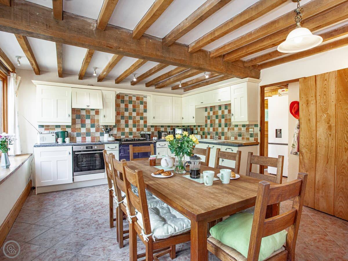 Inside, it's got beamed ceilings. The living room has a wood burner that runs on gas, so it's easy. The kitchen is big enough for everyone to have breakfast together. The utility room has a washing machine and an extra fridge-freezer.