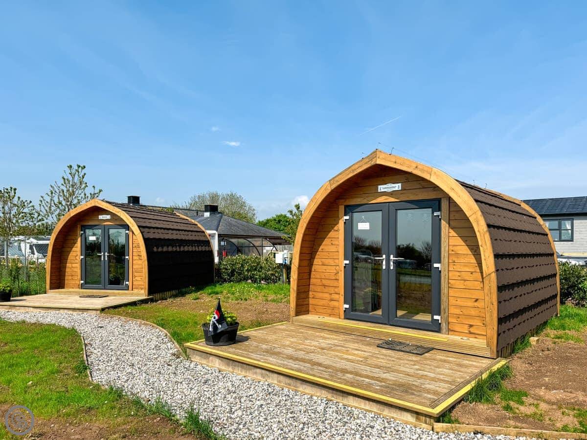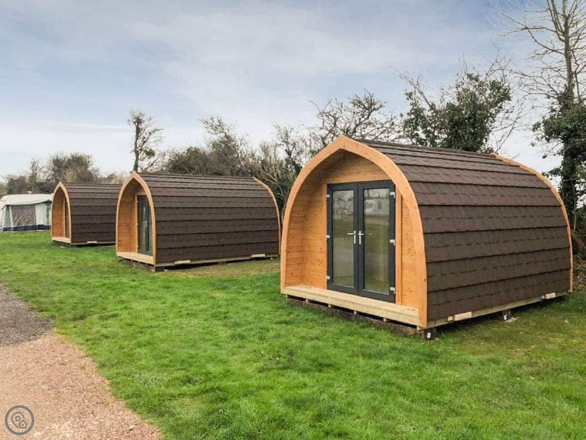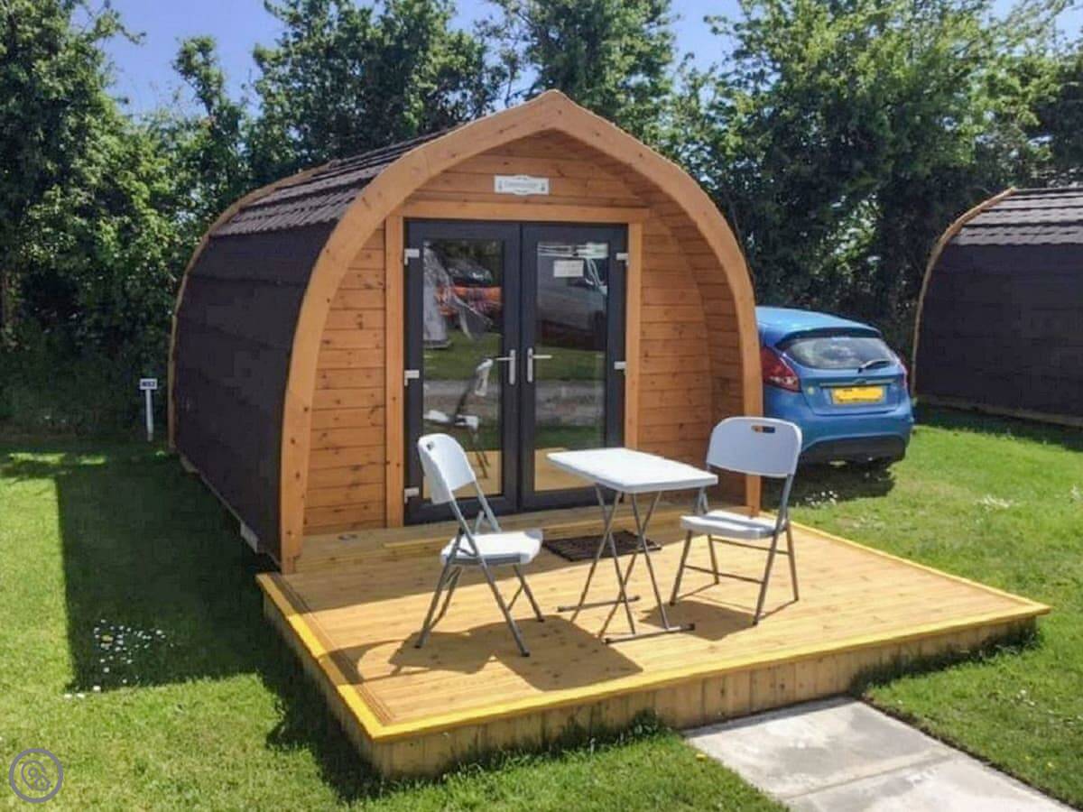It's really a comfortable base. The pod itself has a bedroom and a bathroom inside. The shower block for the whole site is just opposite if you need it. You've got a private patio with a BBQ, and there's plenty of grass area around and a kids' play park on site.