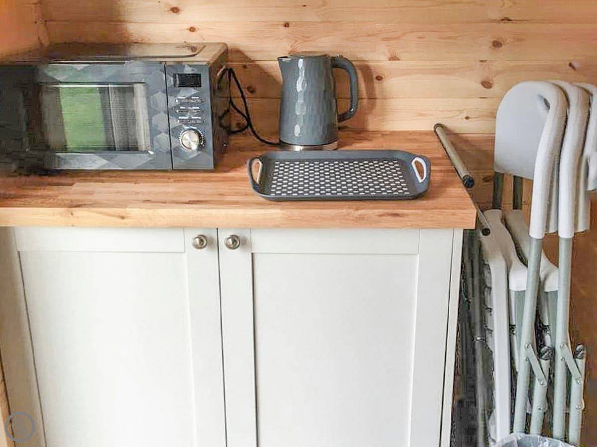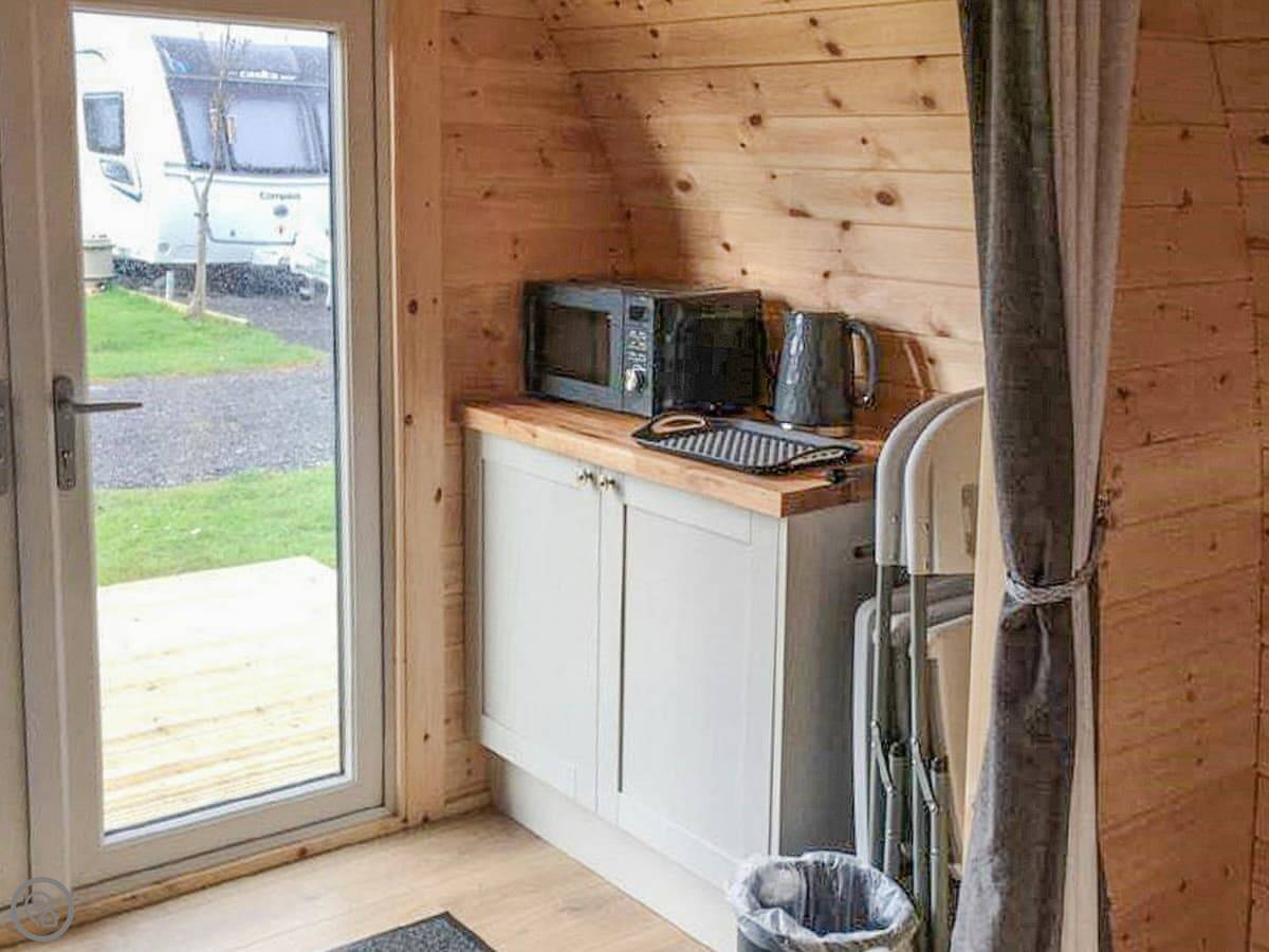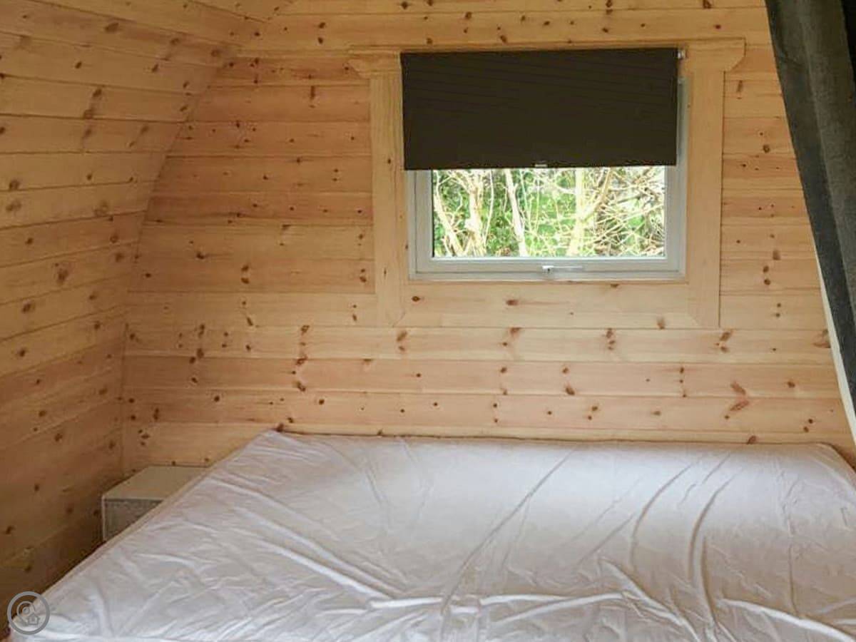 It's really a comfortable base. The pod itself has a bedroom and a bathroom inside. The shower block for the whole site is just opposite if you need it. You've got a private patio with a BBQ, and there's plenty of grass area around and a kids' play park on site.