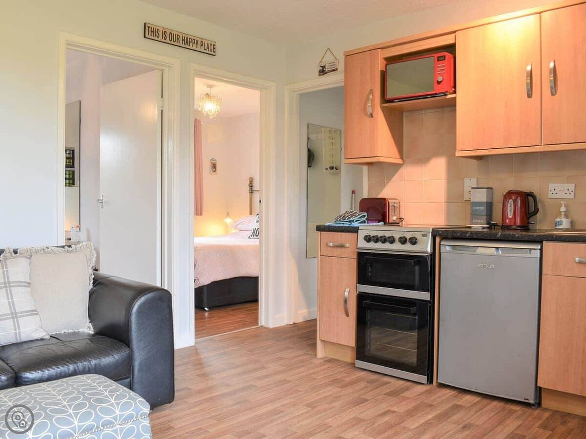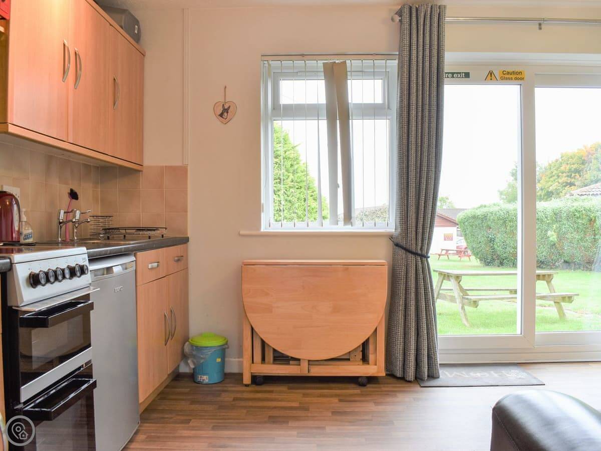 You walk in through the patio doors straight into the main living area. It's all open plan: kitchen, dining table, and a corner sofa with a TV. The kitchen has the usual stuff. There's parking right outside.