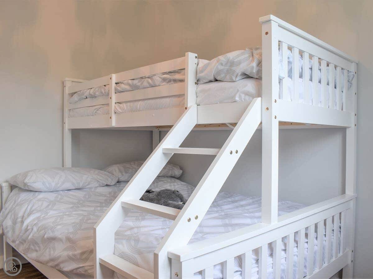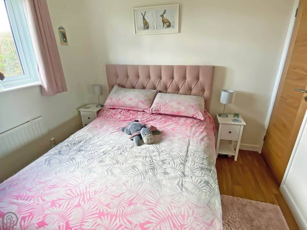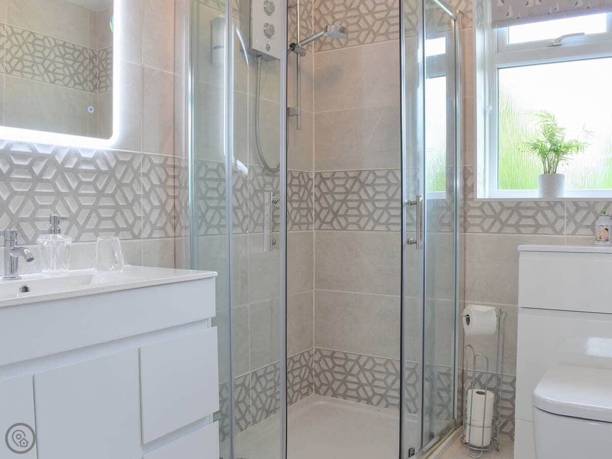 It sleeps four. Two bedrooms, one has a kingsize bed and the other has two singles. One bathroom with a shower cubicle. It's got a 3 Star rating, so it's clean and has what you need, but don't expect anything fancy. There are grab rails in the bathroom.