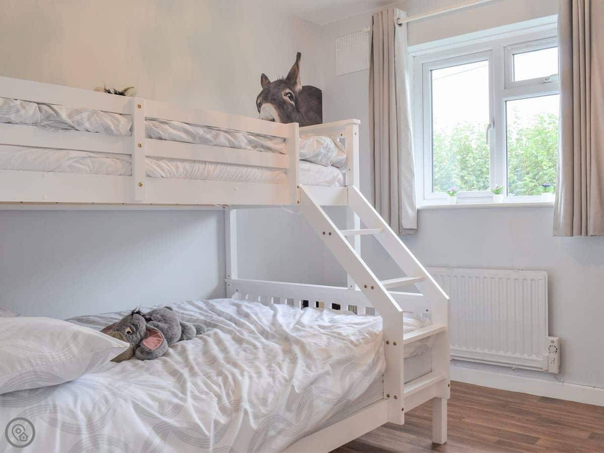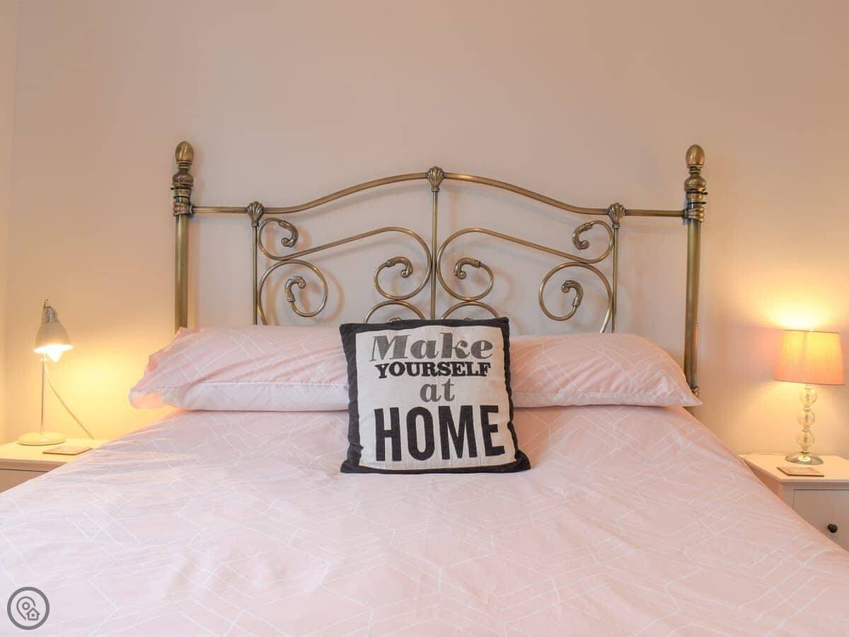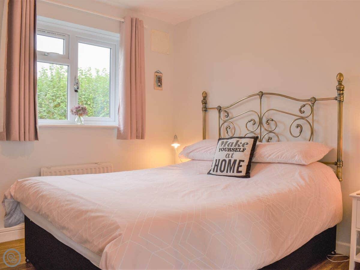 It sleeps four. Two bedrooms, one has a kingsize bed and the other has two singles. One bathroom with a shower cubicle. It's got a 3 Star rating, so it's clean and has what you need, but don't expect anything fancy. There are grab rails in the bathroom.