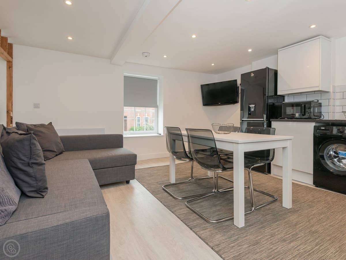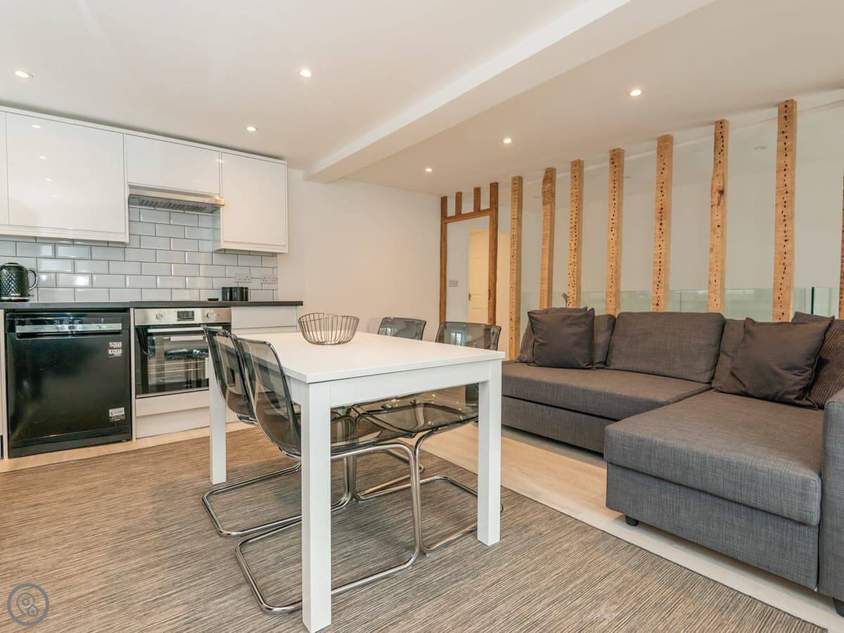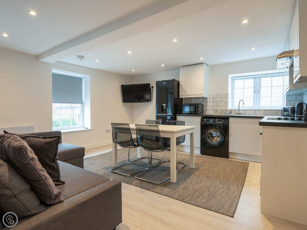 The space is open plan, so the living area, dining bit, and kitchen are all in one room. The kitchen is well-equipped if you want to cook. There's a dishwasher and a washing machine.