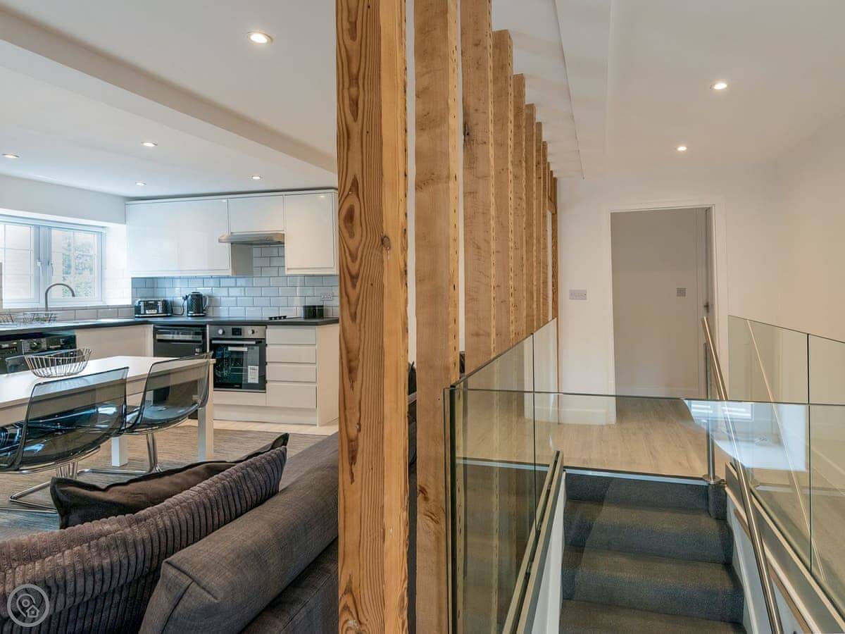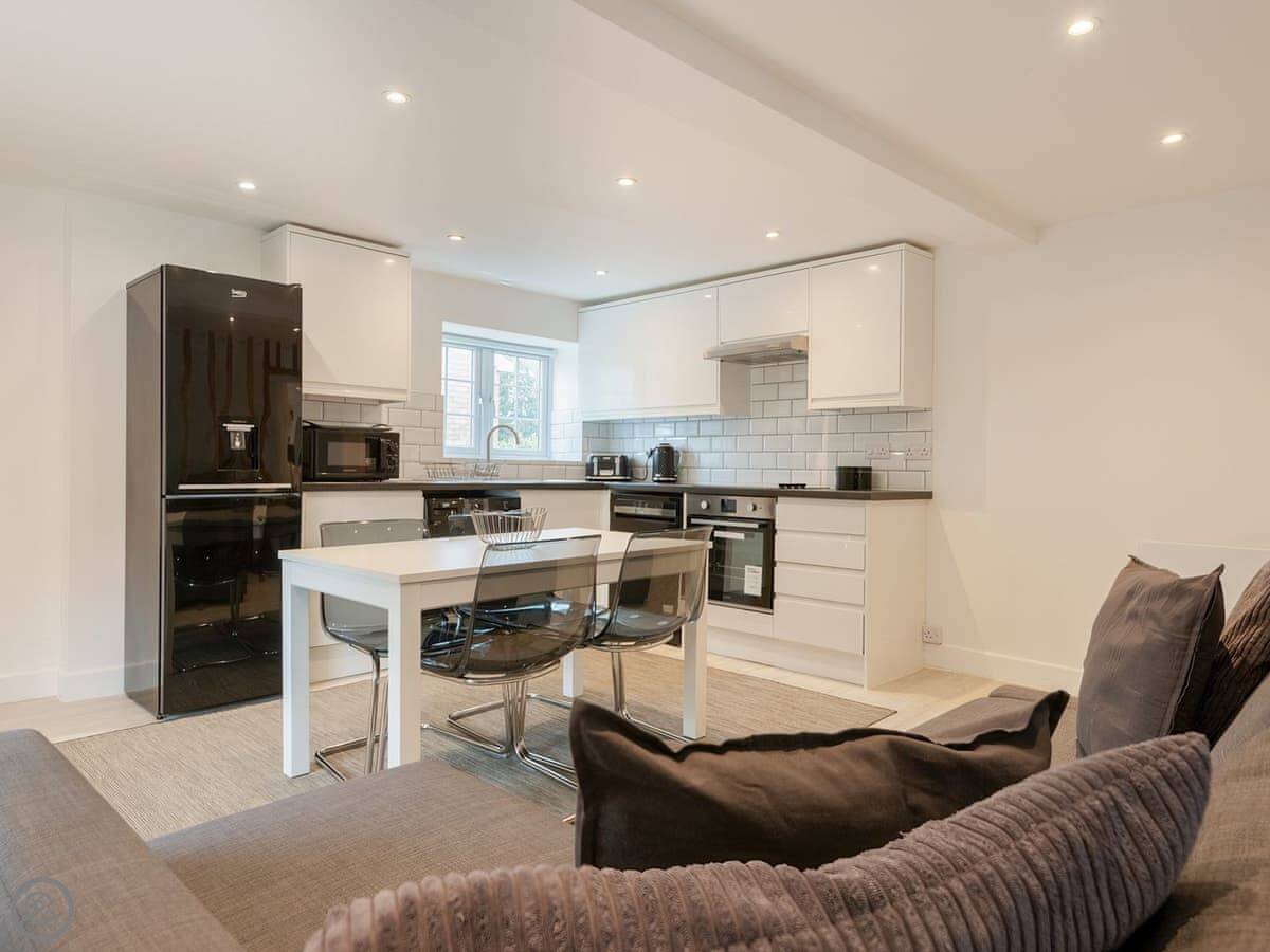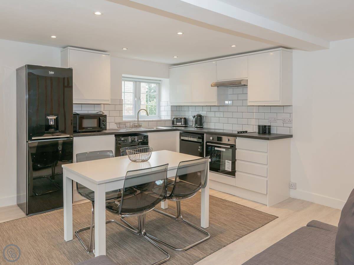The space is open plan, so the living area, dining bit, and kitchen are all in one room. The kitchen is well-equipped if you want to cook. There's a dishwasher and a washing machine.