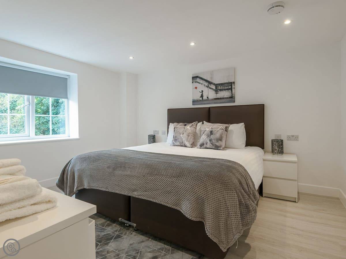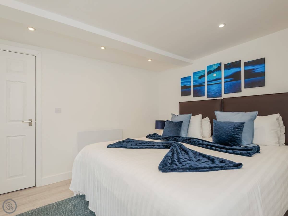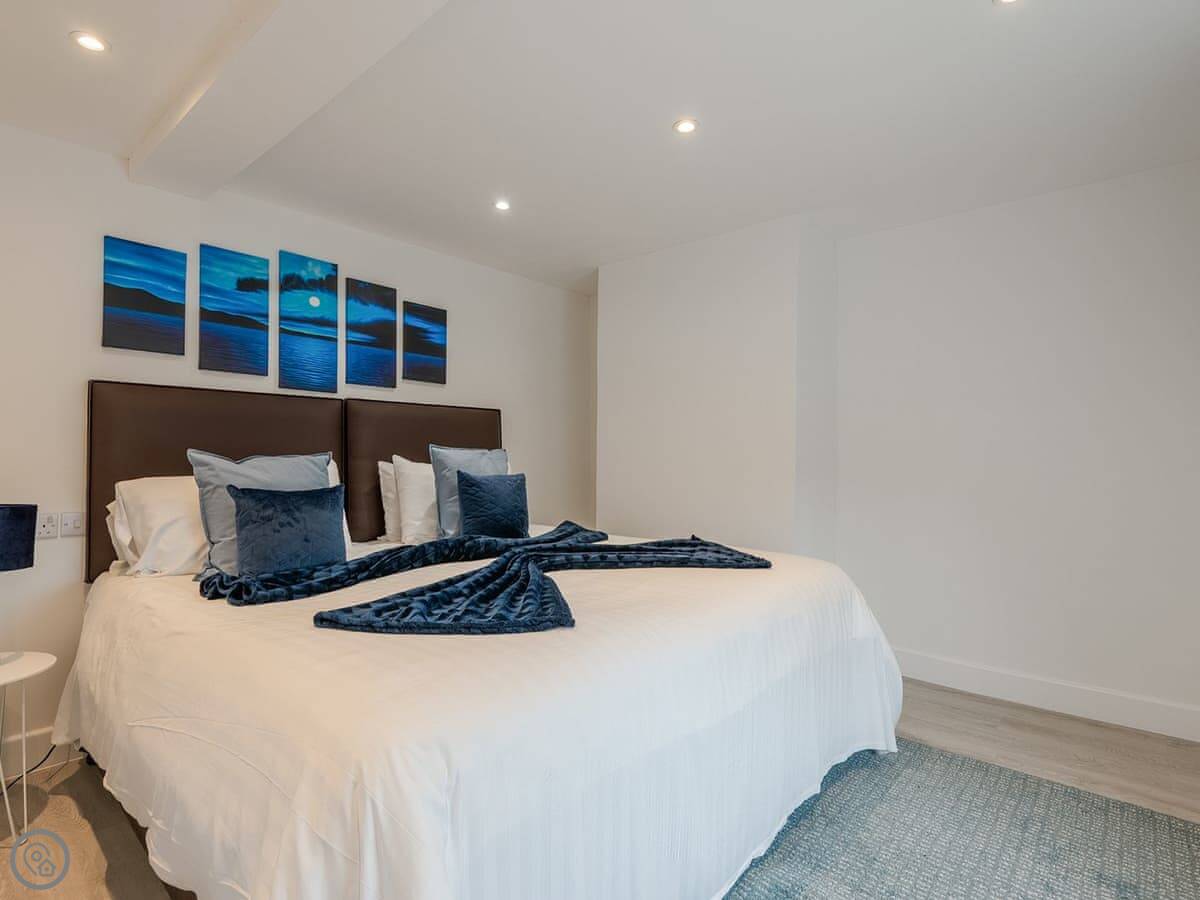 It sleeps four. There's one main bedroom with a super kingsize bed, and then a sofa bed in the living space. There's one bathroom with a walk-in shower. It's got a 5 Star rating, which means it's well-finished and everything's in good order.