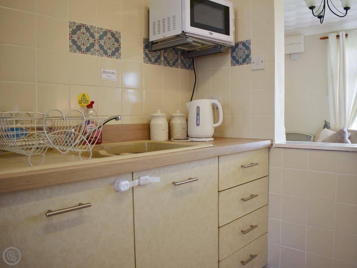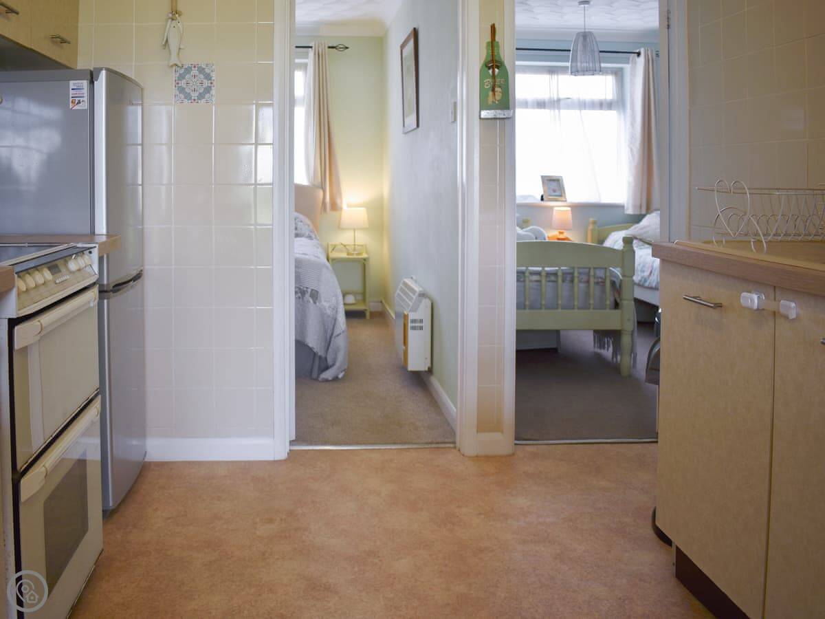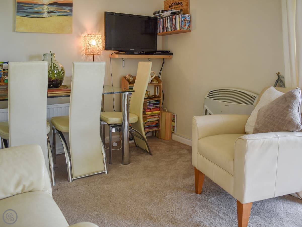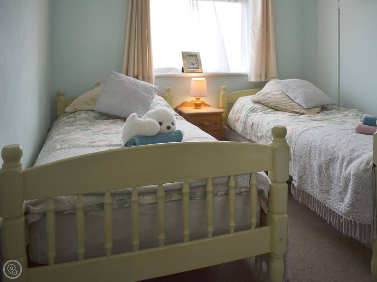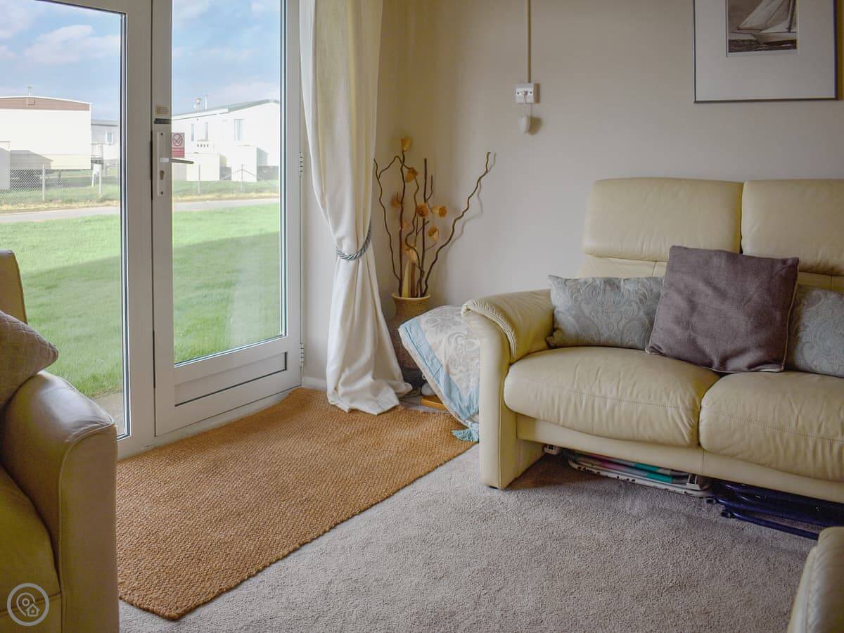 It sleeps four. Two bedrooms, one twin and one double, and one shower room. The whole place is on one level, which is handy. It's got a 4 Star rating. The front room has big windows, so it gets a lot of light.