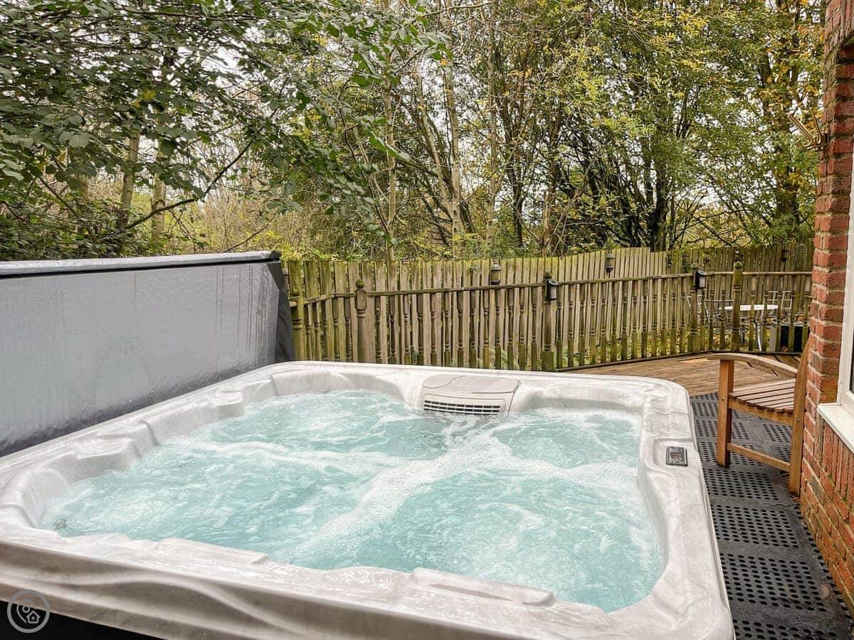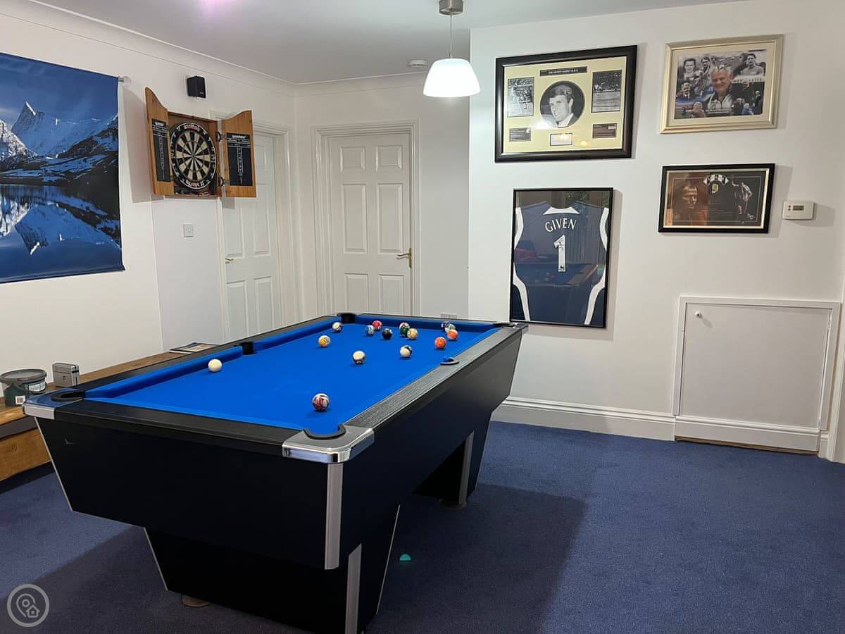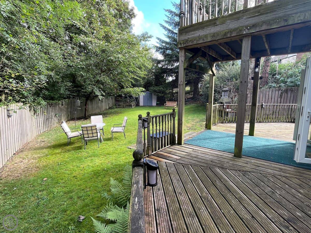 There's a full-sized pool table inside. Outside, there's a deck with a hot tub that looks out over the trees. The garden is big and fenced in. It gets the sun most of the day.