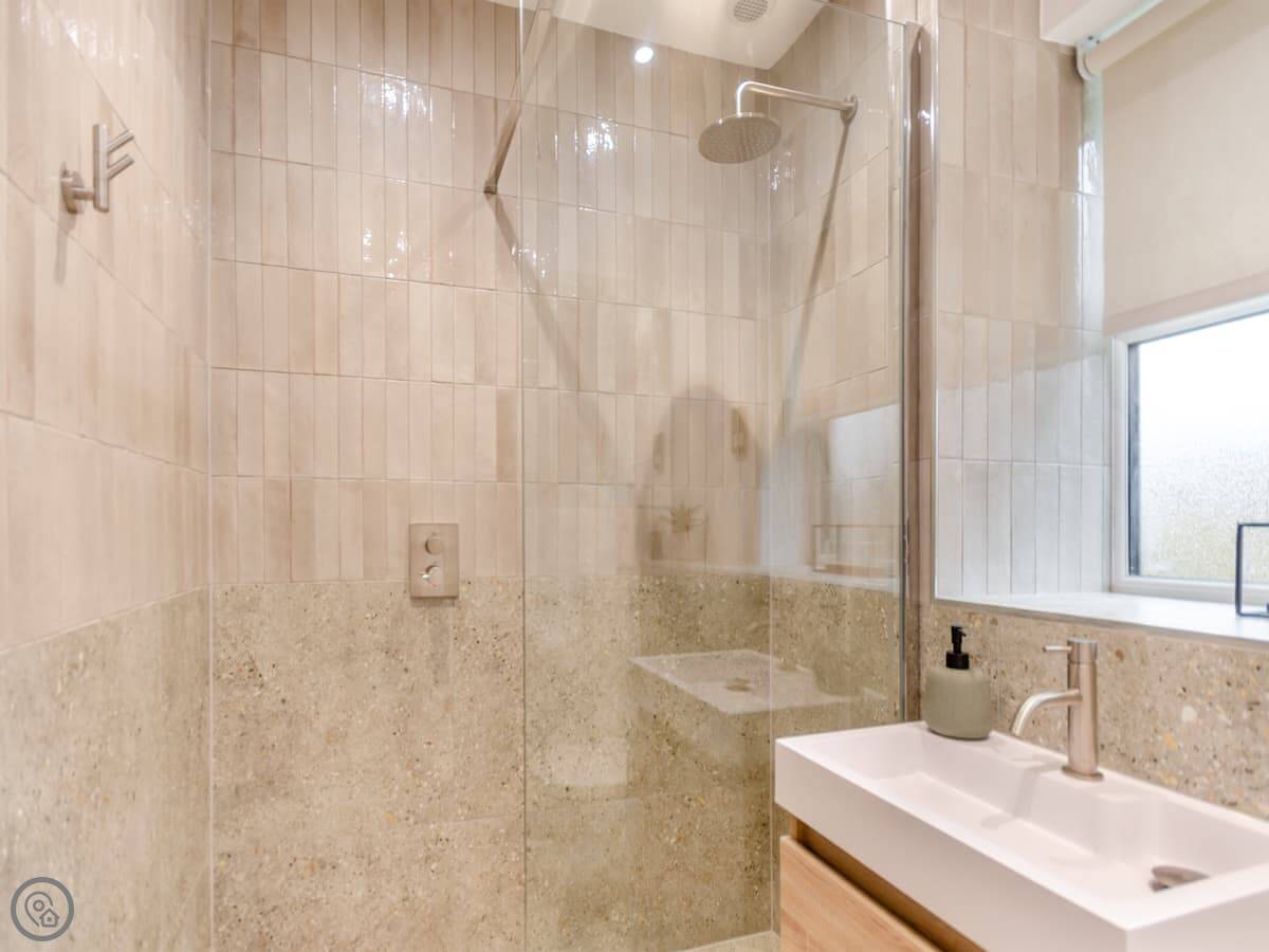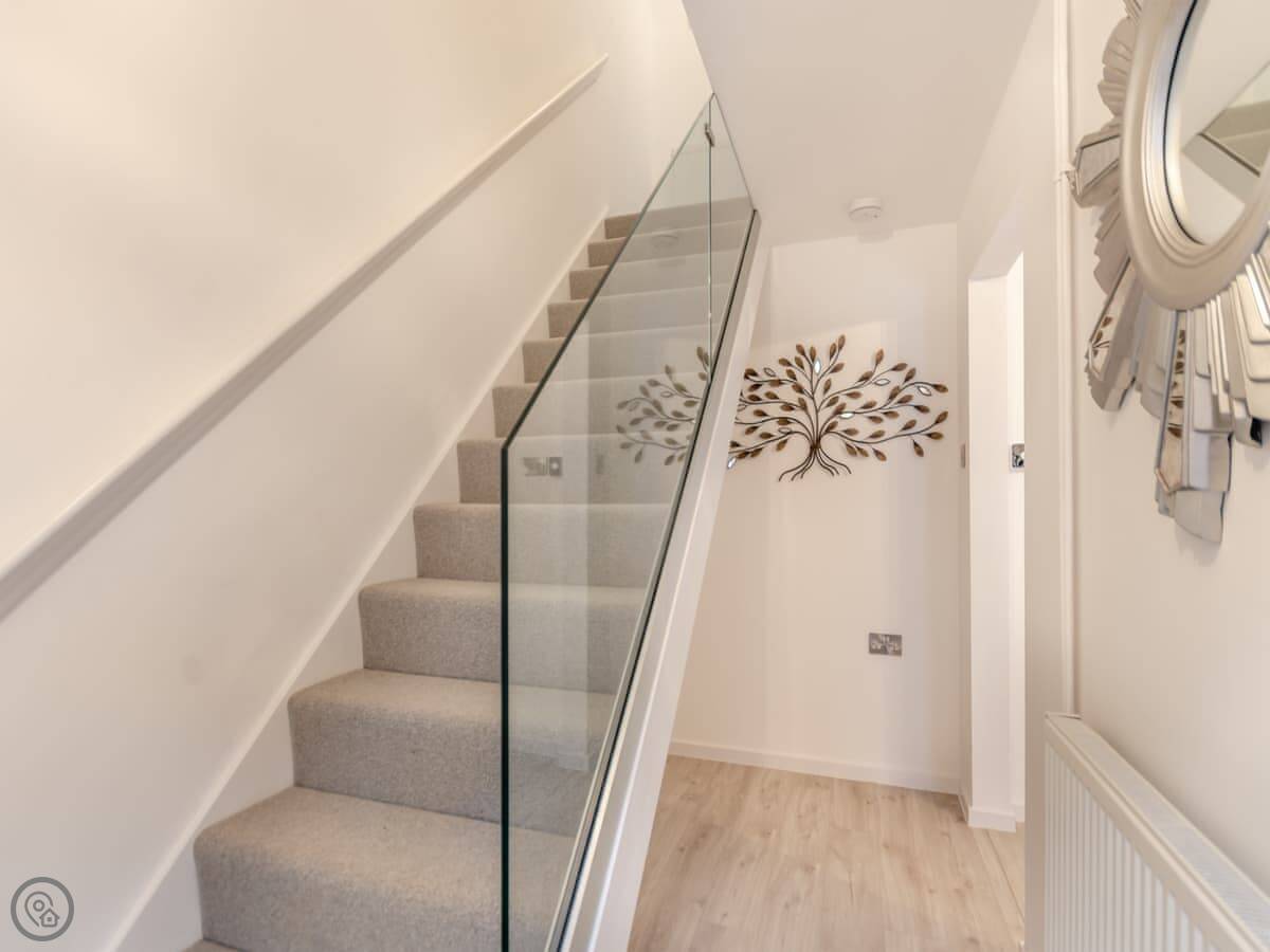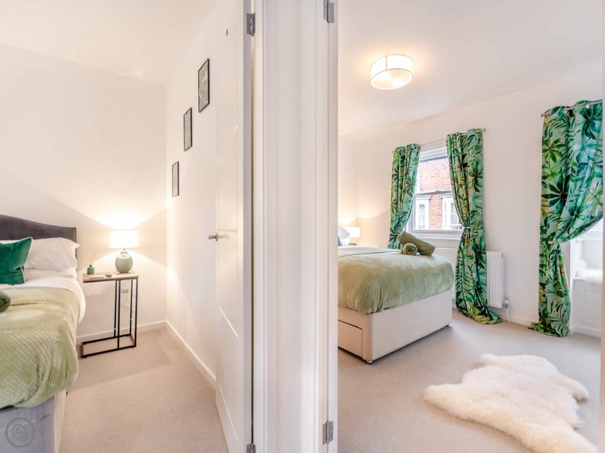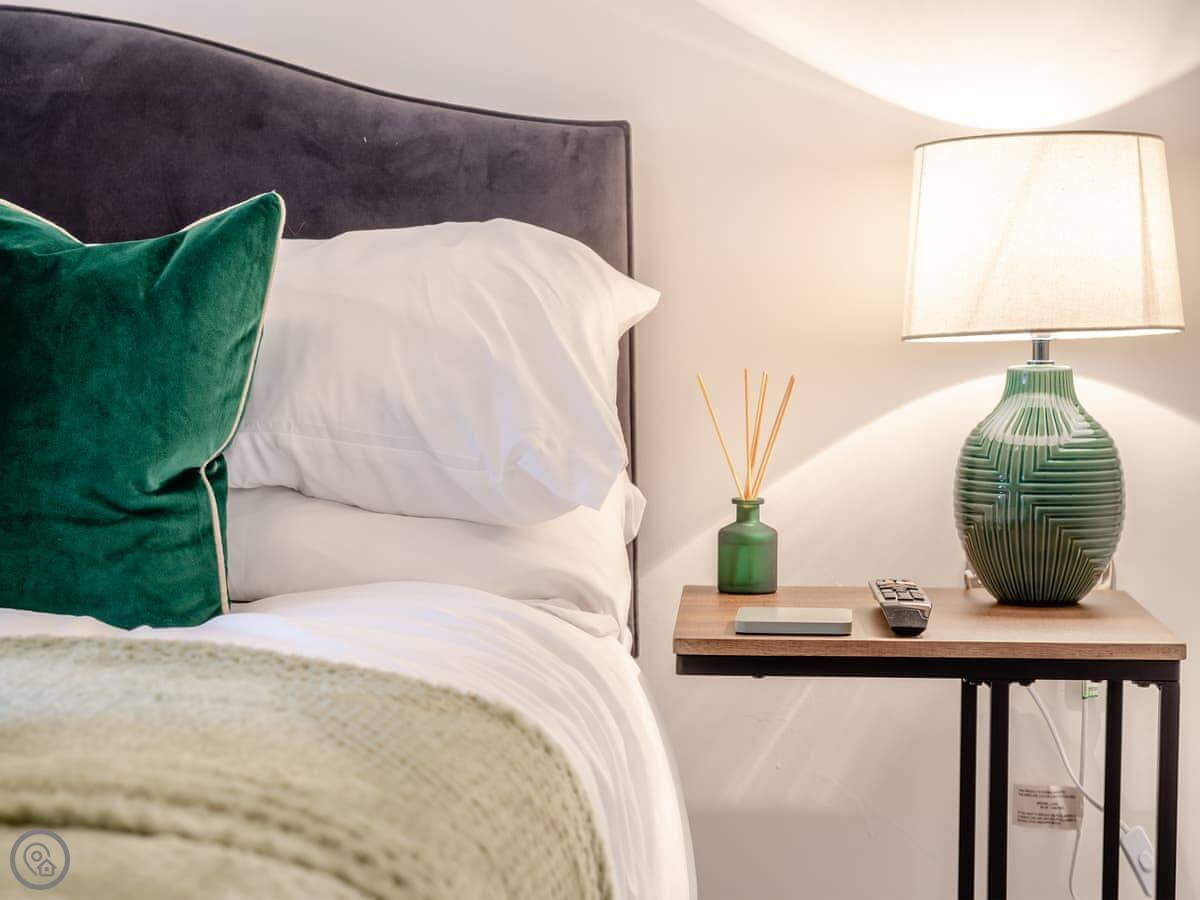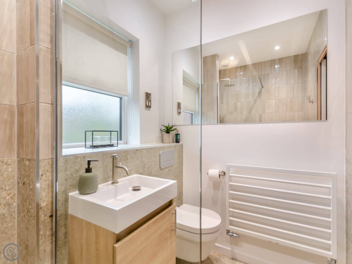 It sleeps four. Two bedrooms and one bathroom. It's got a 5 Star rating, which means it's been finished to a high standard. Everything's new and works properly. The parking is on site, which is a big help round here.