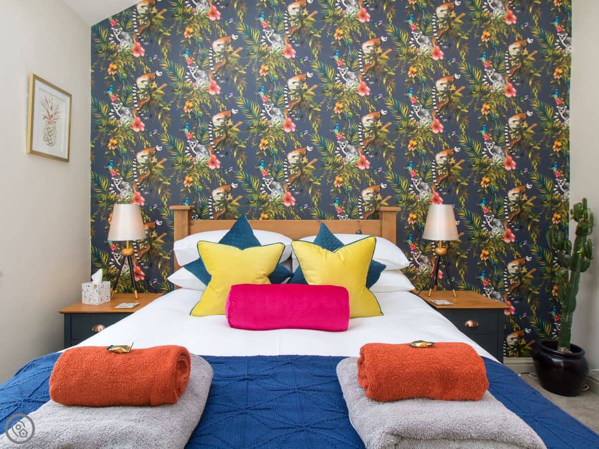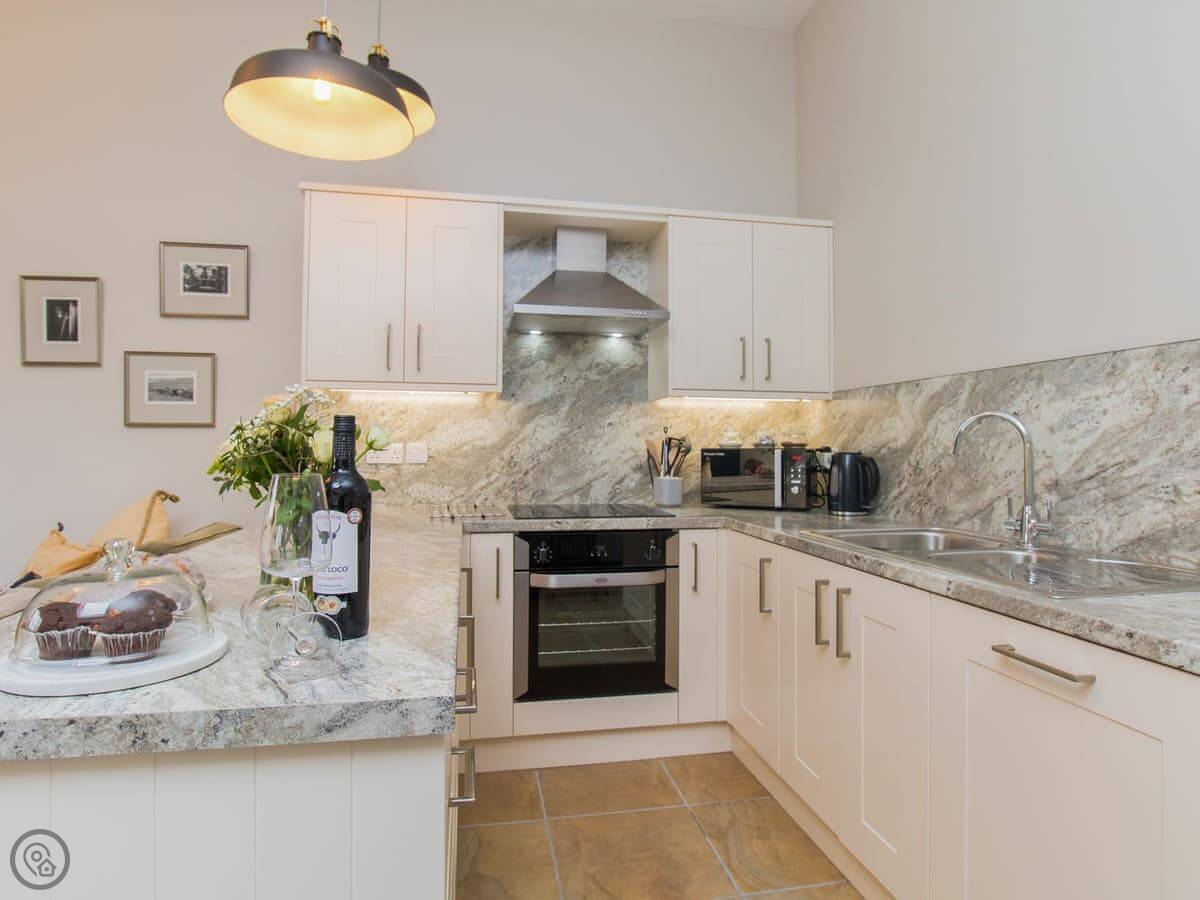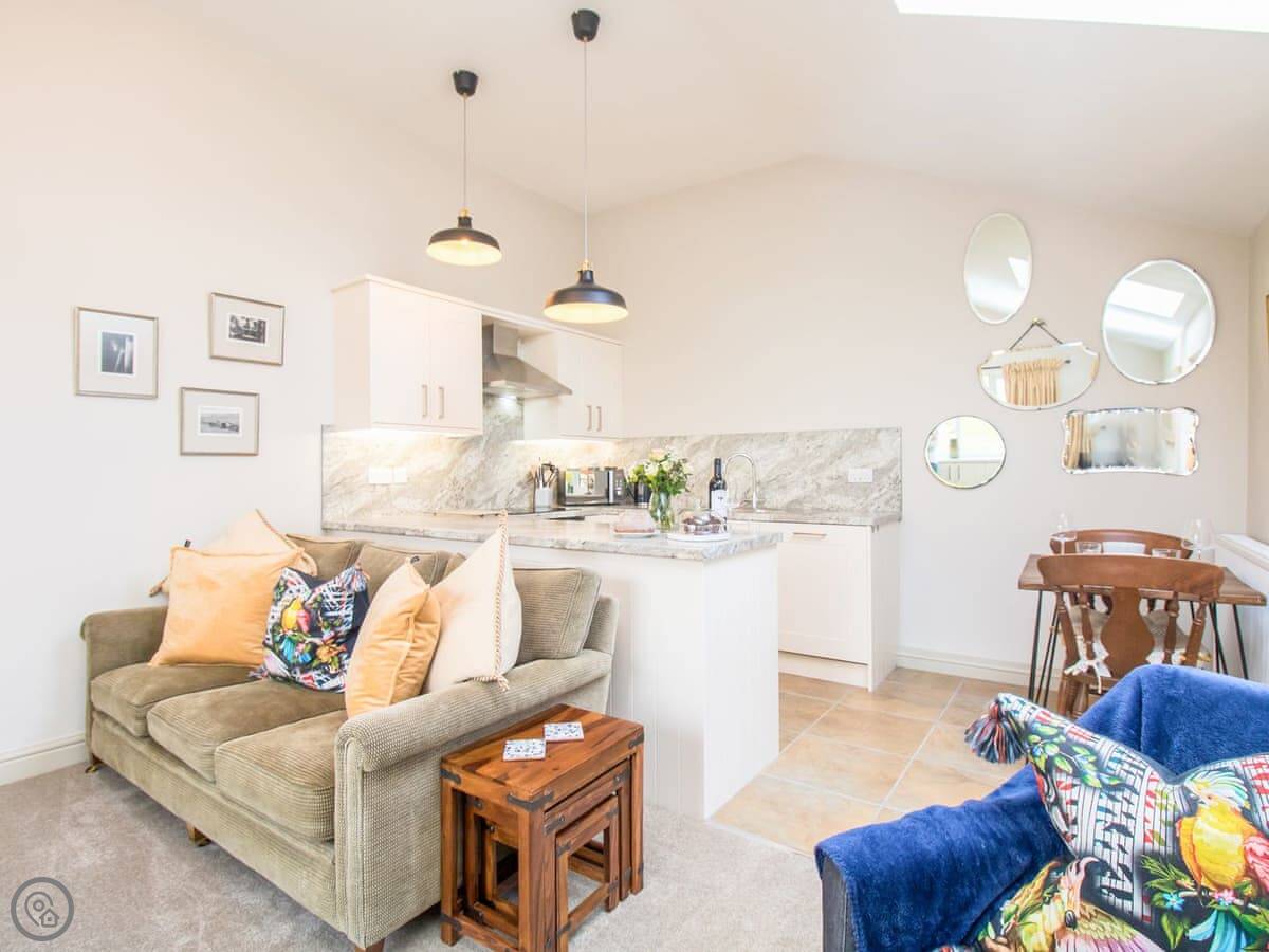 It's got one bedroom and one bathroom, and a 4 Star rating. It's clean and comfortable. The main room is open plan, with the kitchen, a table, and the sofa all together. There's a big window so it feels light. It's compact but it's got everything you need.
