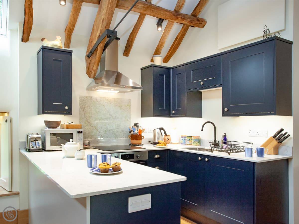 Everything's on one floor upstairs: kitchen, living area, dining table. It's open plan. The kitchen is new. There's a wood burner but it's electric, just so you know. It gives off a good heat. There's a Smart TV and WiFi.