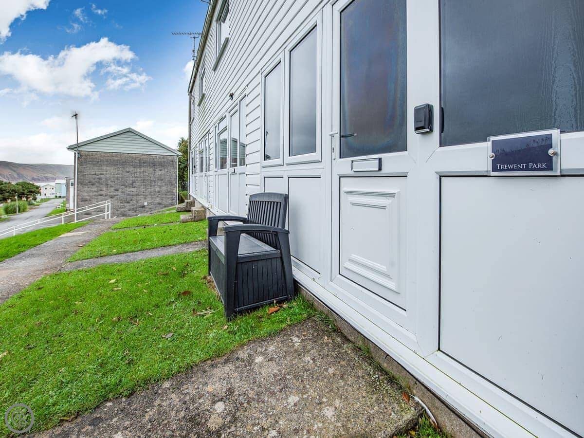 Outside, there's a small seating area out the back and a bigger lawn out the front. The front bit gets the sun in the afternoon. You can walk down to Freshwater East beach from here. It's a big sandy beach. There's a pub in the village that does food, and the holiday village itself has a restaurant and bar.