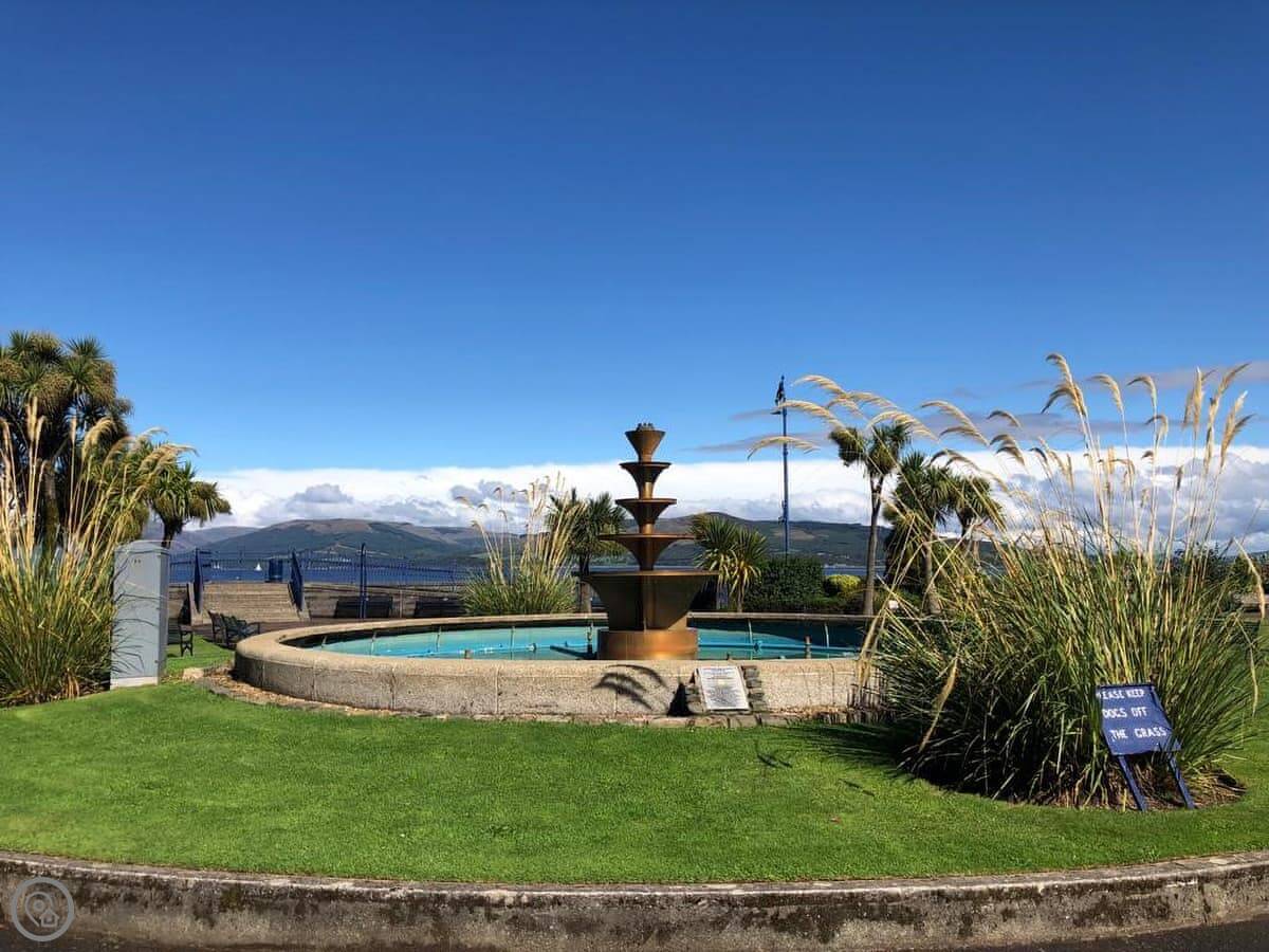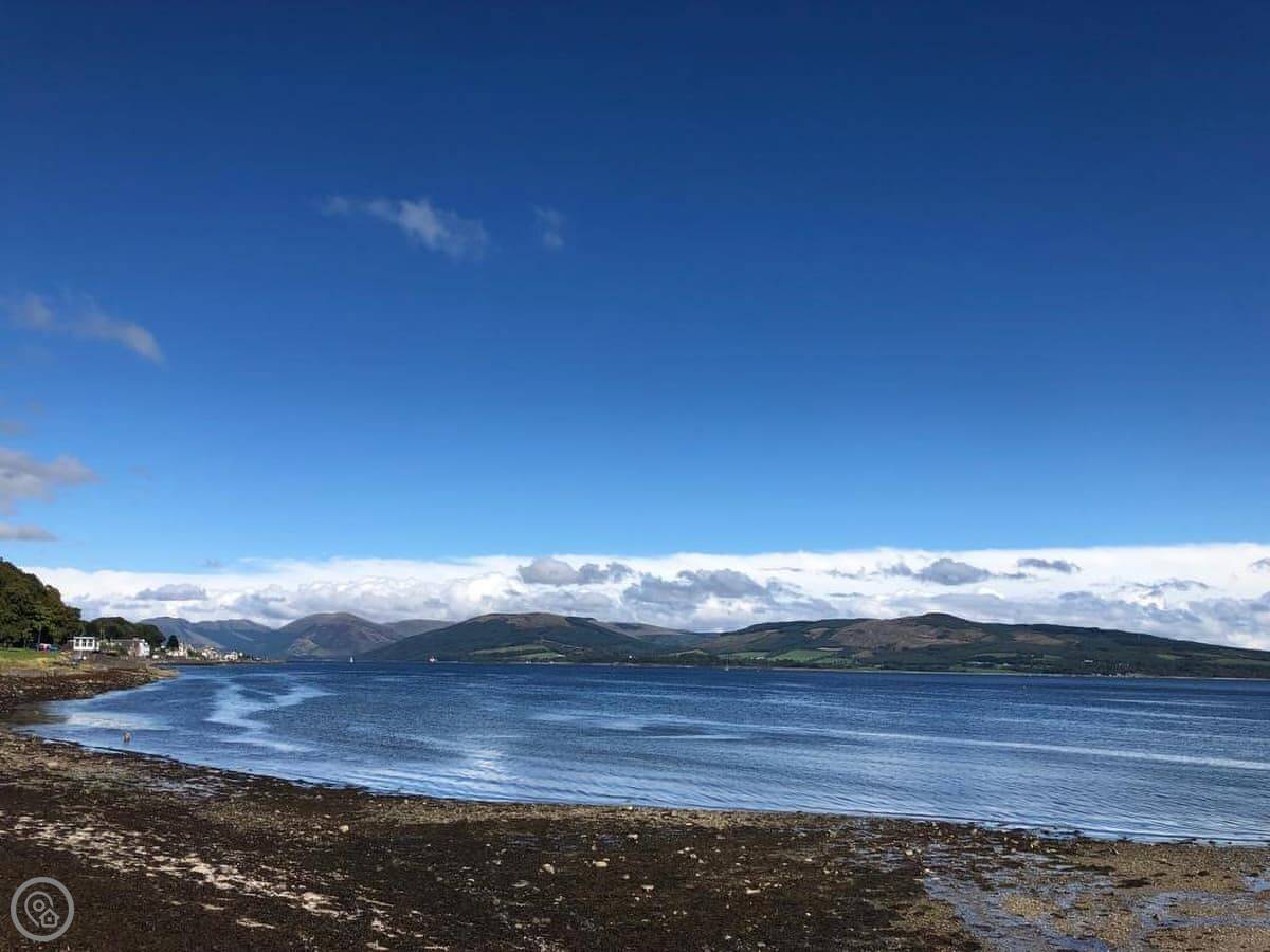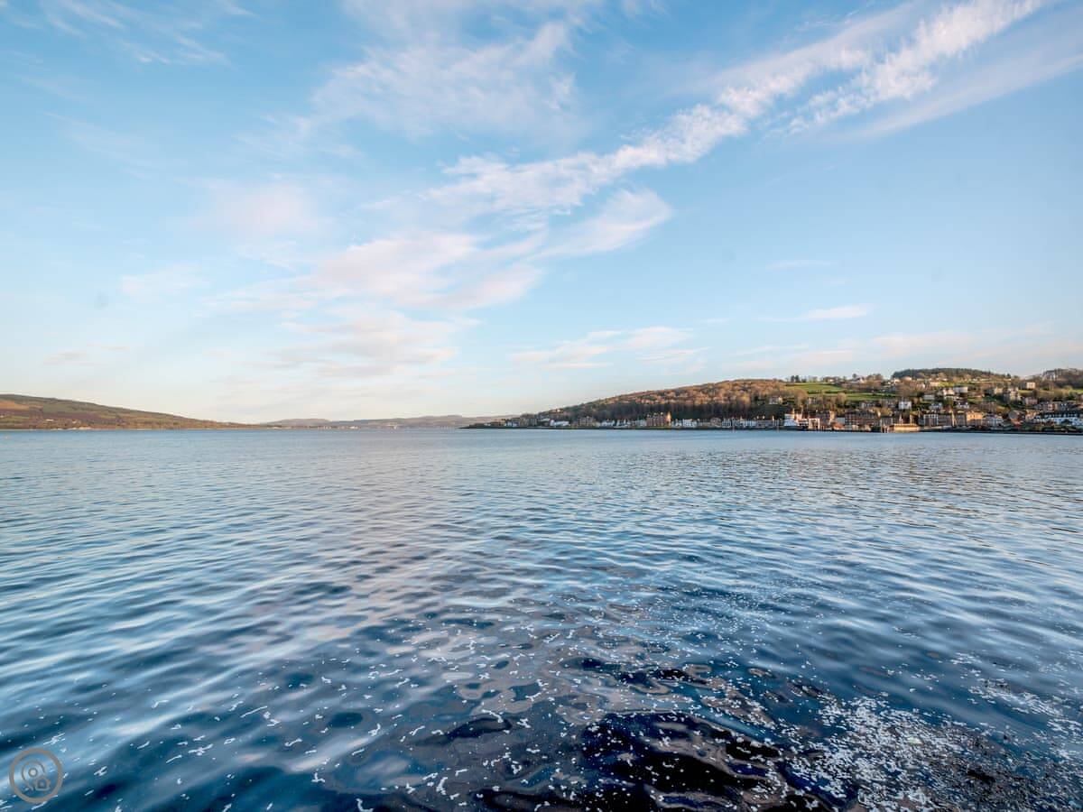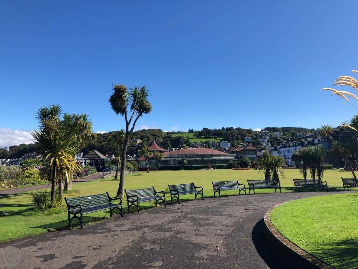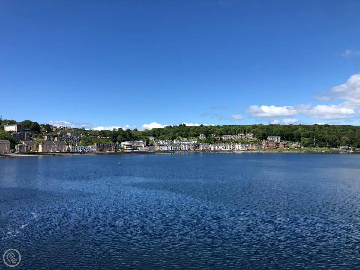 You’re about a minute’s walk from the seafront promenade. The town’s shops, pubs, and places to eat are all a short walk away. Rothesay is interesting, it’s got a bit of a faded seaside charm with palm trees and a castle ruin.