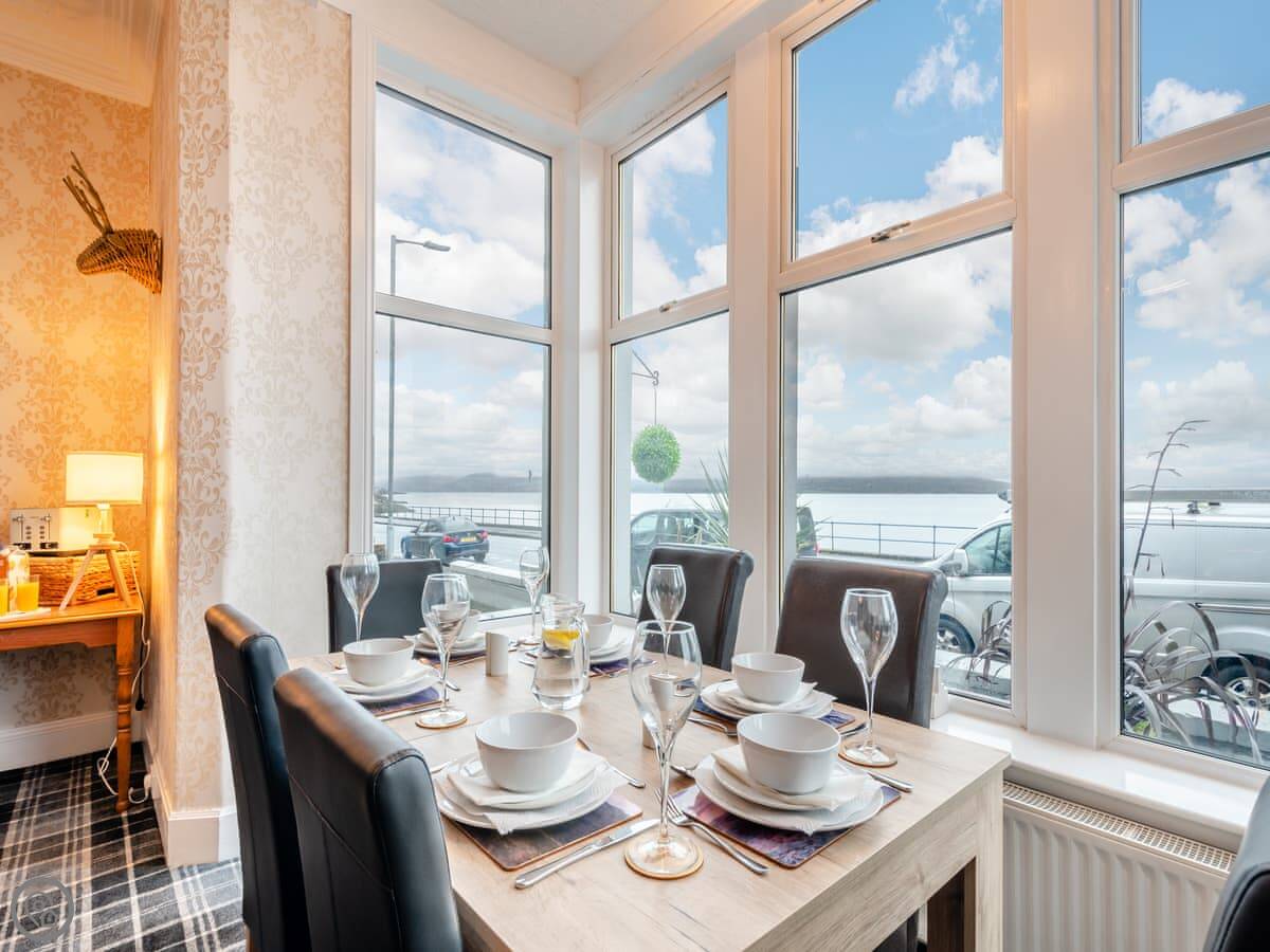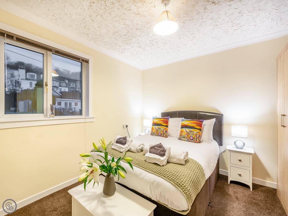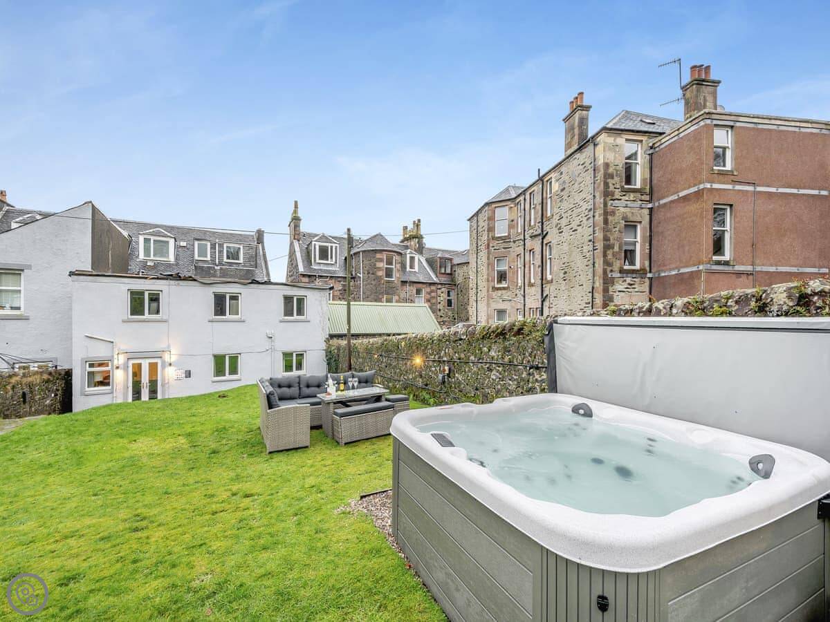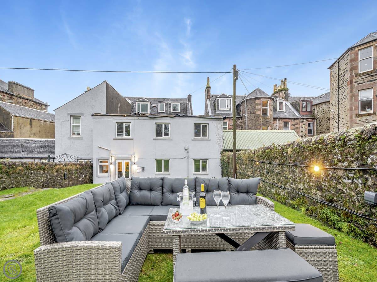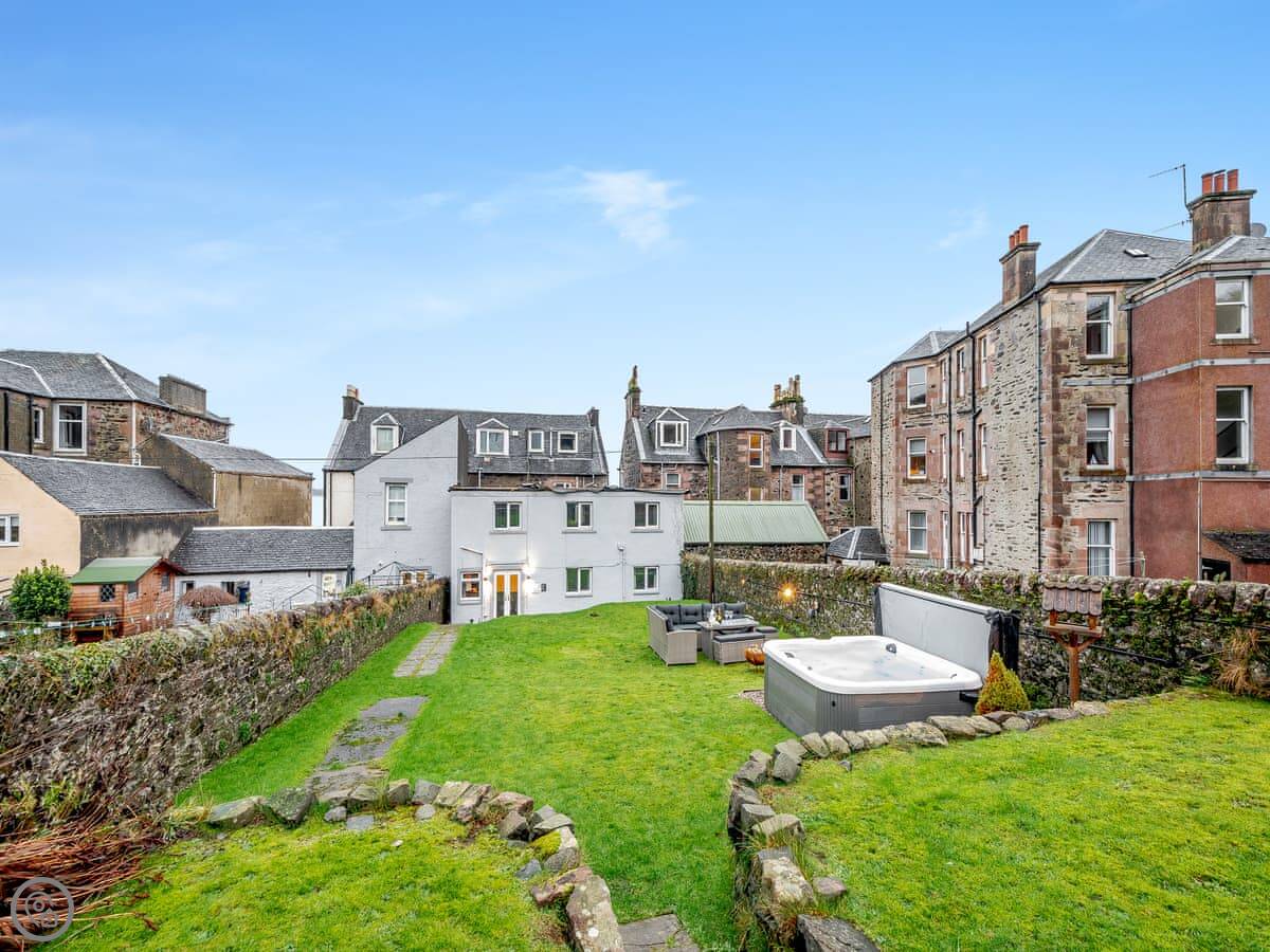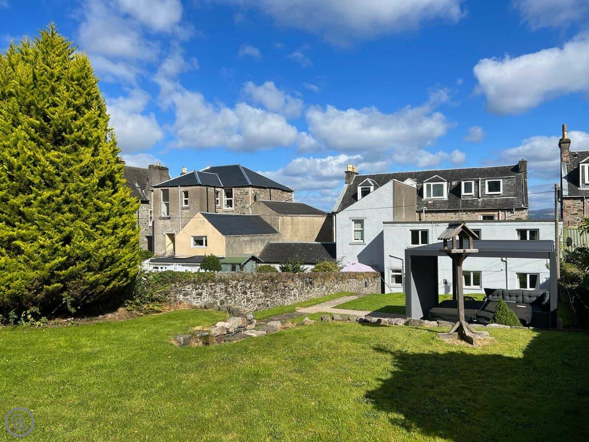You’re about a minute’s walk from the seafront promenade. The town’s shops, pubs, and places to eat are all a short walk away. Rothesay is interesting, it’s got a bit of a faded seaside charm with palm trees and a castle ruin.