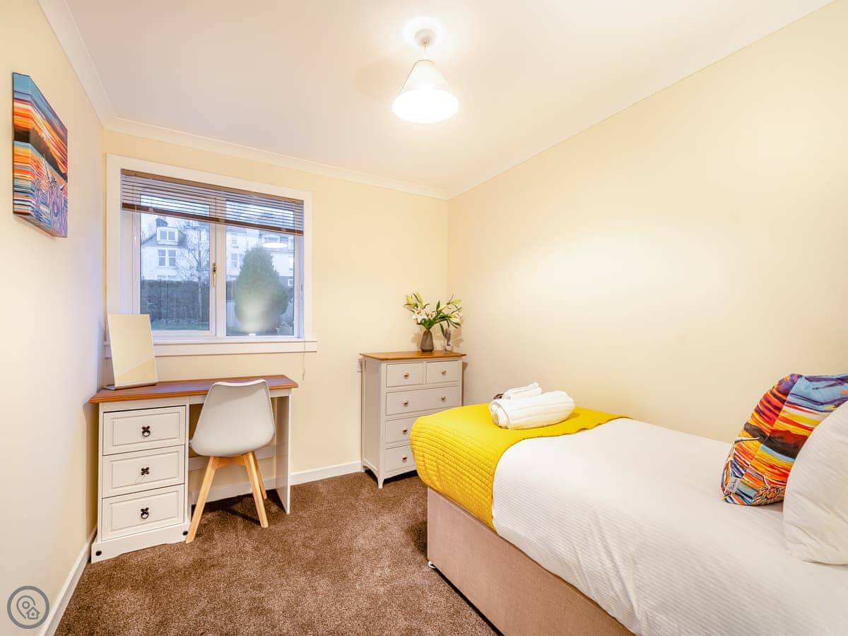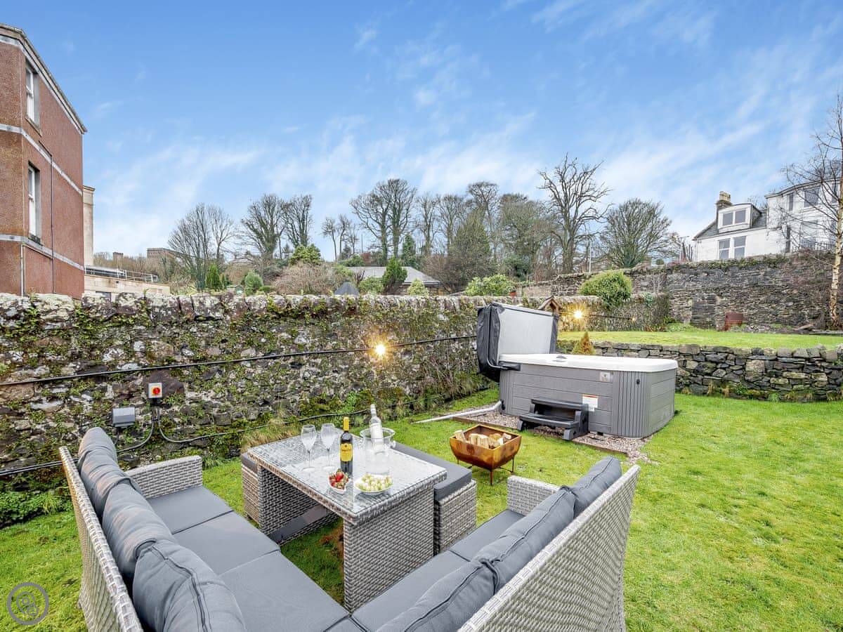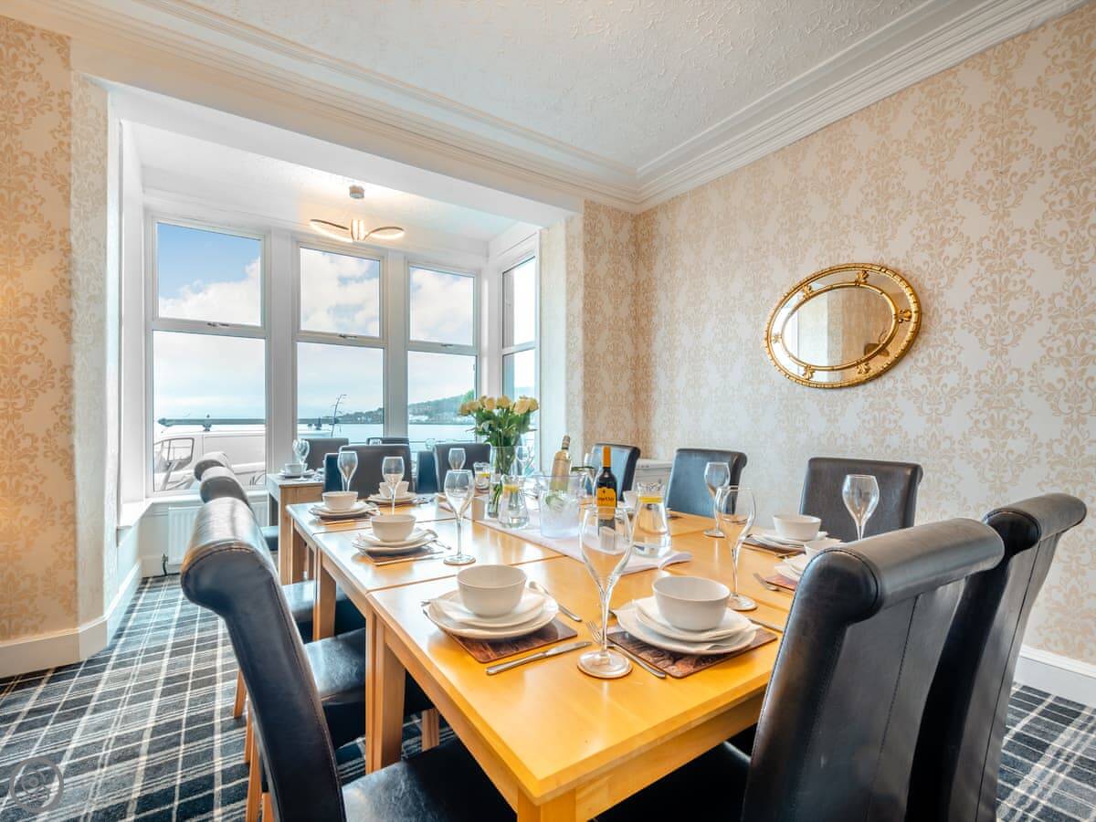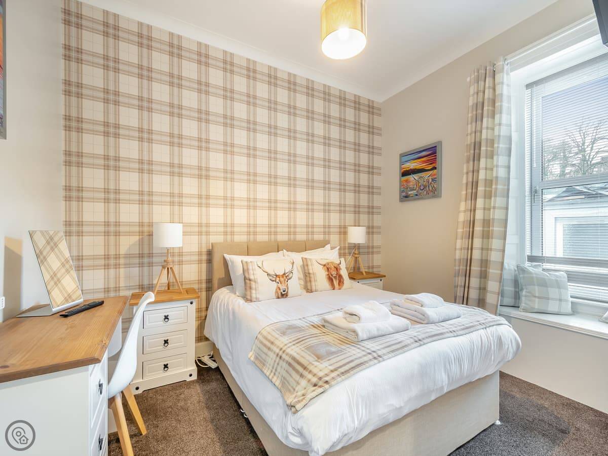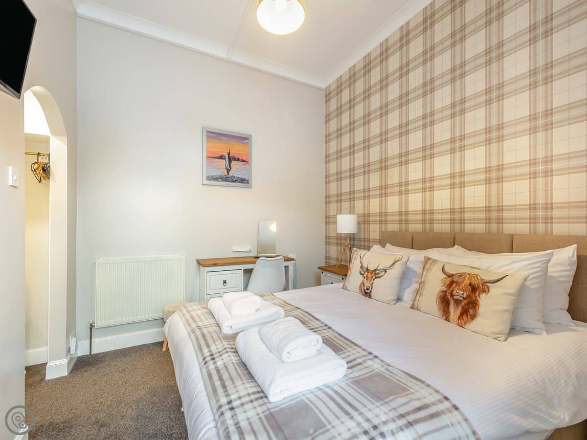 You’re about a minute’s walk from the seafront promenade. The town’s shops, pubs, and places to eat are all a short walk away. Rothesay is interesting, it’s got a bit of a faded seaside charm with palm trees and a castle ruin.
