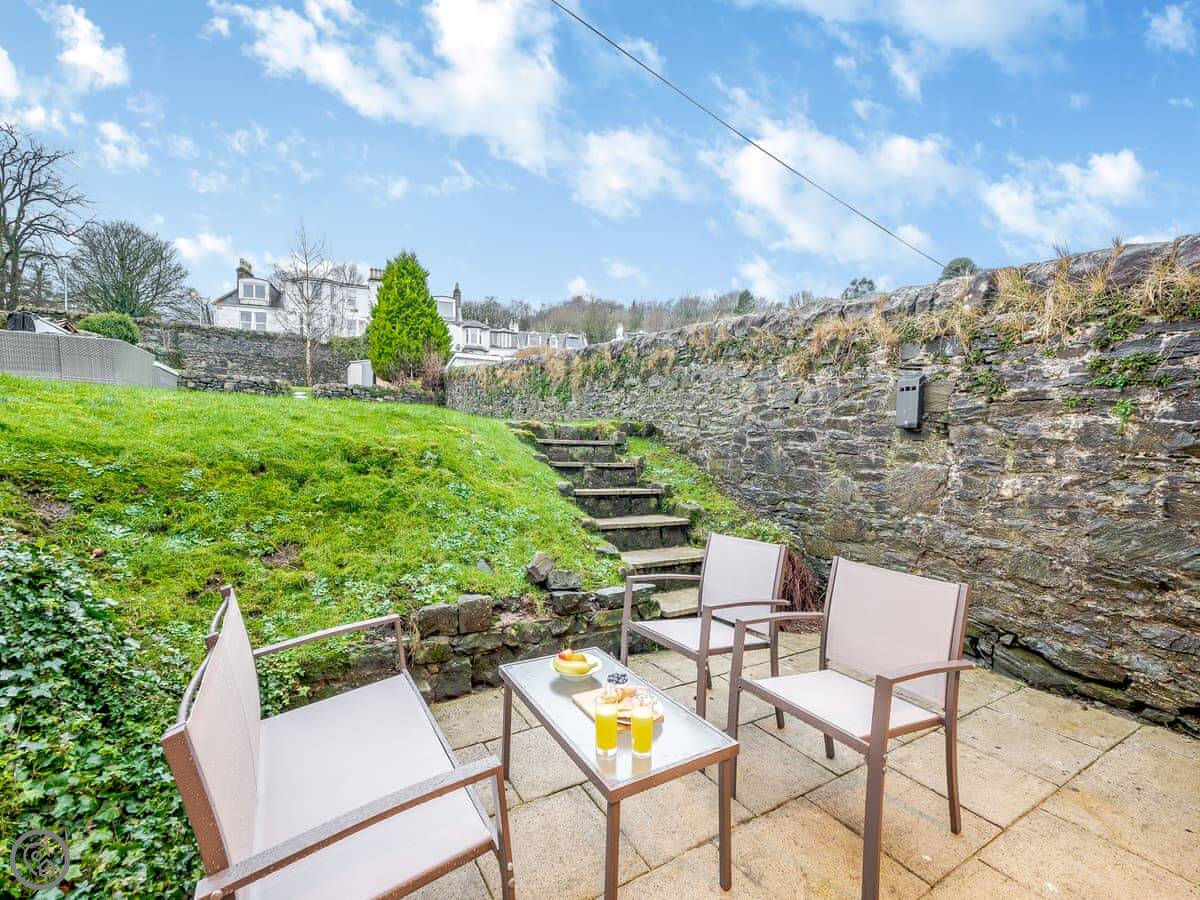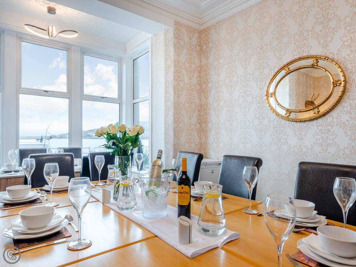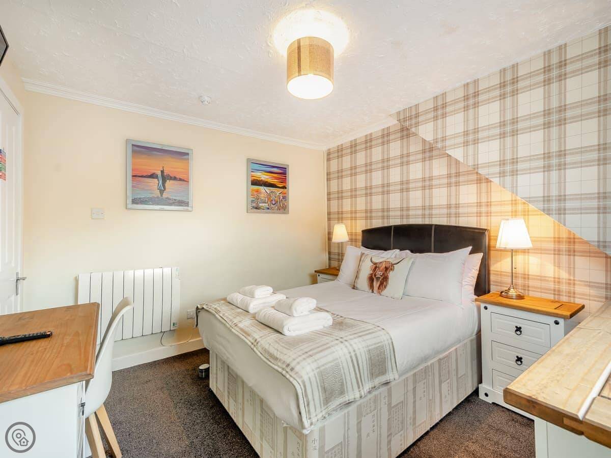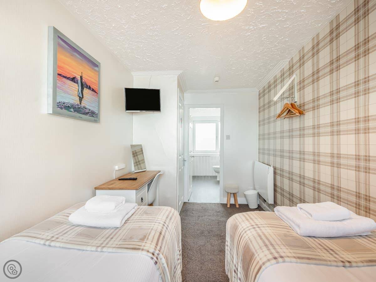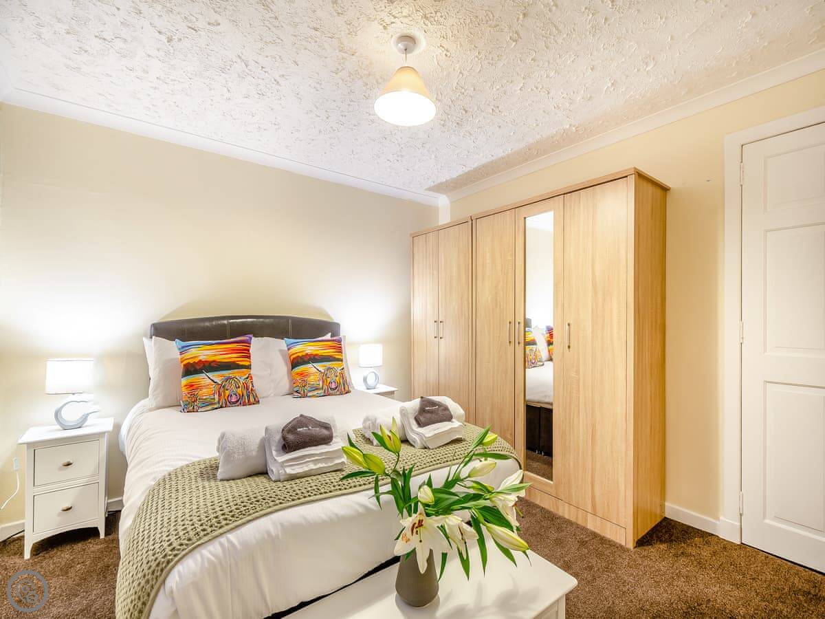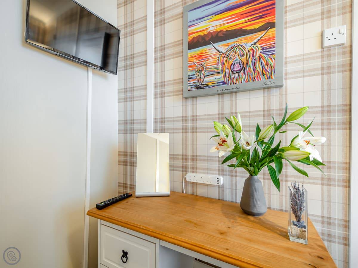 You’re about a minute’s walk from the seafront promenade. The town’s shops, pubs, and places to eat are all a short walk away. Rothesay is interesting, it’s got a bit of a faded seaside charm with palm trees and a castle ruin.