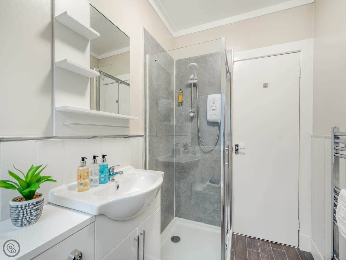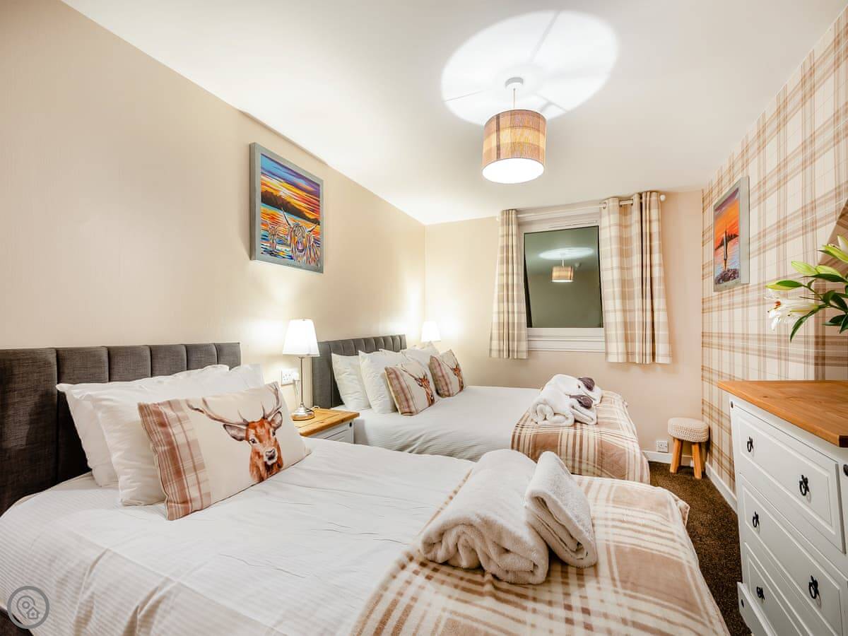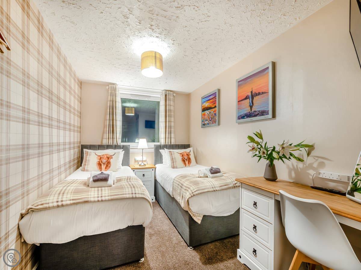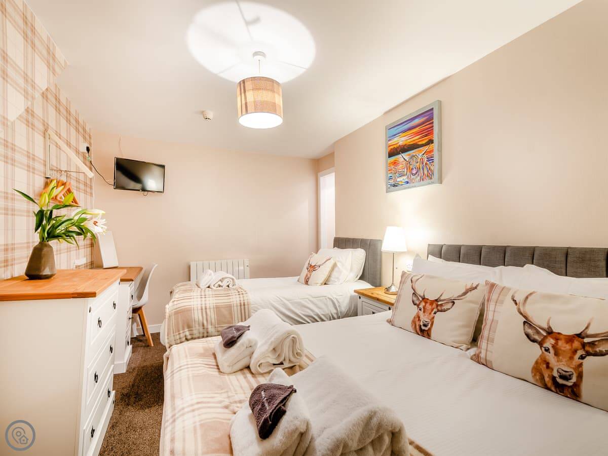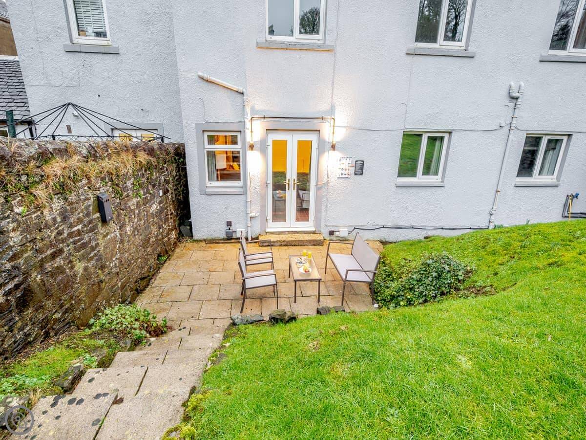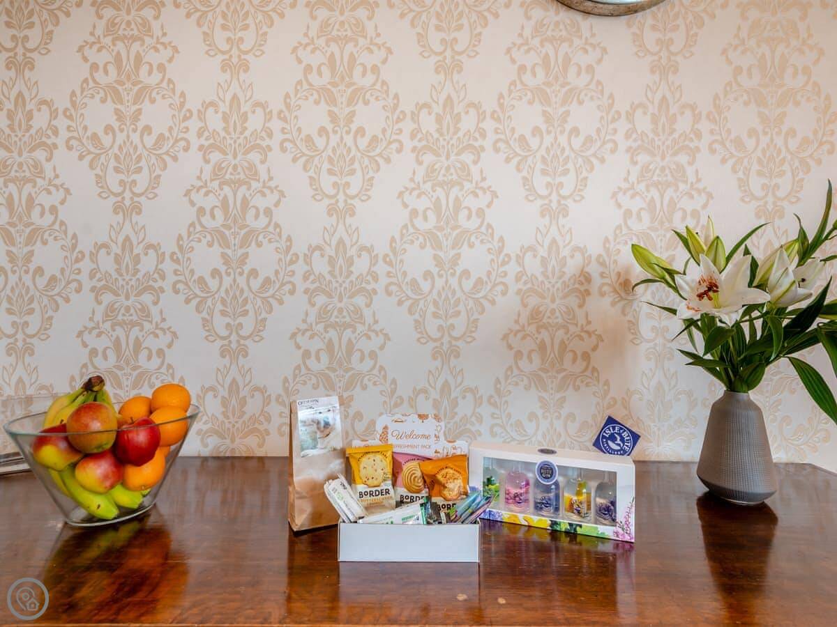 You’re about a minute’s walk from the seafront promenade. The town’s shops, pubs, and places to eat are all a short walk away. Rothesay is interesting, it’s got a bit of a faded seaside charm with palm trees and a castle ruin.