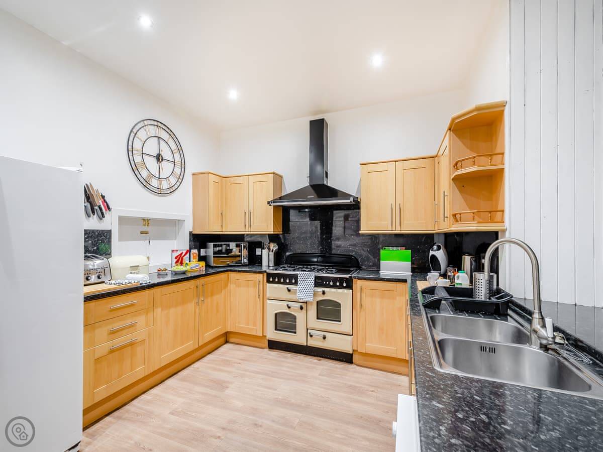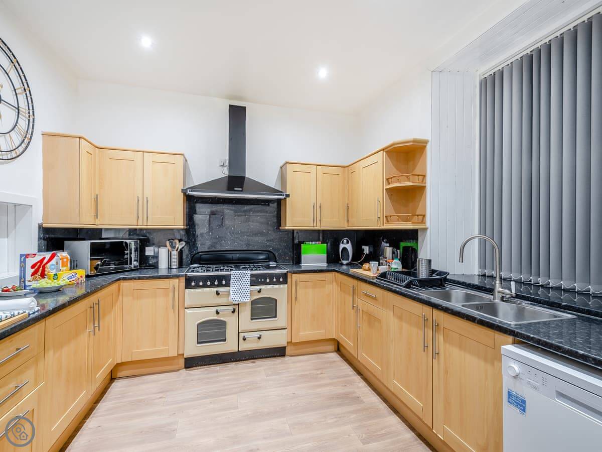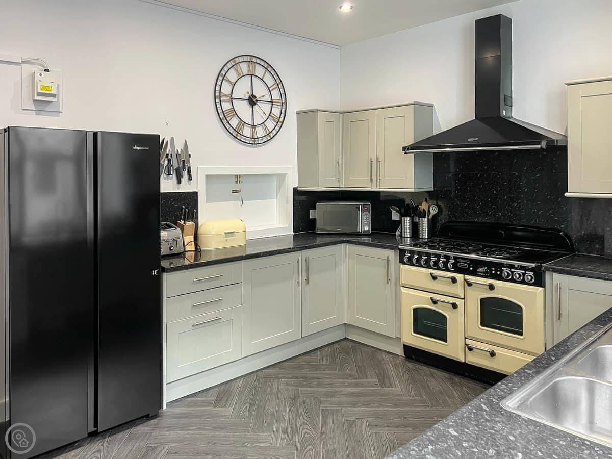 The house is split into a main house and an annexe, so it can feel like two separate spaces if you want. That’s useful with a big group. The kitchen is large, with two dishwashers and a decent range. The dining room has a big table that seats everyone.
