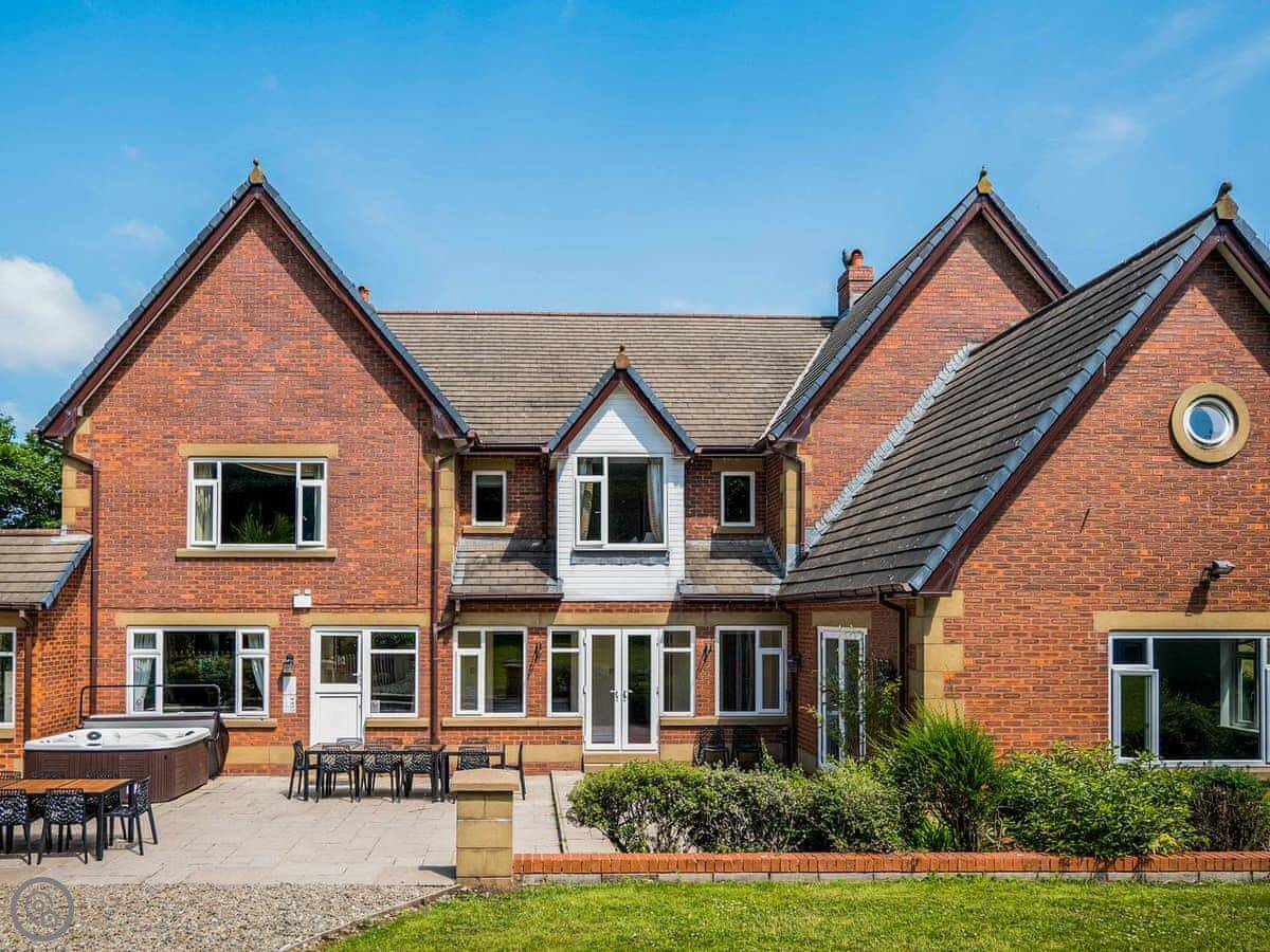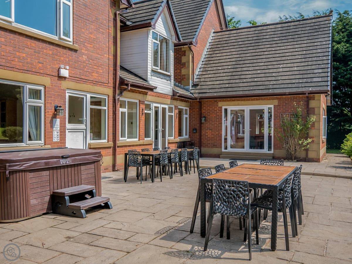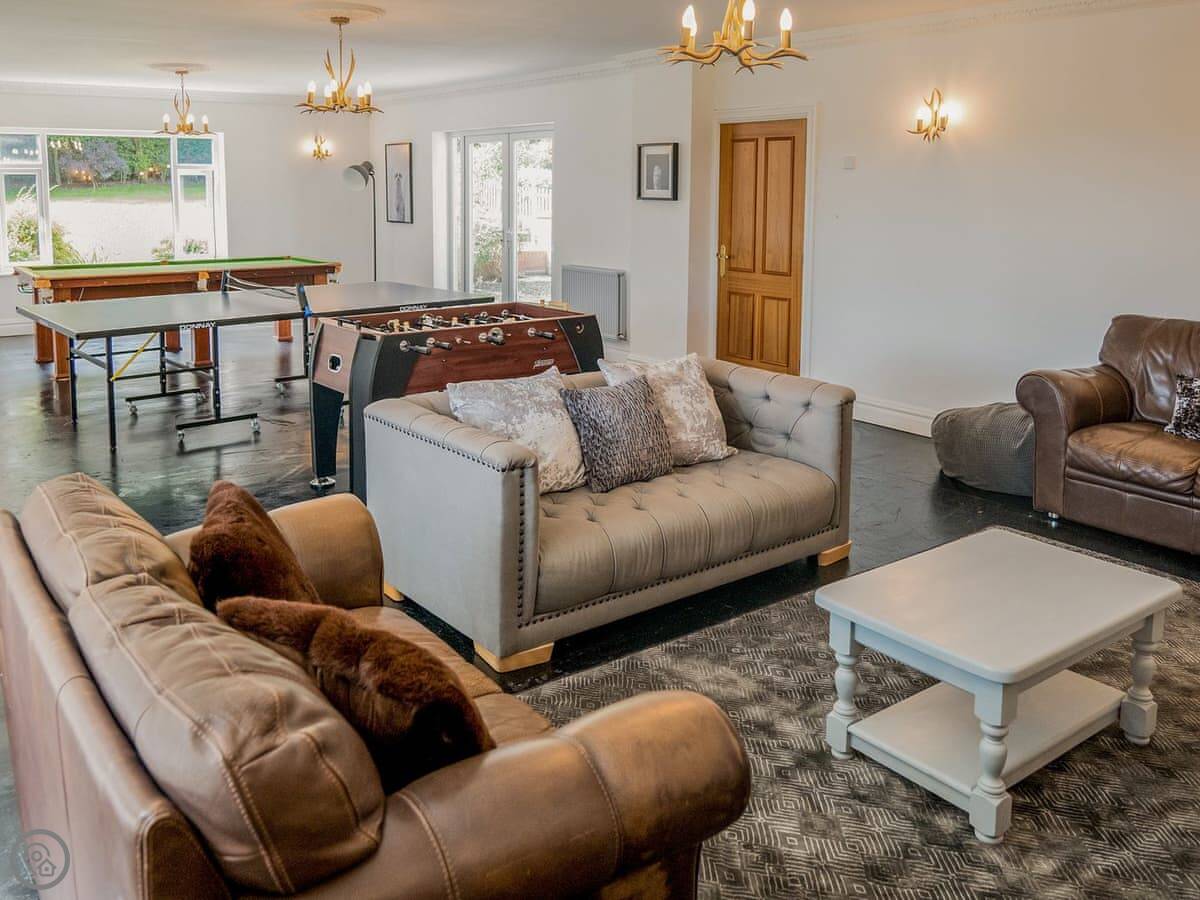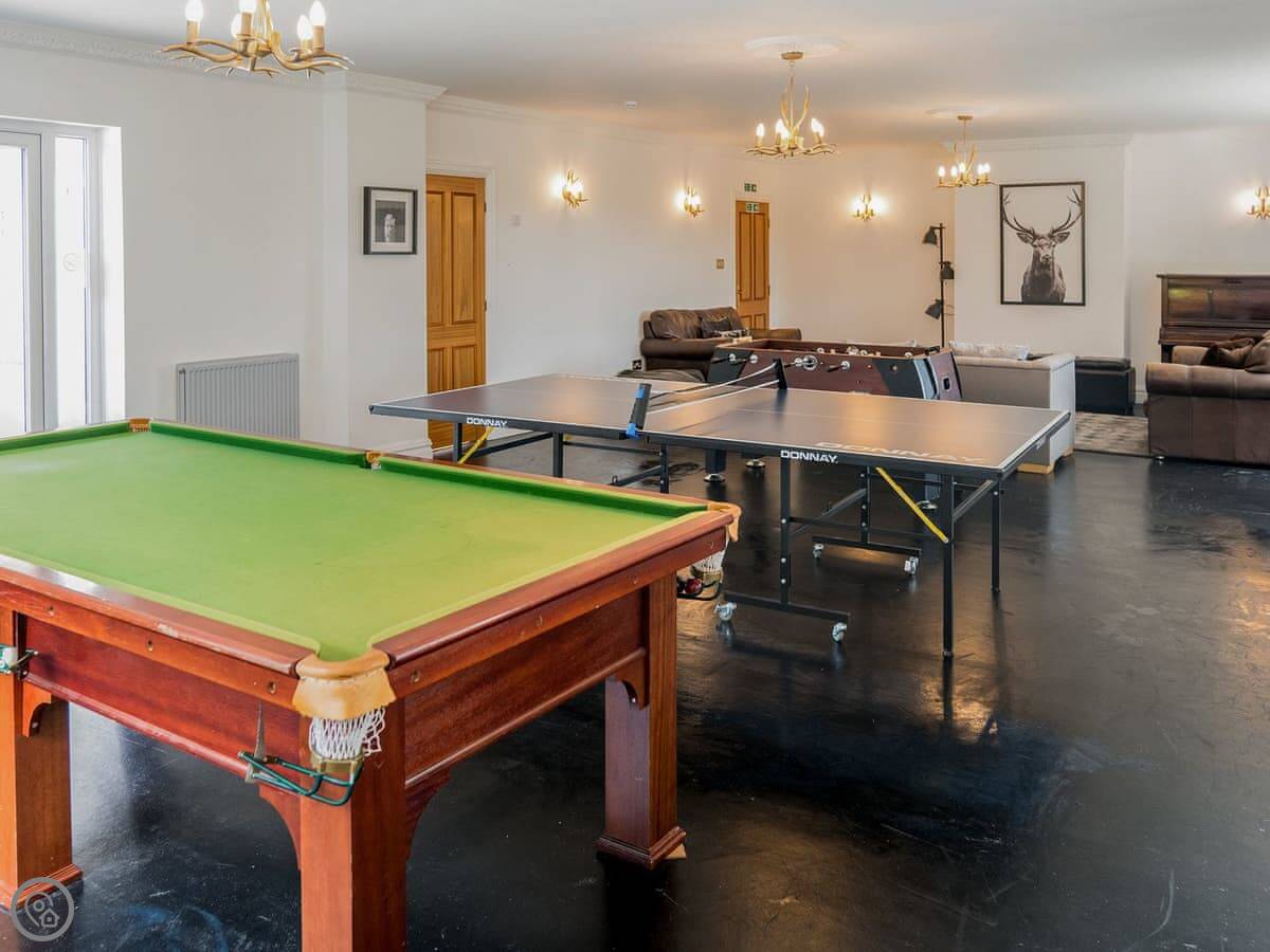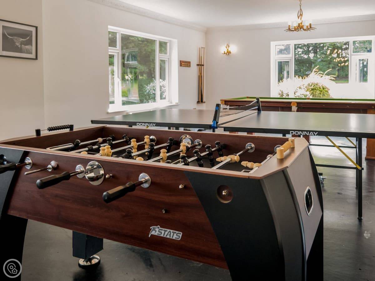 There's a games room with a snooker table, table tennis, and table football. Outside, there's a patio, lawn, and a hot tub.