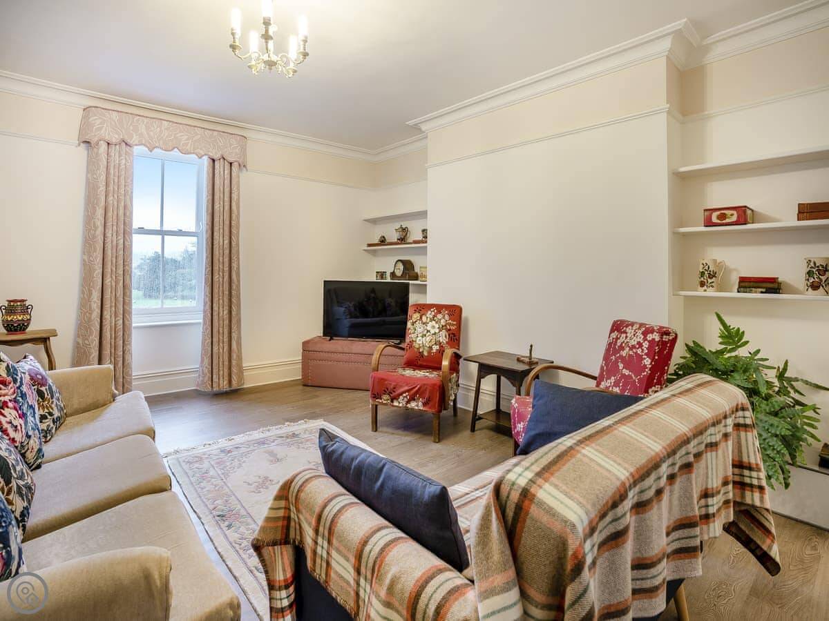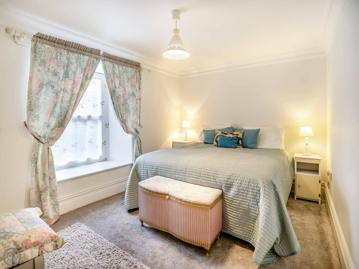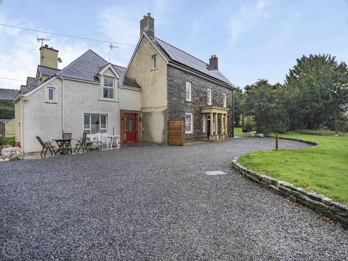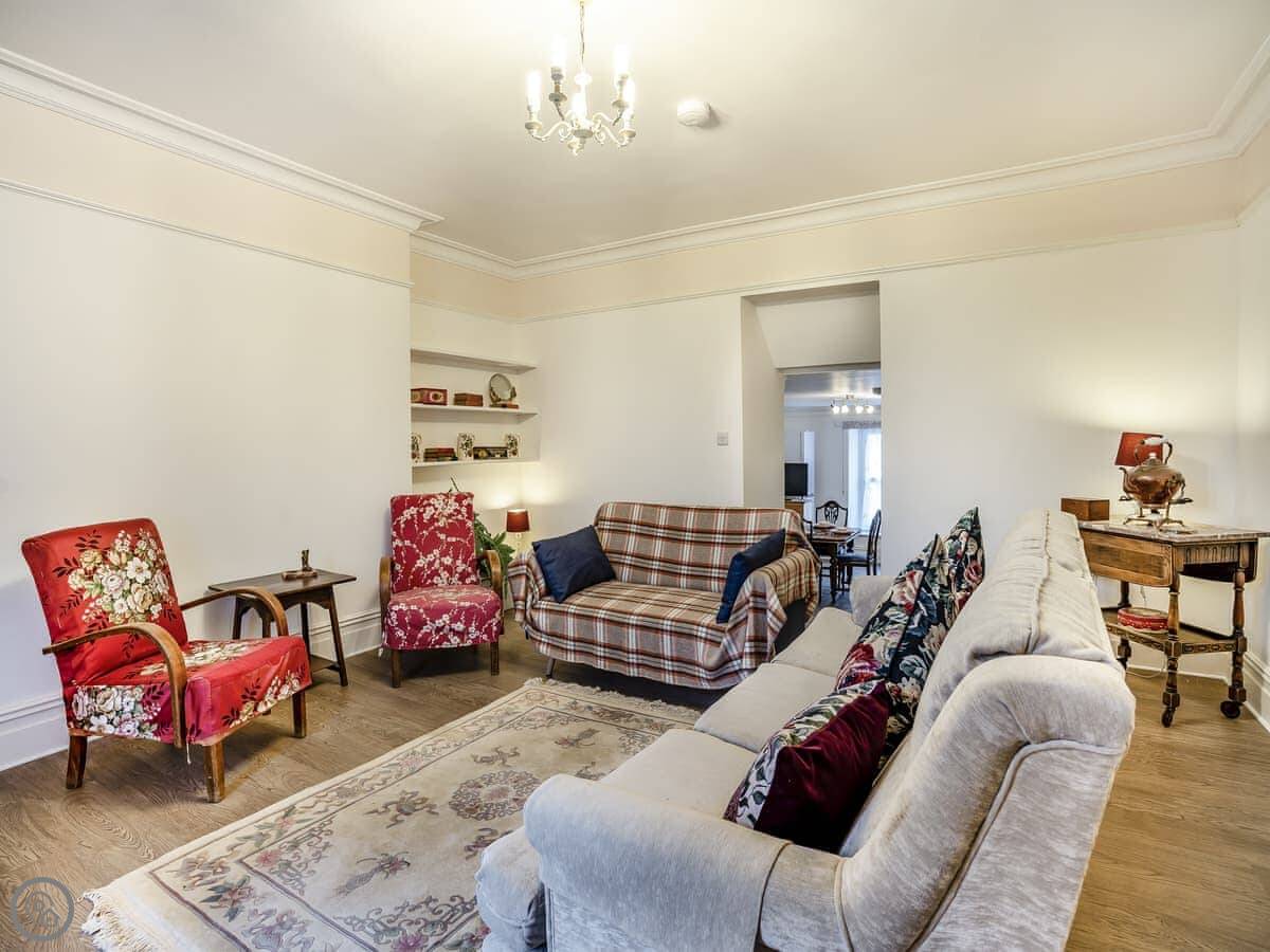 Brynog Mansion Apartment is in Ystrad Aeron, up a track from the village. It's on the first floor of a big old house. You get two bedrooms and two bathrooms, which is useful if two couples are sharing.