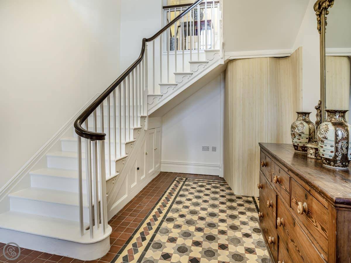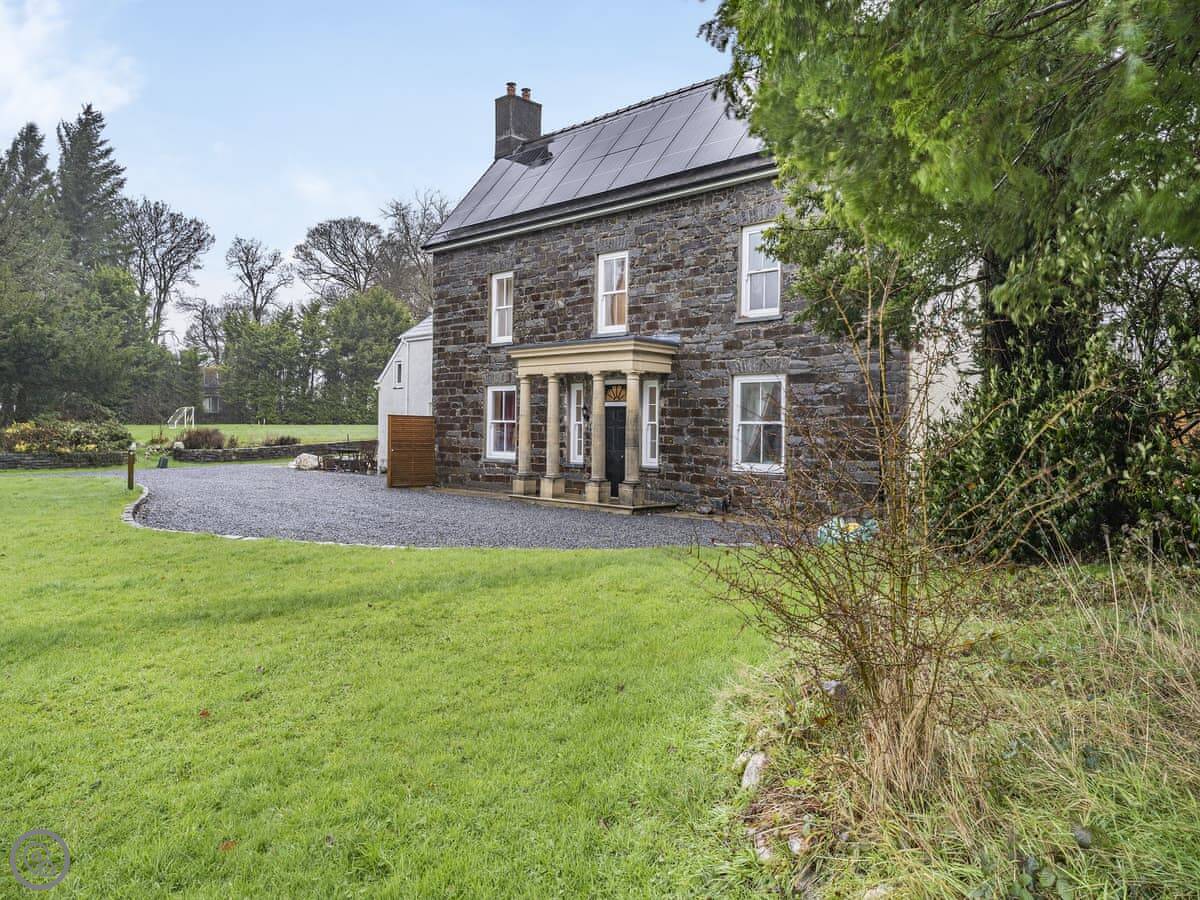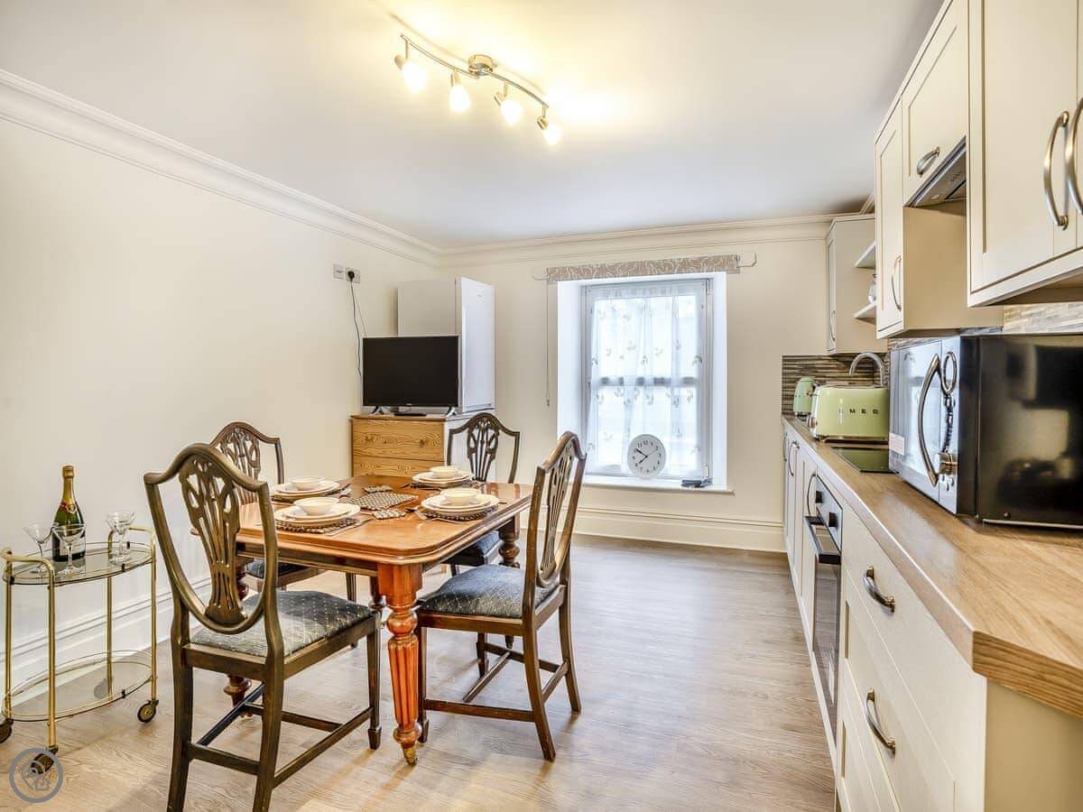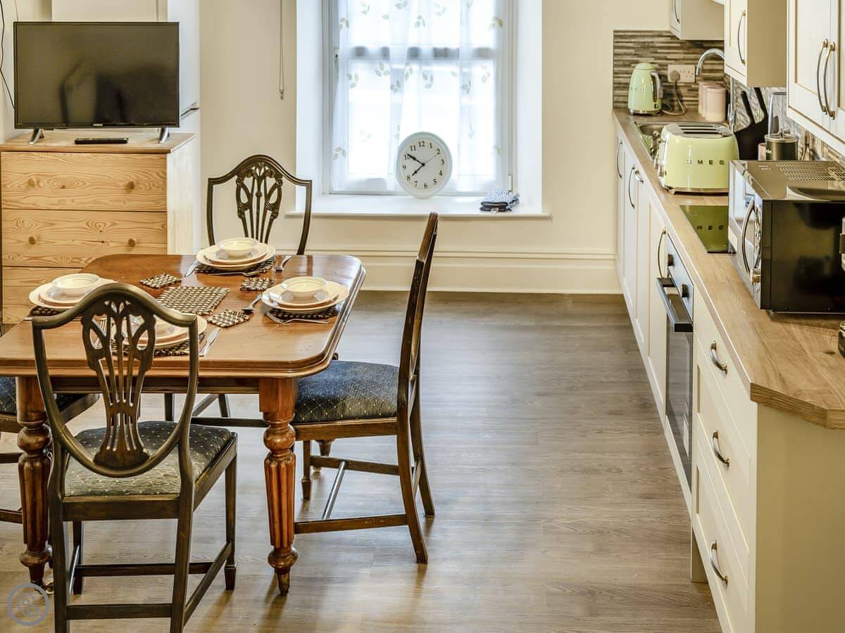 Brynog Mansion Apartment is in Ystrad Aeron, up a track from the village. It's on the first floor of a big old house. You get two bedrooms and two bathrooms, which is useful if two couples are sharing.