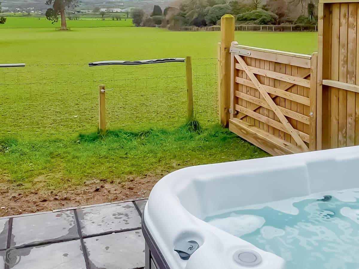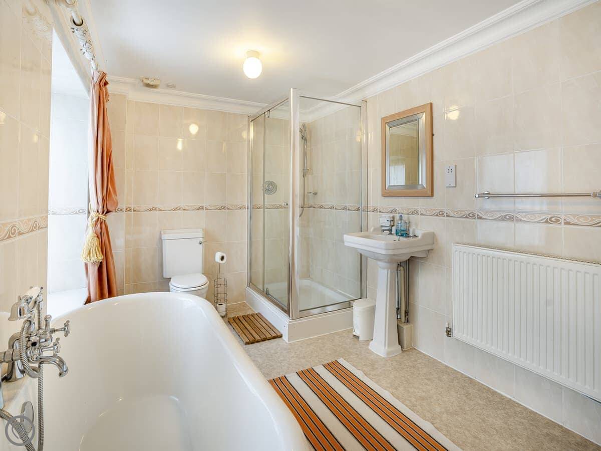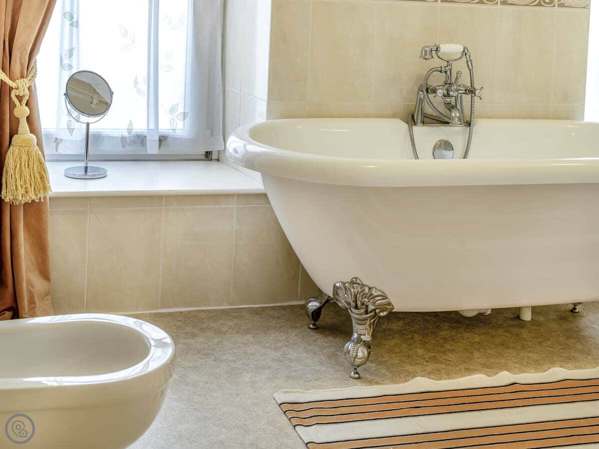 Inside, there's a living room, and an open plan kitchen and dining area. One bathroom has a roll-top bath and a separate walk-in shower. The other is a shower room. There's a Smart TV and WiFi. Outside, there's a bit of garden and parking. You can charge an electric car if you need to.