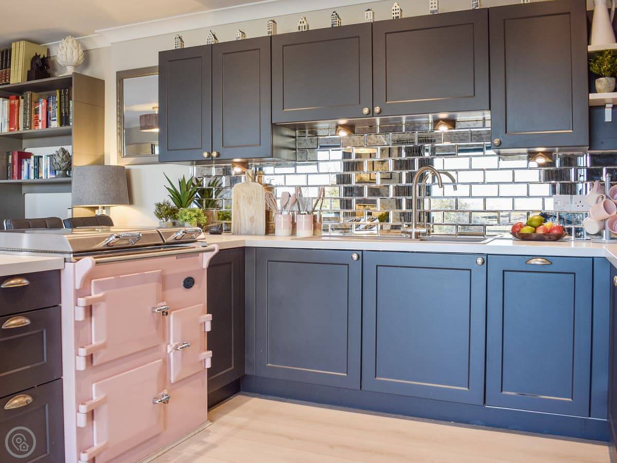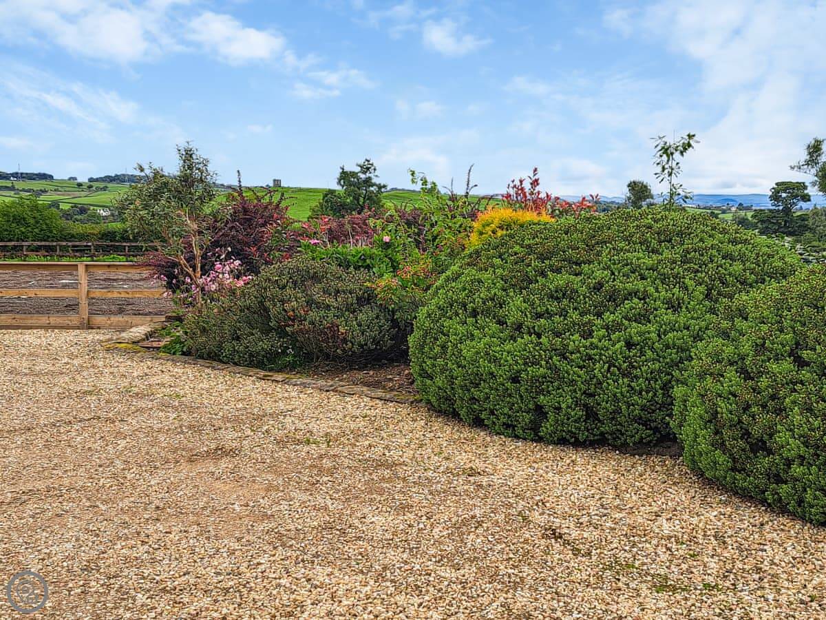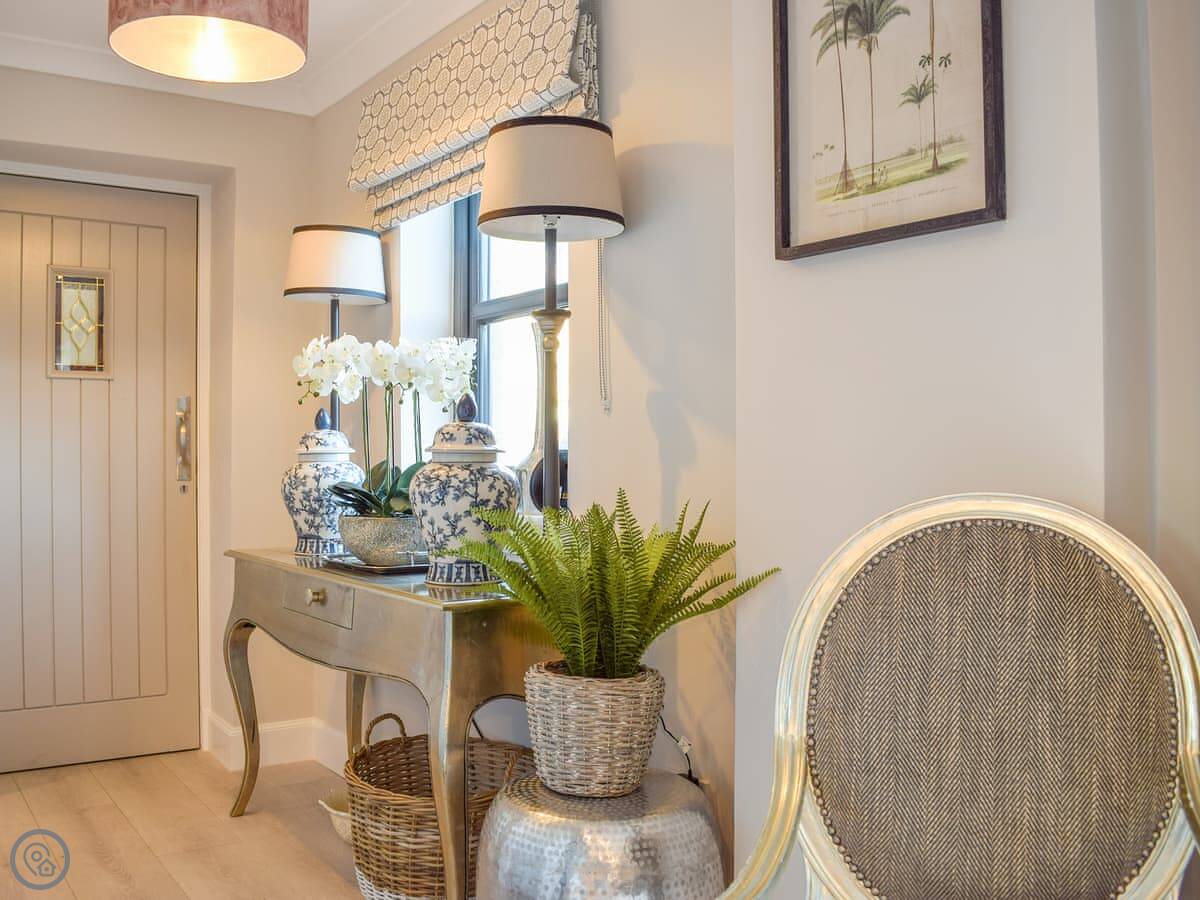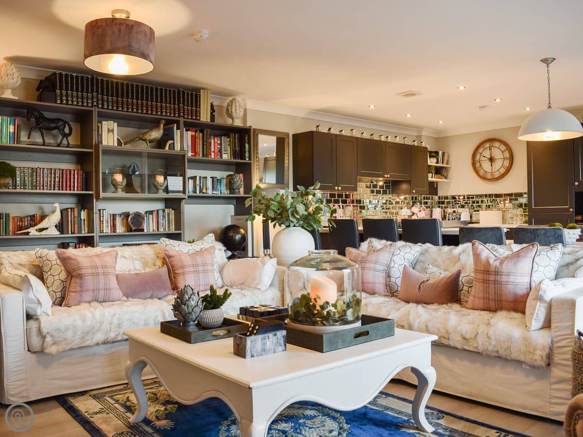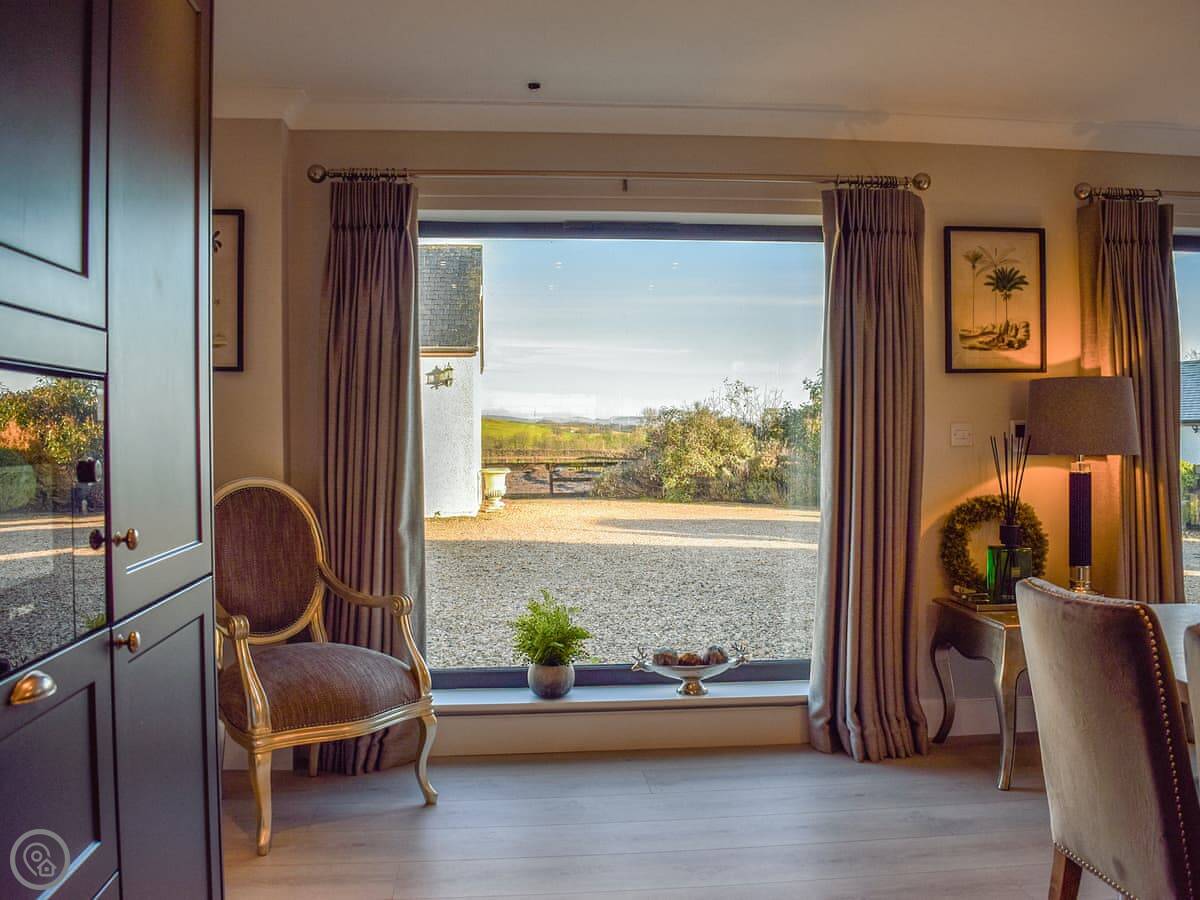 It’s a two-bedroom place, sleeps four, all on one floor. It used to be a stable but it’s been done up. You've got your own entrance and parking. The main room is open plan, kitchen, living and dining area together. Two big windows look out over the courtyard and fields.