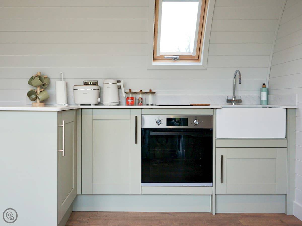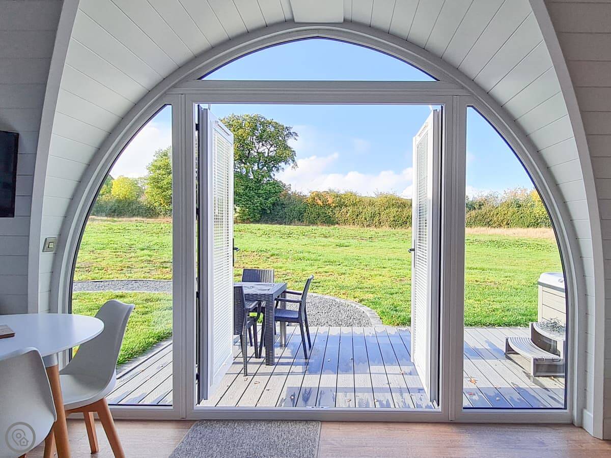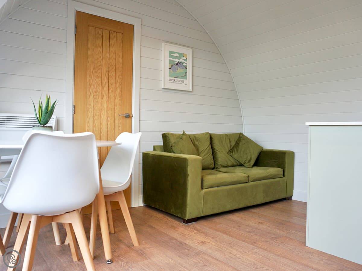 The pod sleeps four. Two bedrooms and one shower room. It has a 4 Star rating. It’s clean, comfortable and modern for a glamping setup. The main space is open plan.