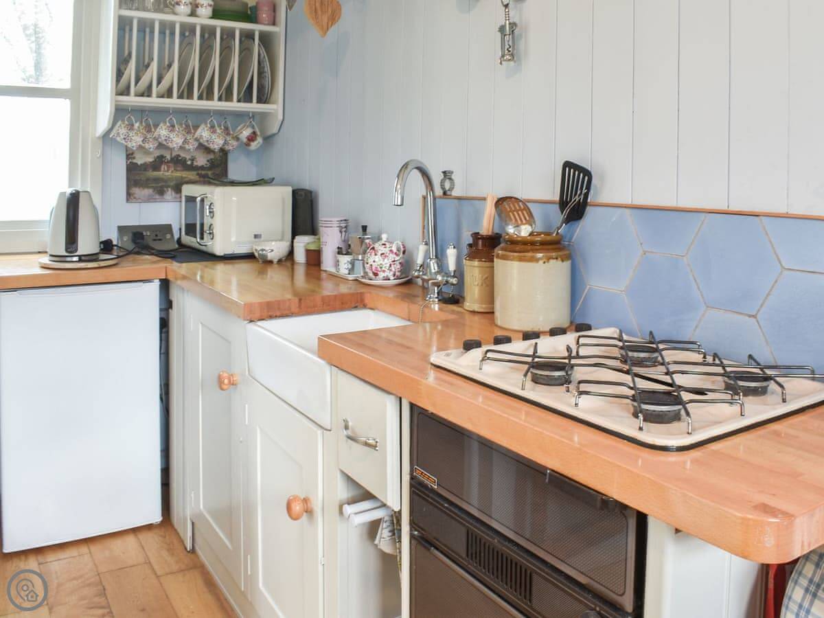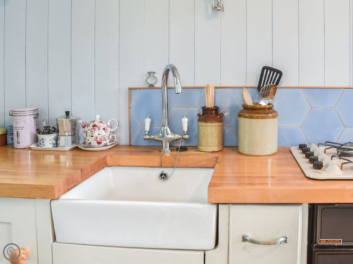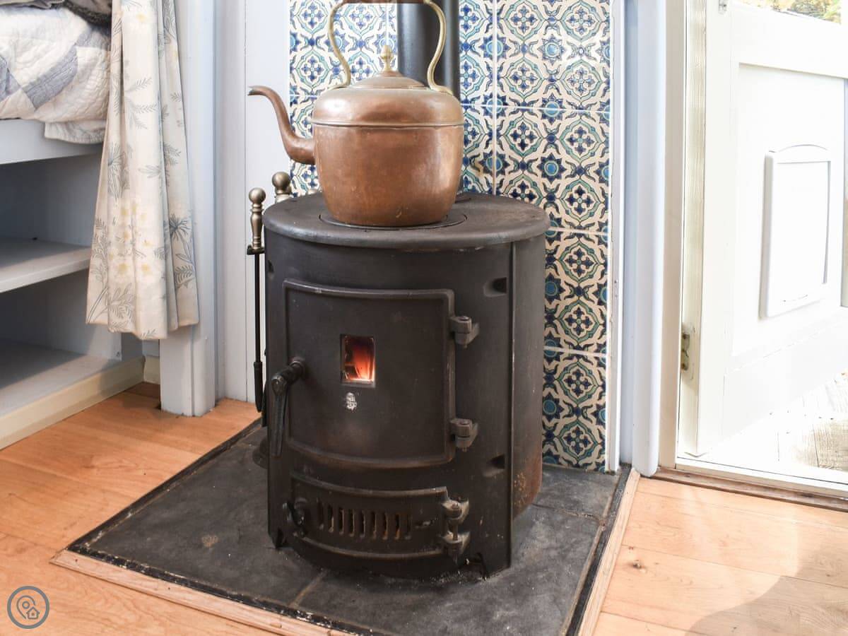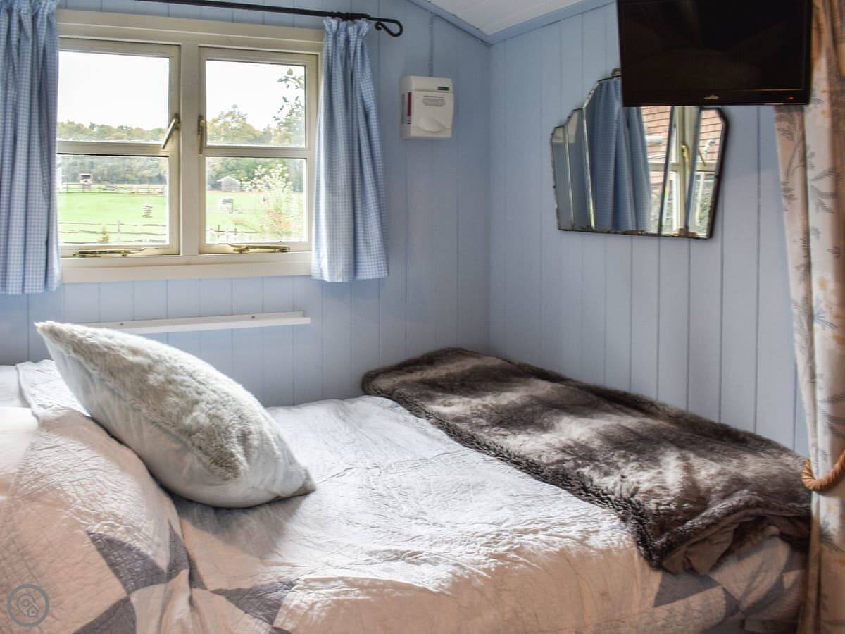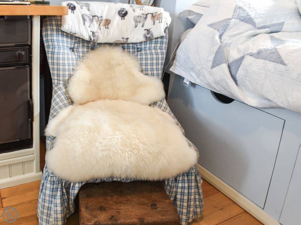 It sleeps two people. One bedroom, one bathroom. It's got a 3 Star rating. It's comfortable and clean. It's a hut, so the space is compact, but it's got everything you need. There's a small wood burning stove to heat it, a shower, a butler sink, and a TV. There's also a little porch with a rocking chair and your own private bit of garden to sit out in. You can have a barbecue there.