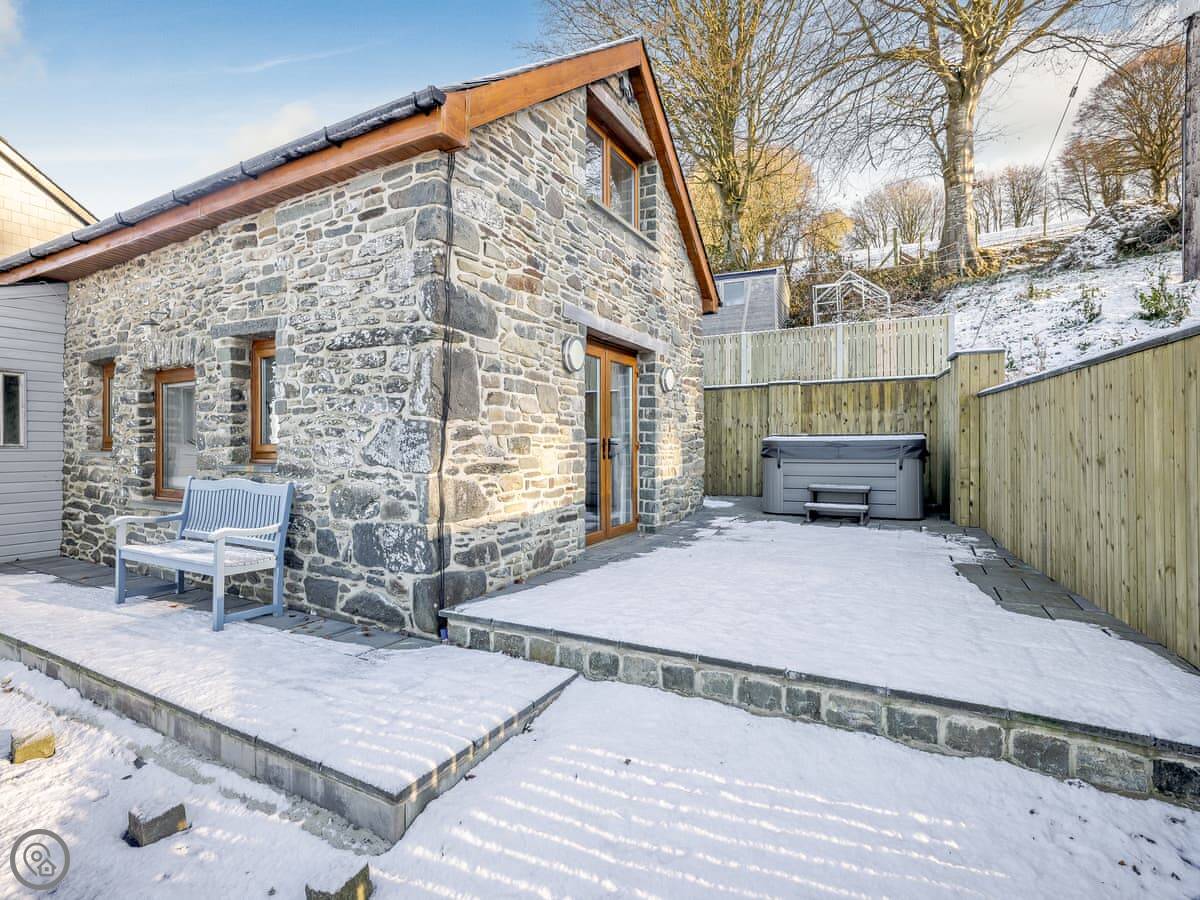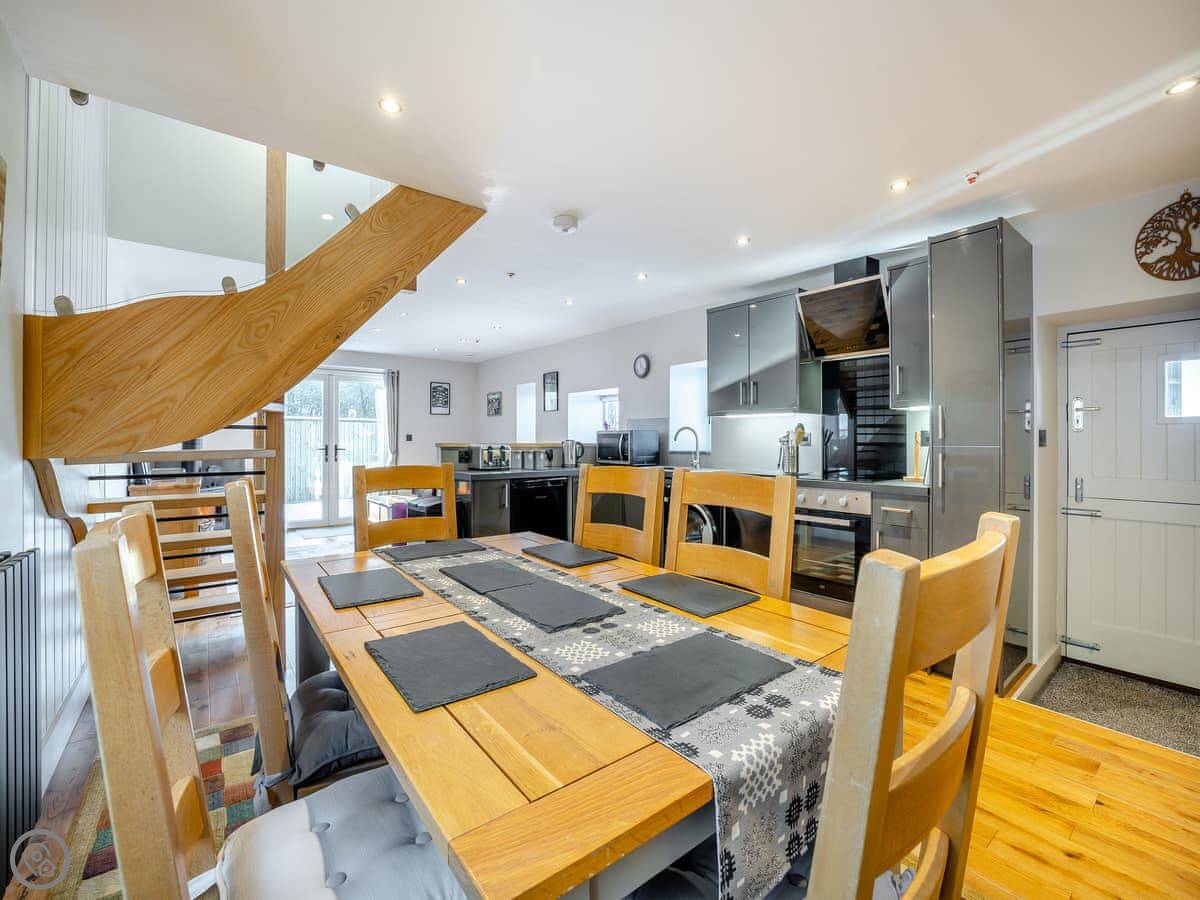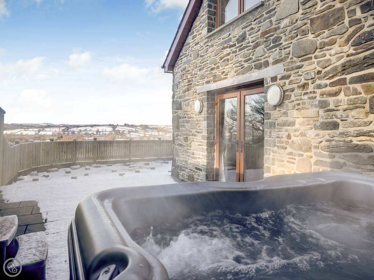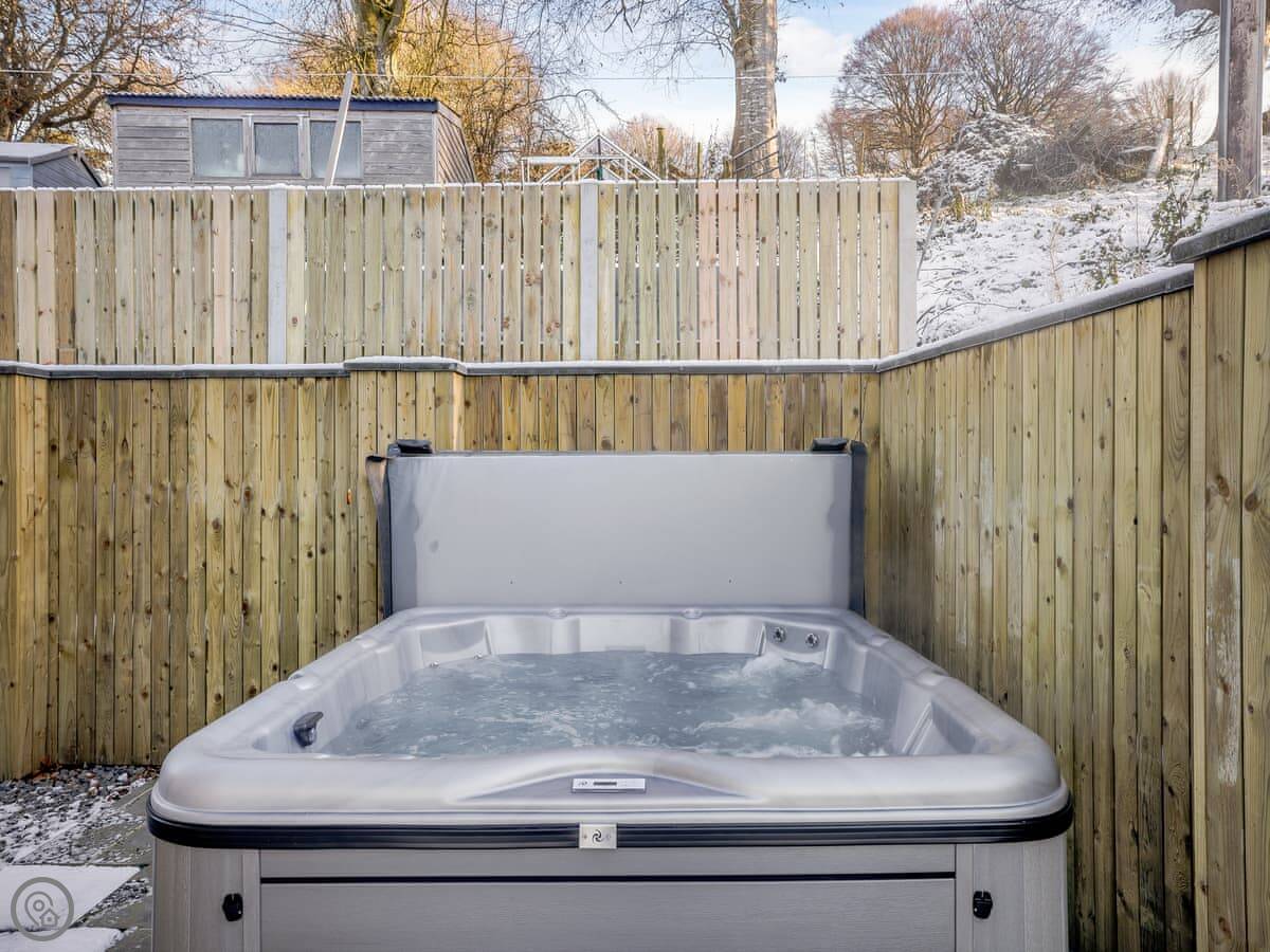 The main room is all open plan, with the kitchen, dining table, and sitting area with the wood burner. It works well for everyone being together. The garden is enclosed, there's a barbecue, and there's a hot tub.