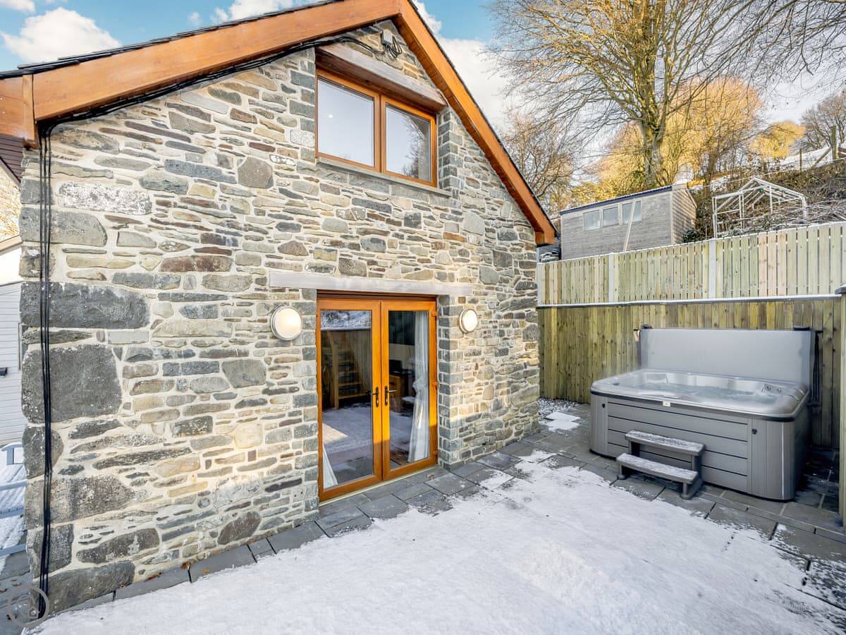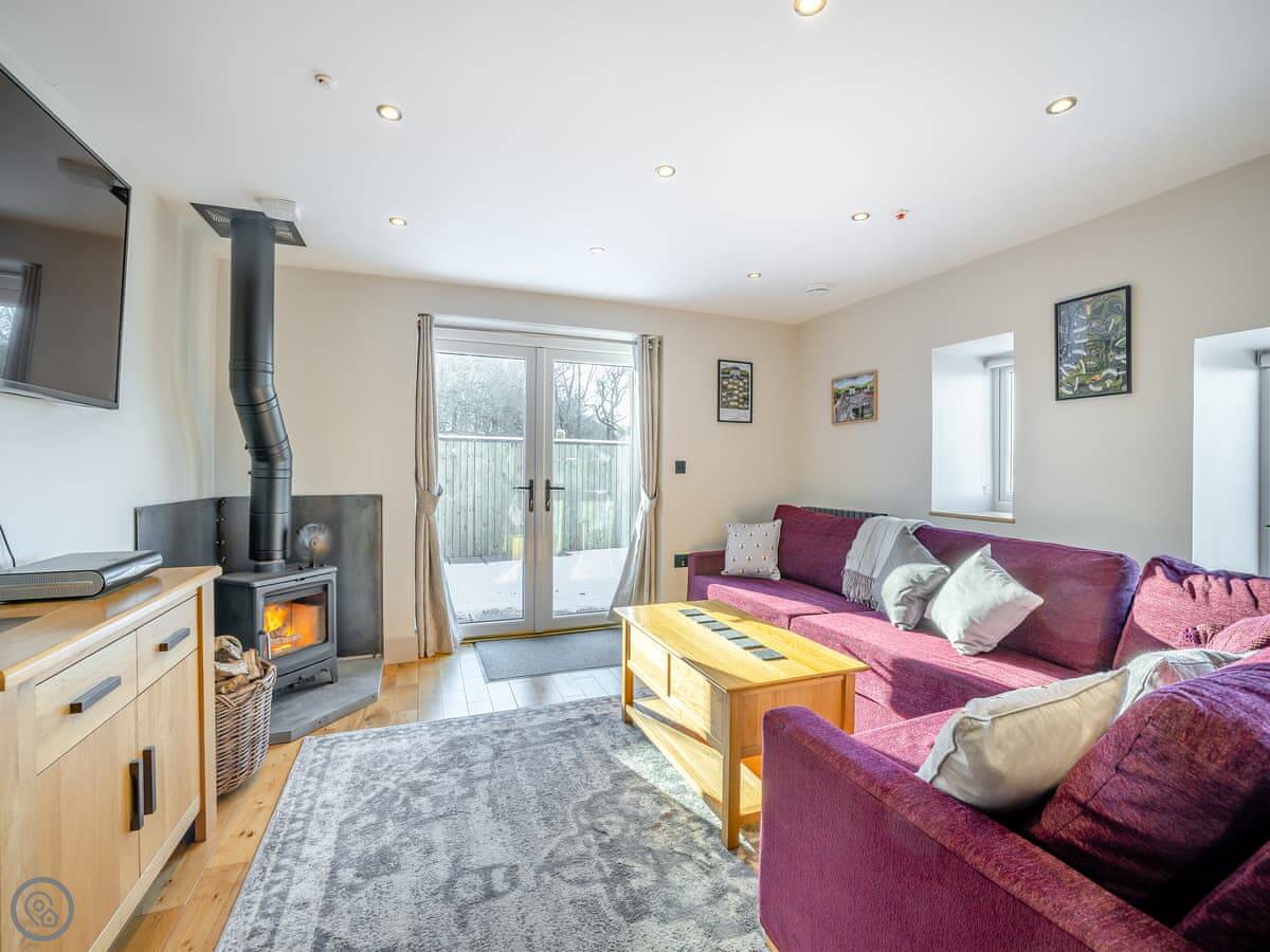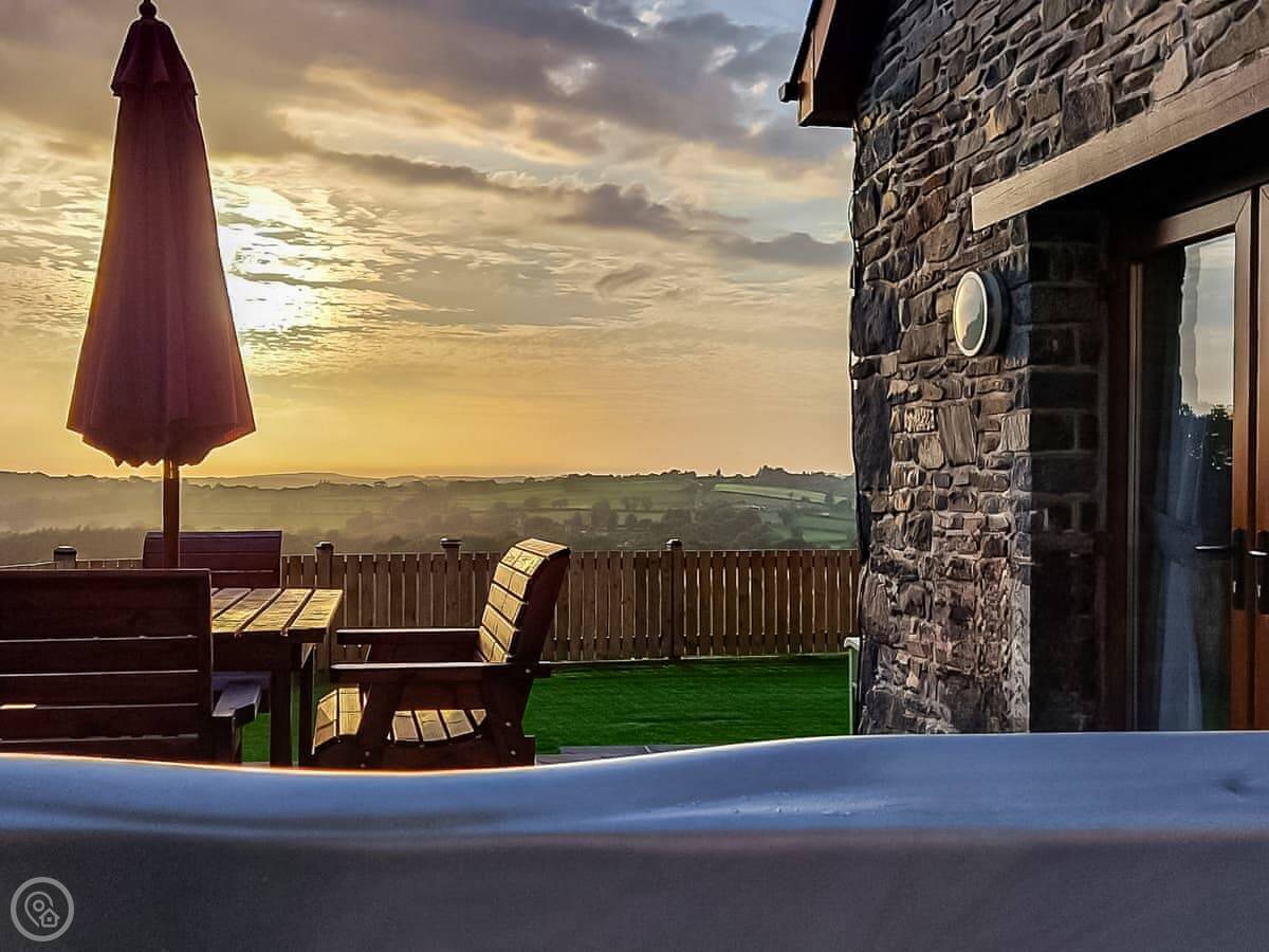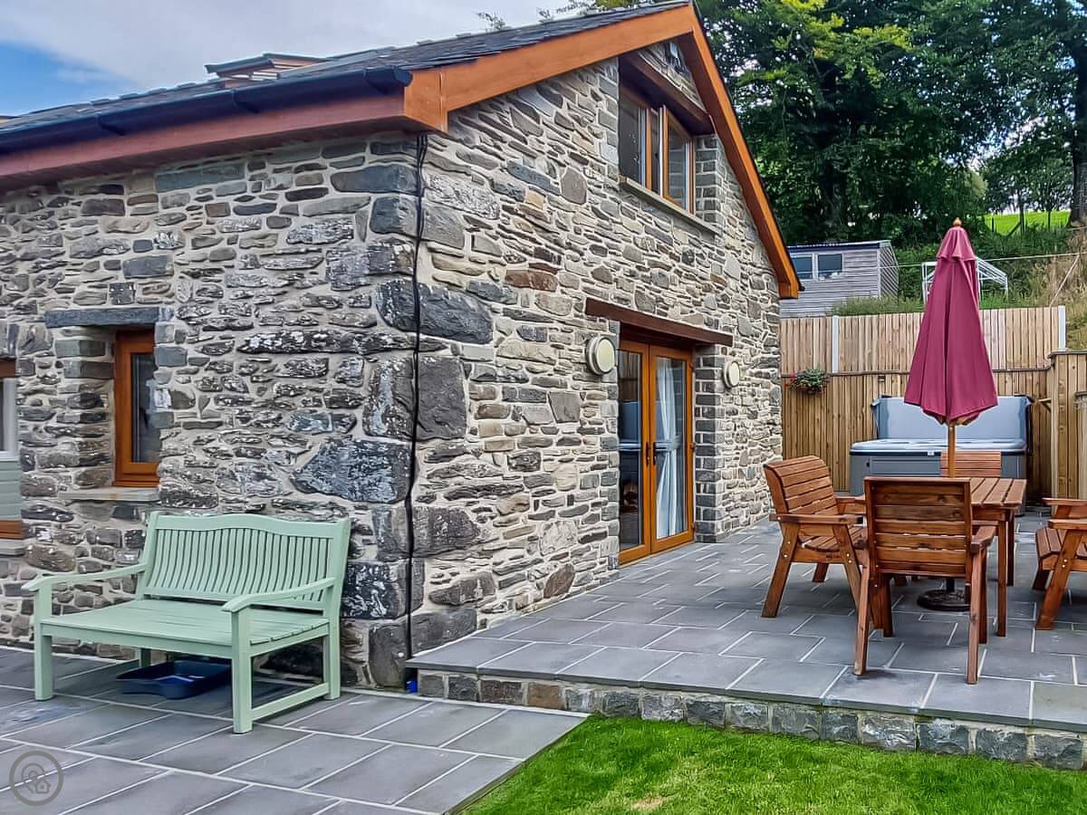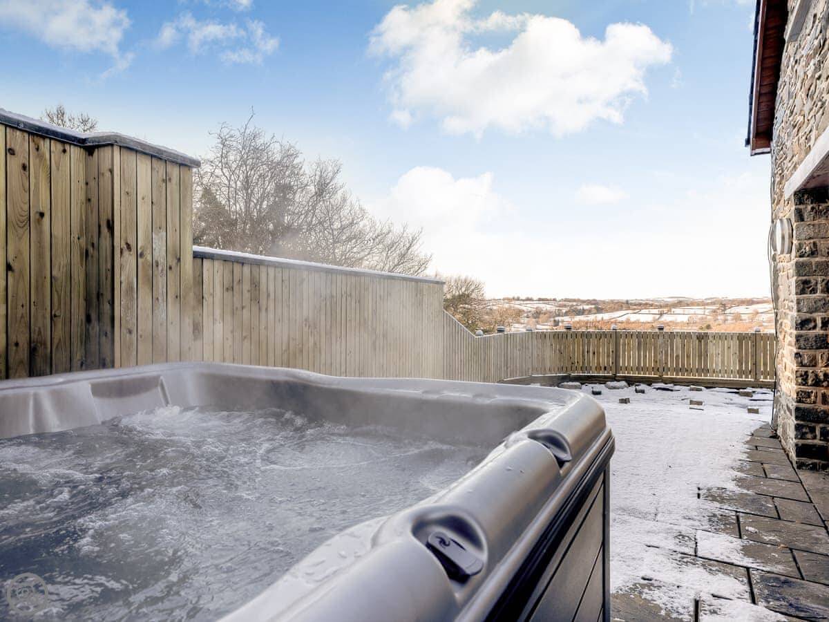The main room is all open plan, with the kitchen, dining table, and sitting area with the wood burner. It works well for everyone being together. The garden is enclosed, there's a barbecue, and there's a hot tub.