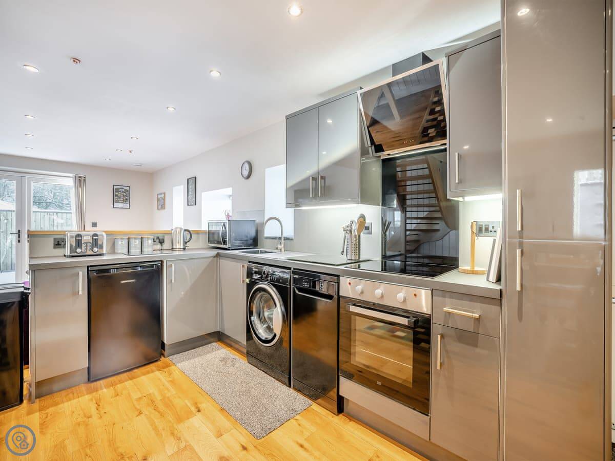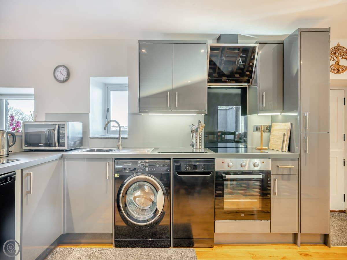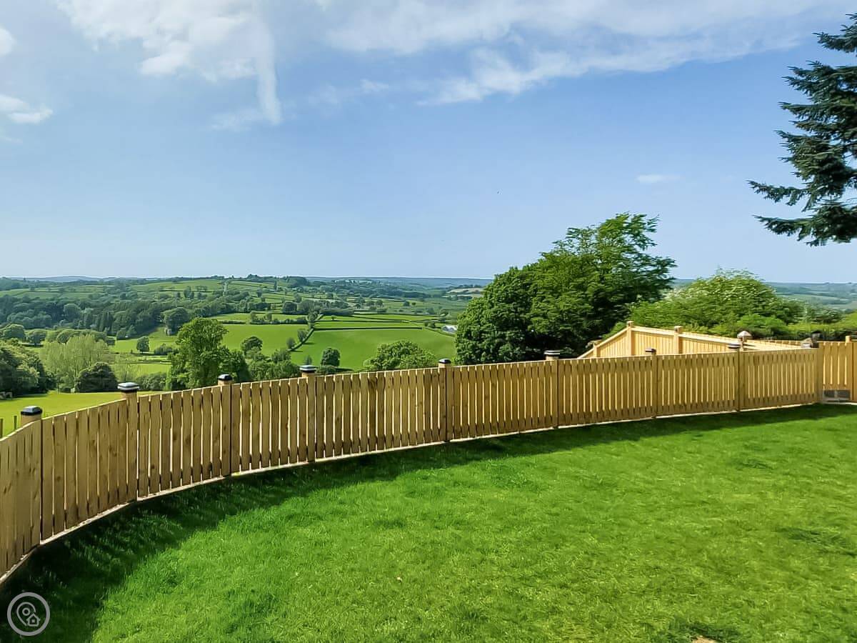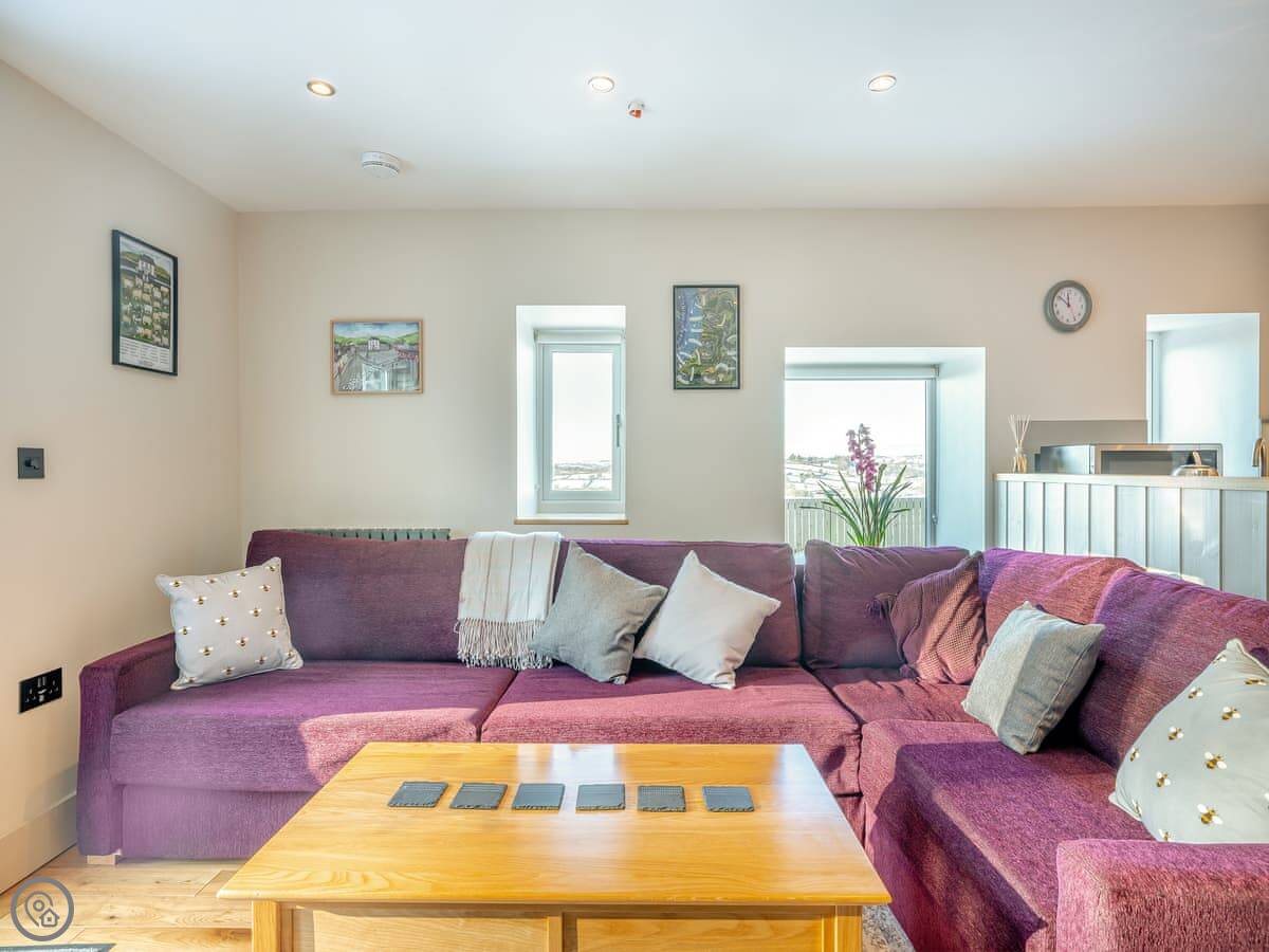 The main room is all open plan, with the kitchen, dining table, and sitting area with the wood burner. It works well for everyone being together. The garden is enclosed, there's a barbecue, and there's a hot tub.