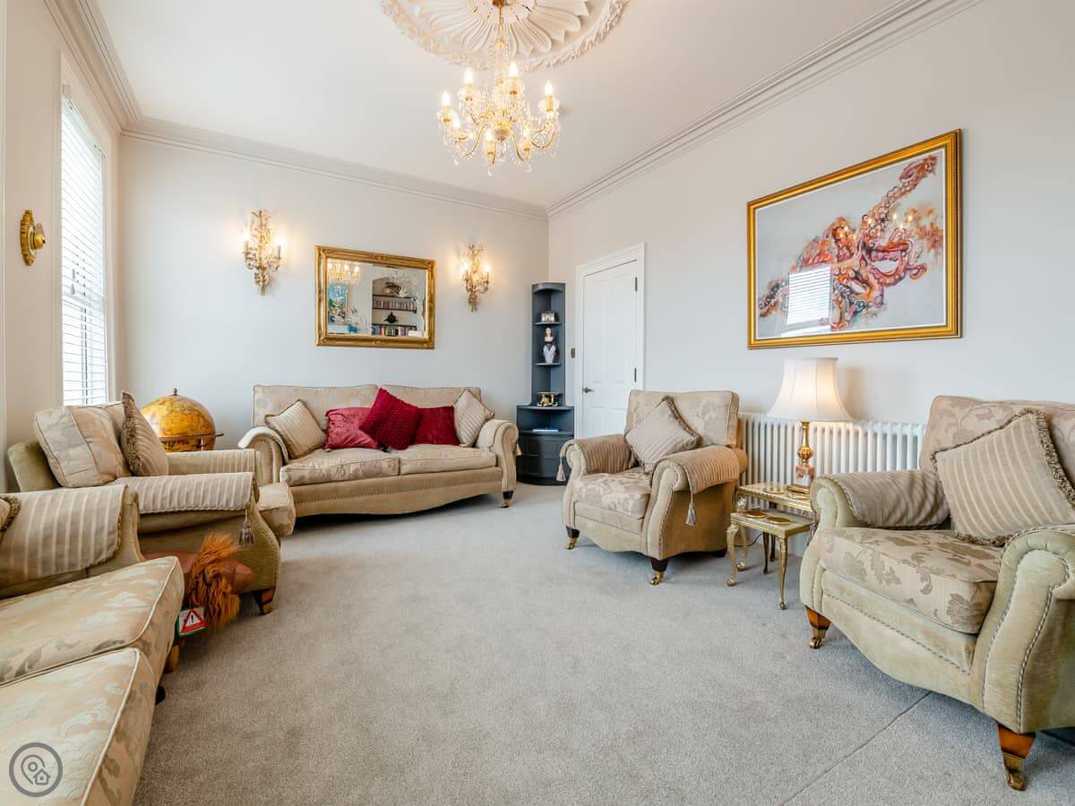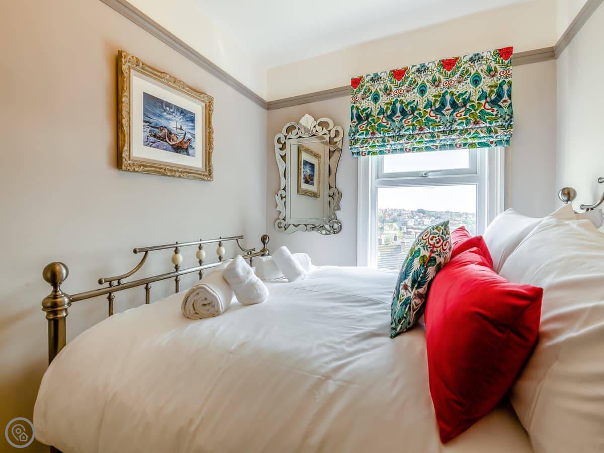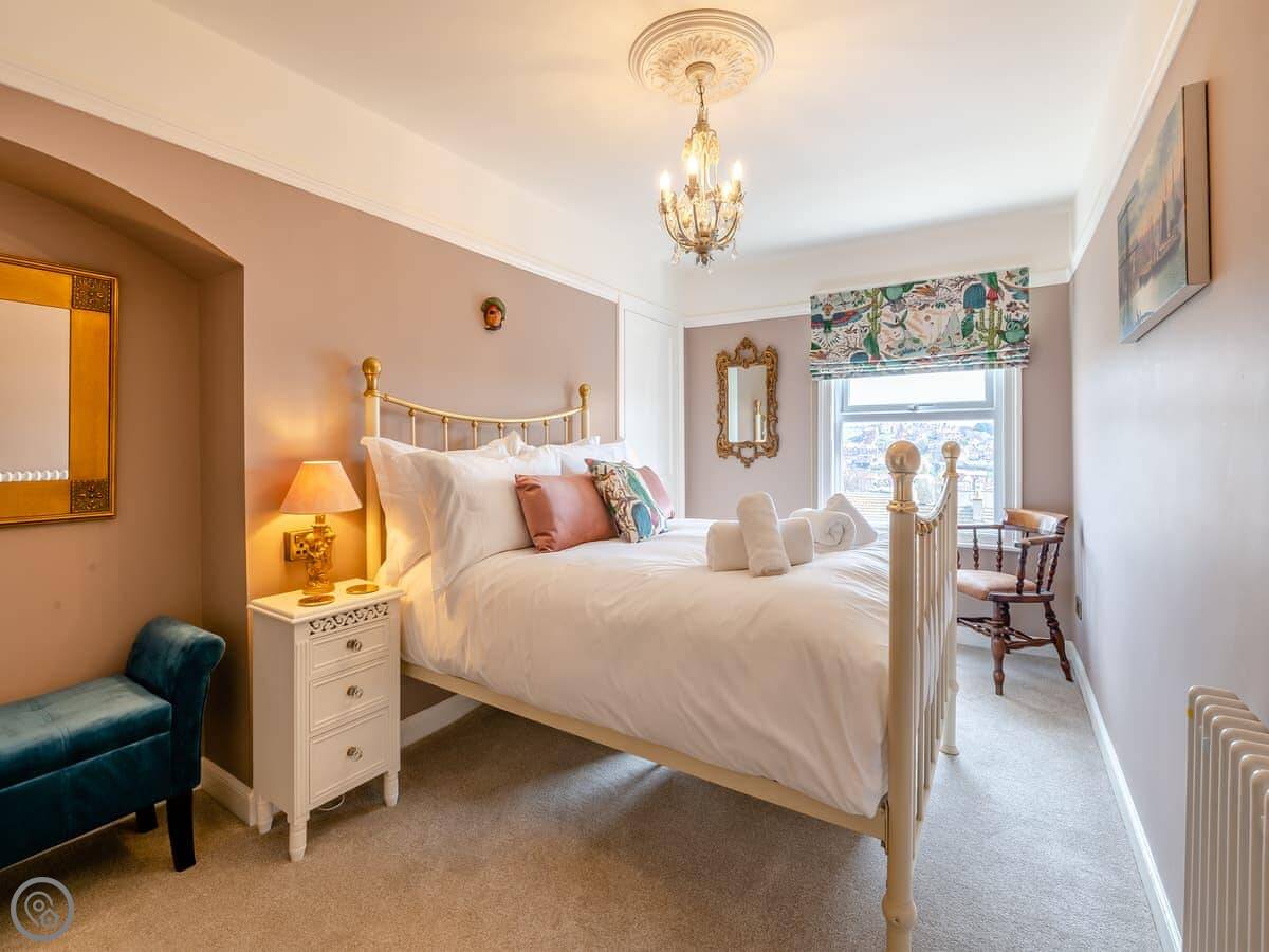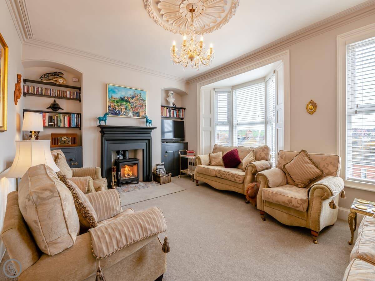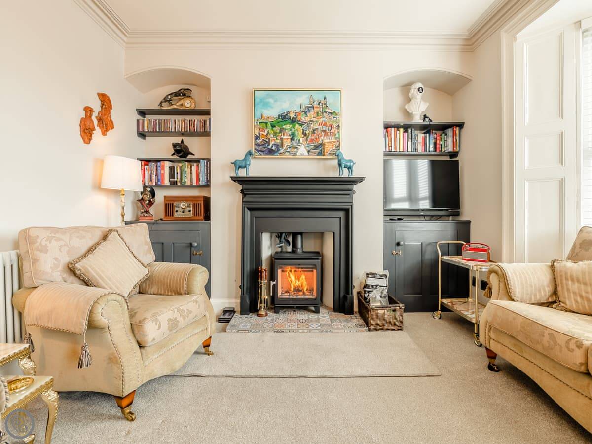 There's a small lawned garden at the front and on-street parking is available. The living room is on the first floor with a large bay window looking out over the town. There's a wood burner for cooler evenings.