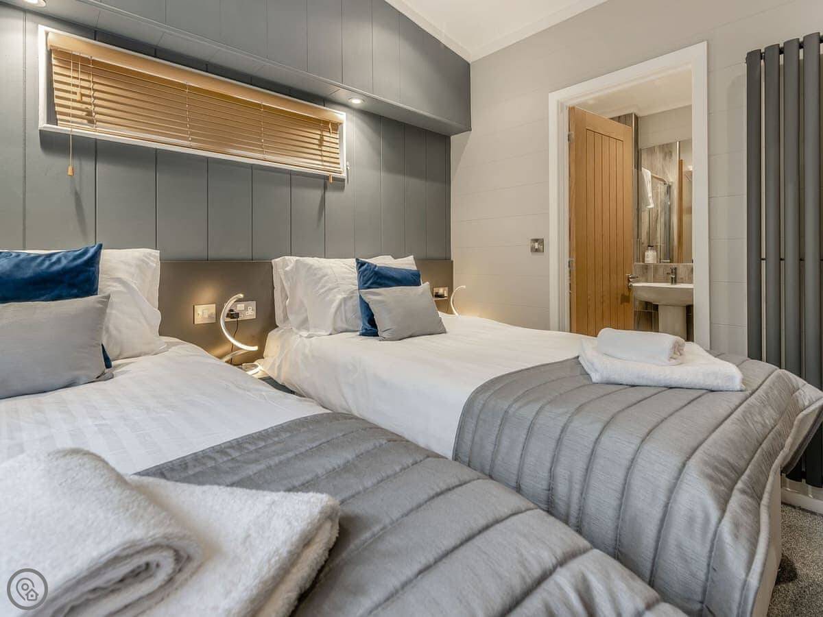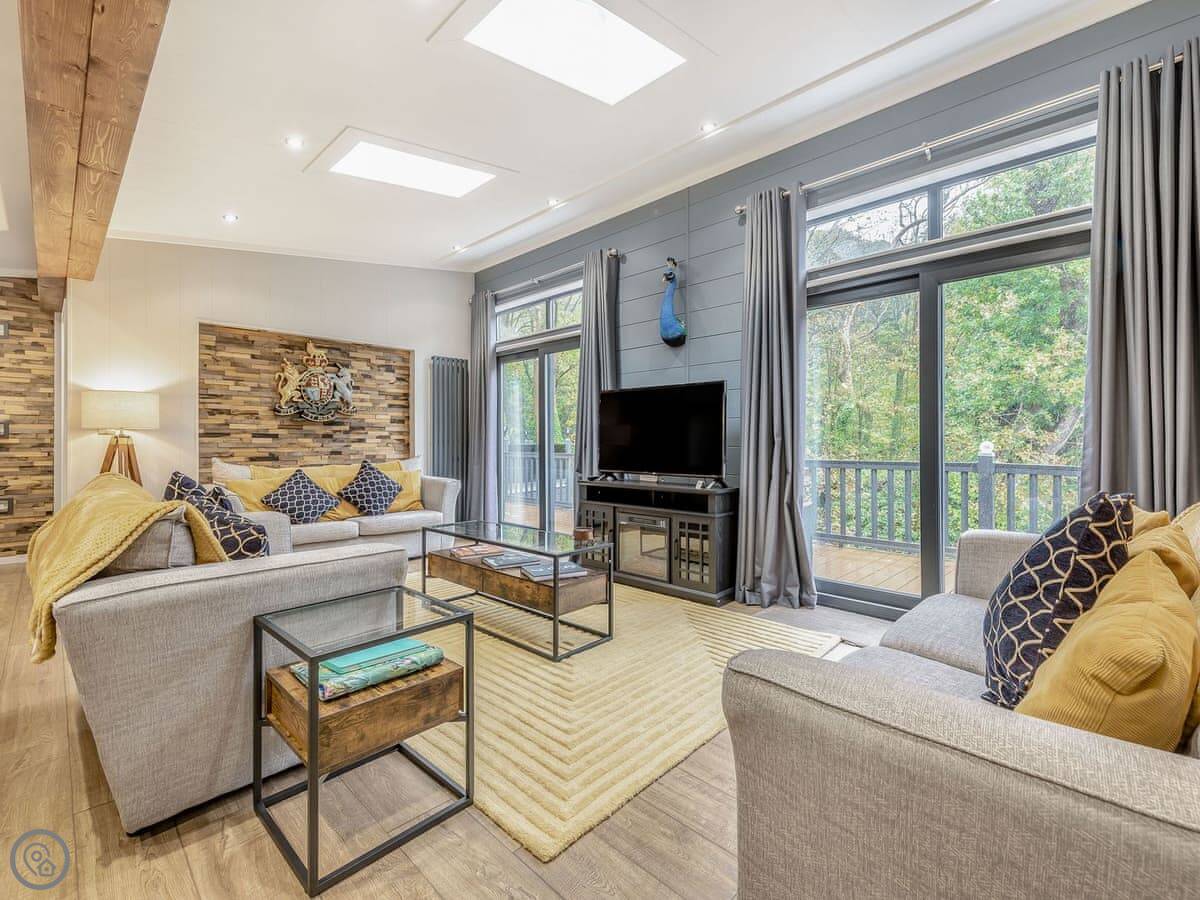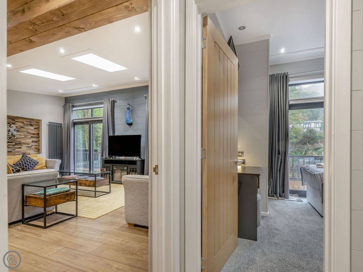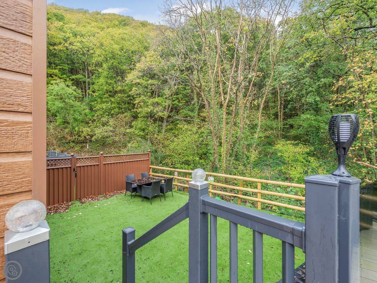 Two stylishly decorated bedrooms, both with their own Freeview TVs and en-suites, means you’re guaranteed a comfortable night’s sleep, leaving you well-rested to carry on your adventures the next day. Patio doors, from the living area and both bedrooms, lead out onto the decking and garden area, equipped with plenty of seating for enjoying a morning cup of coffee or simply enjoying the sunshine. Enjoy views from the decking overlooking a stream and woodland area.