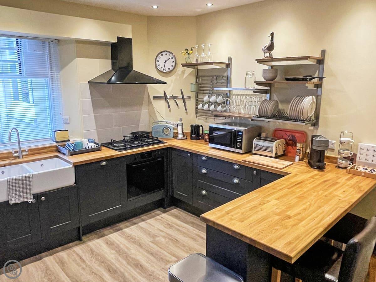 The living area looks out over the rose garden at the front. There’s a small courtyard garden there with a table and chairs. It’s a good spot for a coffee or a drink. The kitchen is new and has a dishwasher and a washing machine.