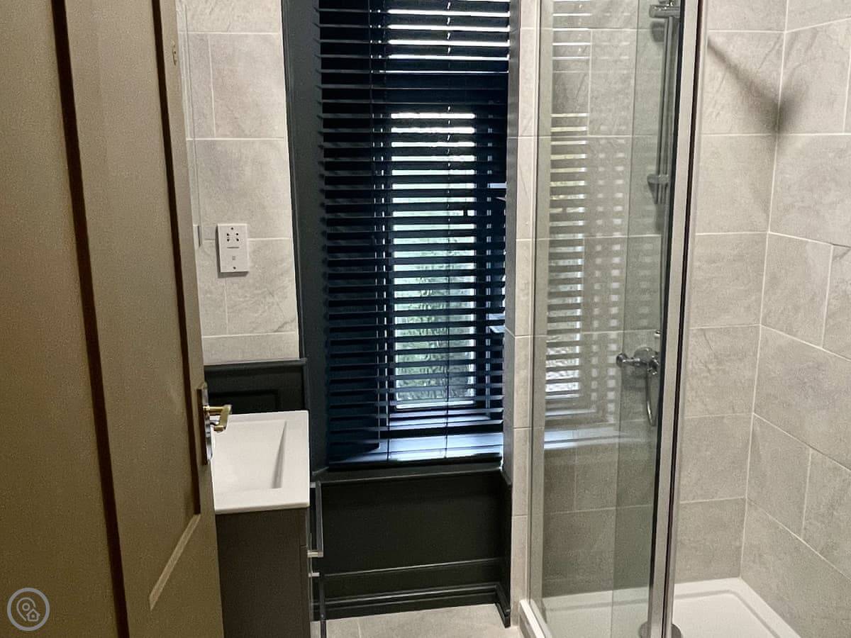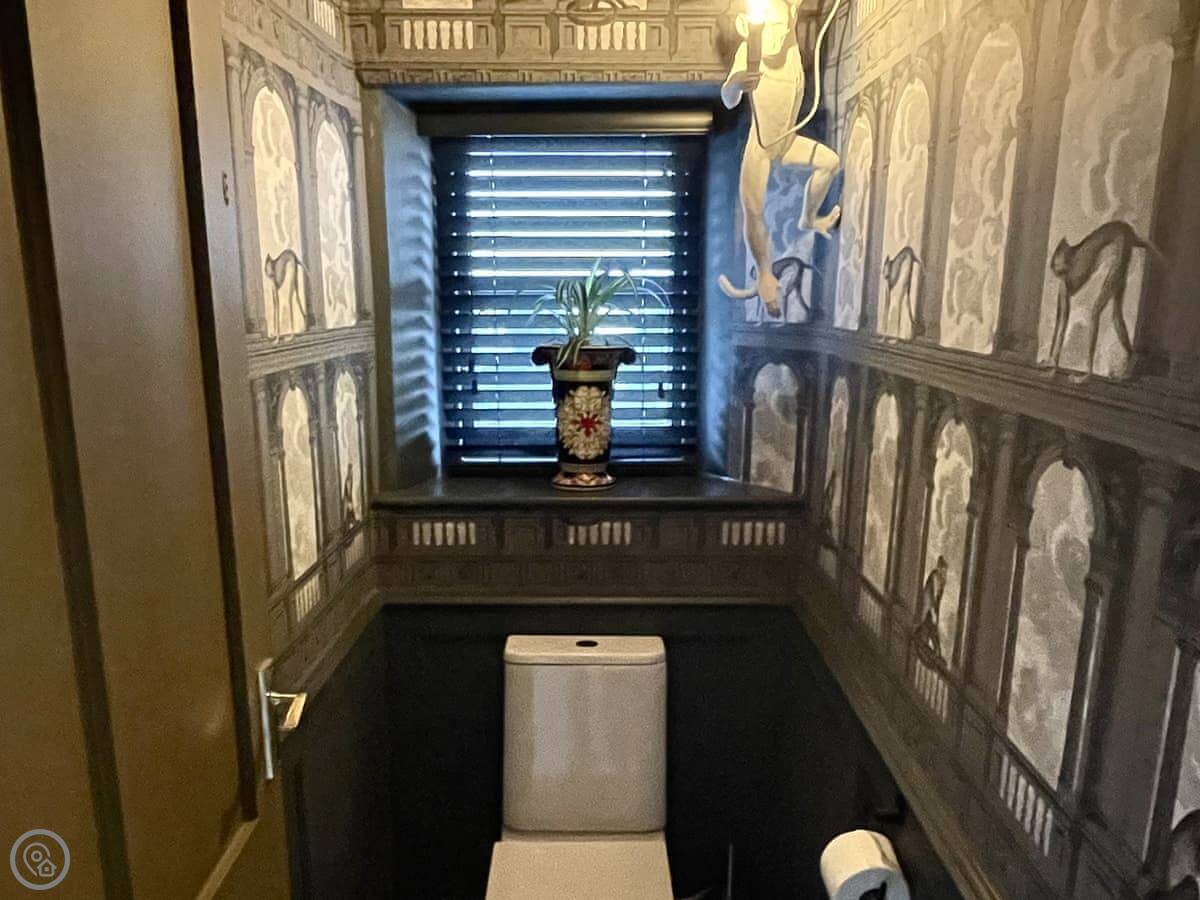 One bedroom has a king size bed and a TV. The other has a double bed and a TV. The bathroom has a shower. There’s a separate toilet. The decoration is a bit of a mix. There’s a patterned feature wall in the toilet.