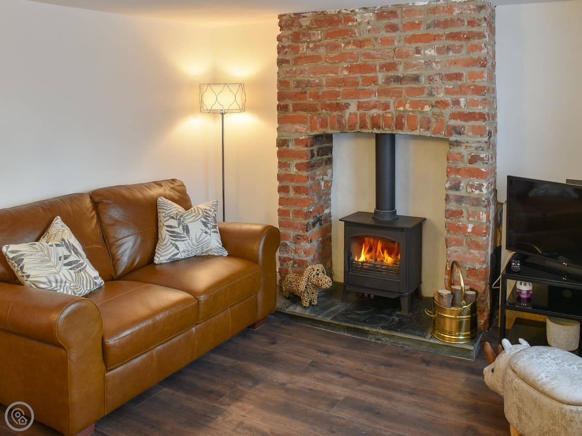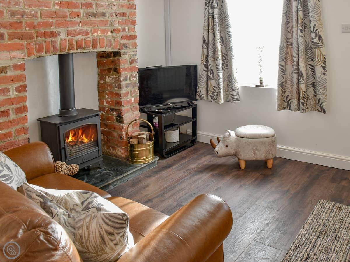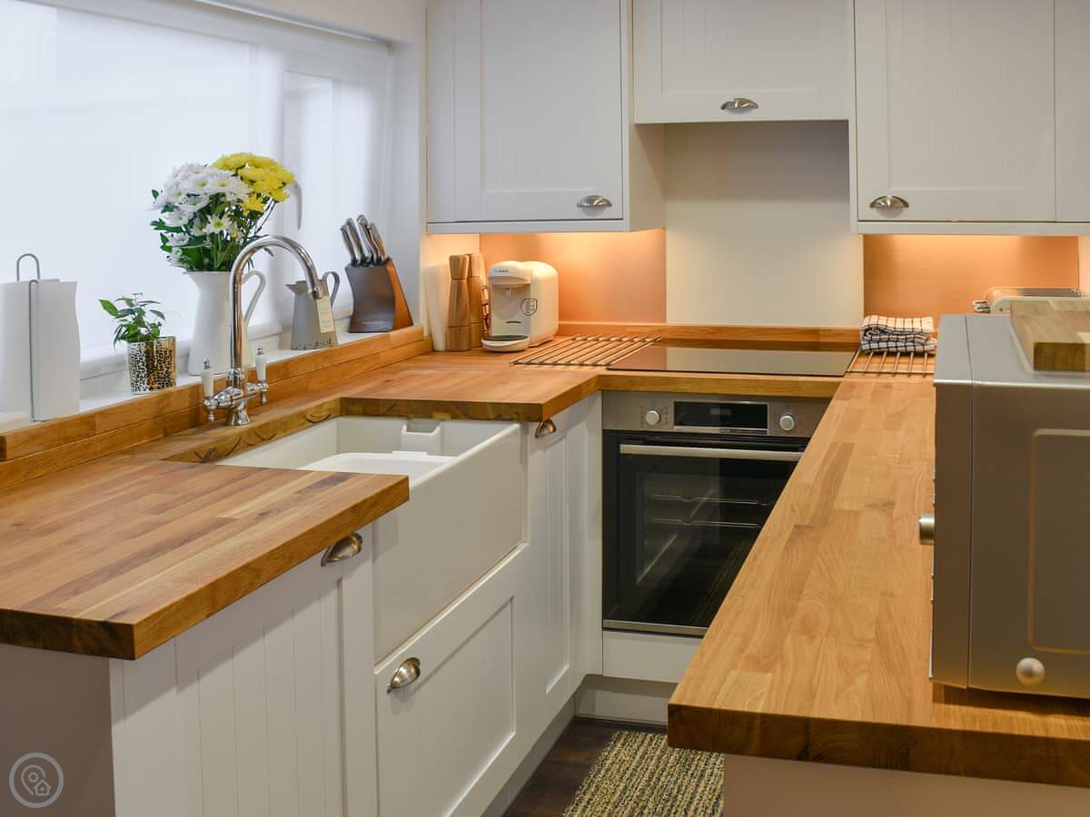 In the cottage, there's a wood burner in the living room with two sofas. The kitchen is decent. There's a modern shower room on the ground floor. The garden is enclosed, which is good if you're bringing dogs. It says you can bring two.