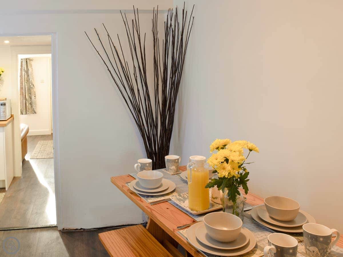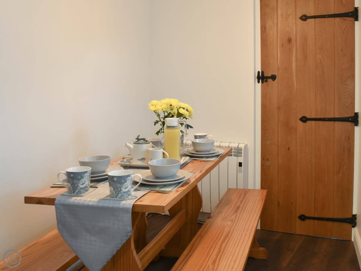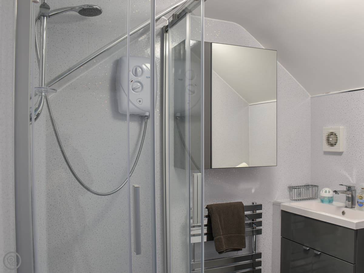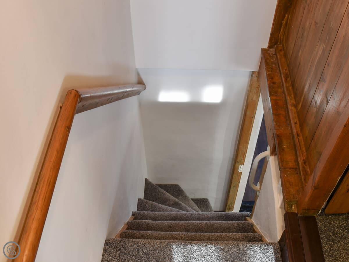 In the cottage, there's a wood burner in the living room with two sofas. The kitchen is decent. There's a modern shower room on the ground floor. The garden is enclosed, which is good if you're bringing dogs. It says you can bring two.