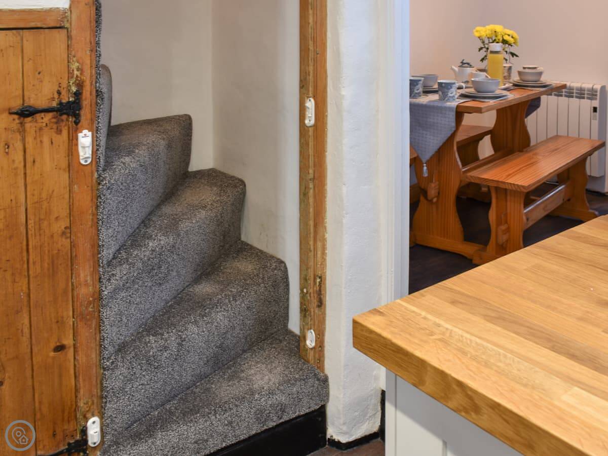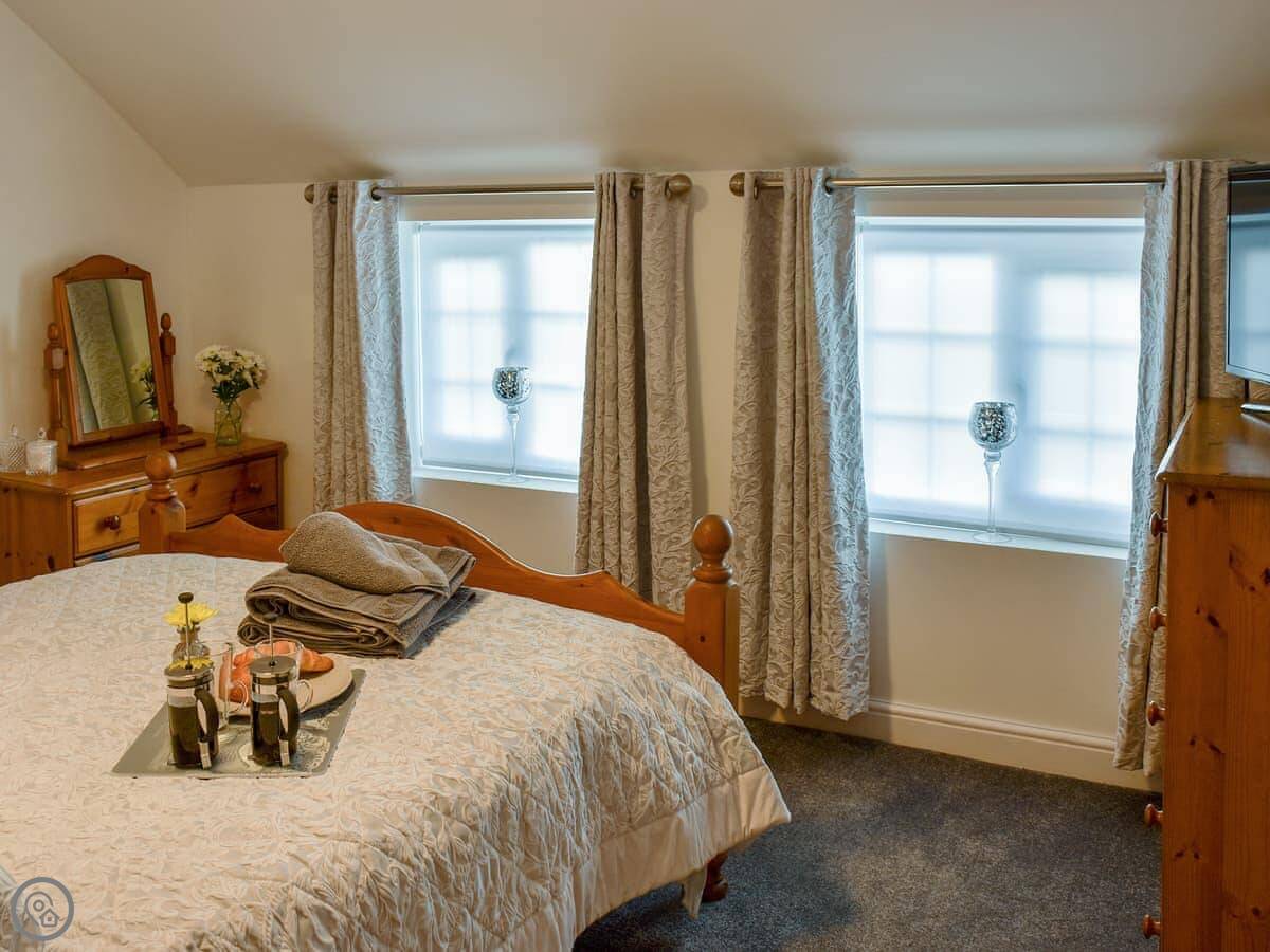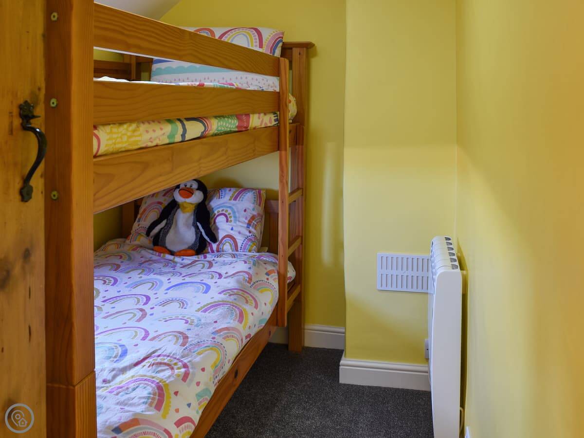 It sleeps two. There are two bedrooms, one with a kingsize bed and a view of the sea. The other has pine bunk beds. As the description mentions, the stairs are steep and narrow. Just so you know.