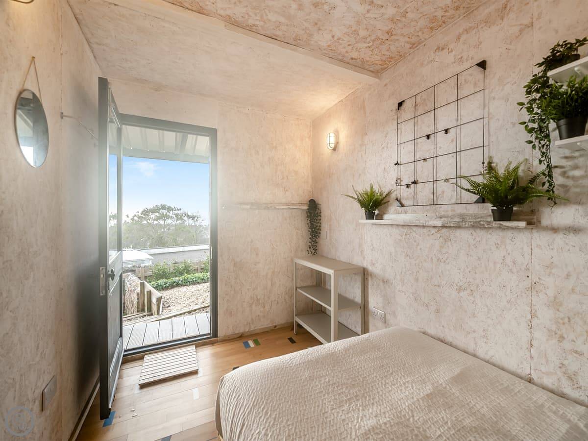 The Lookout Pod is located in a well regarded residential area of Torquay. Accessible via a gate from the adjoining road, guests after walking up the stone steps find themselves in the garden area. This elevated area boasts a 6 person hot tub, distant sea views and seating. There is also a cold water outdoor shower for hosing off any sandy pups or wetsuits, and a washing line, along with outside electric sockets if needed. The structure consists of a door leading into the bedroom and general living space, with double bed, kettle and toaster.