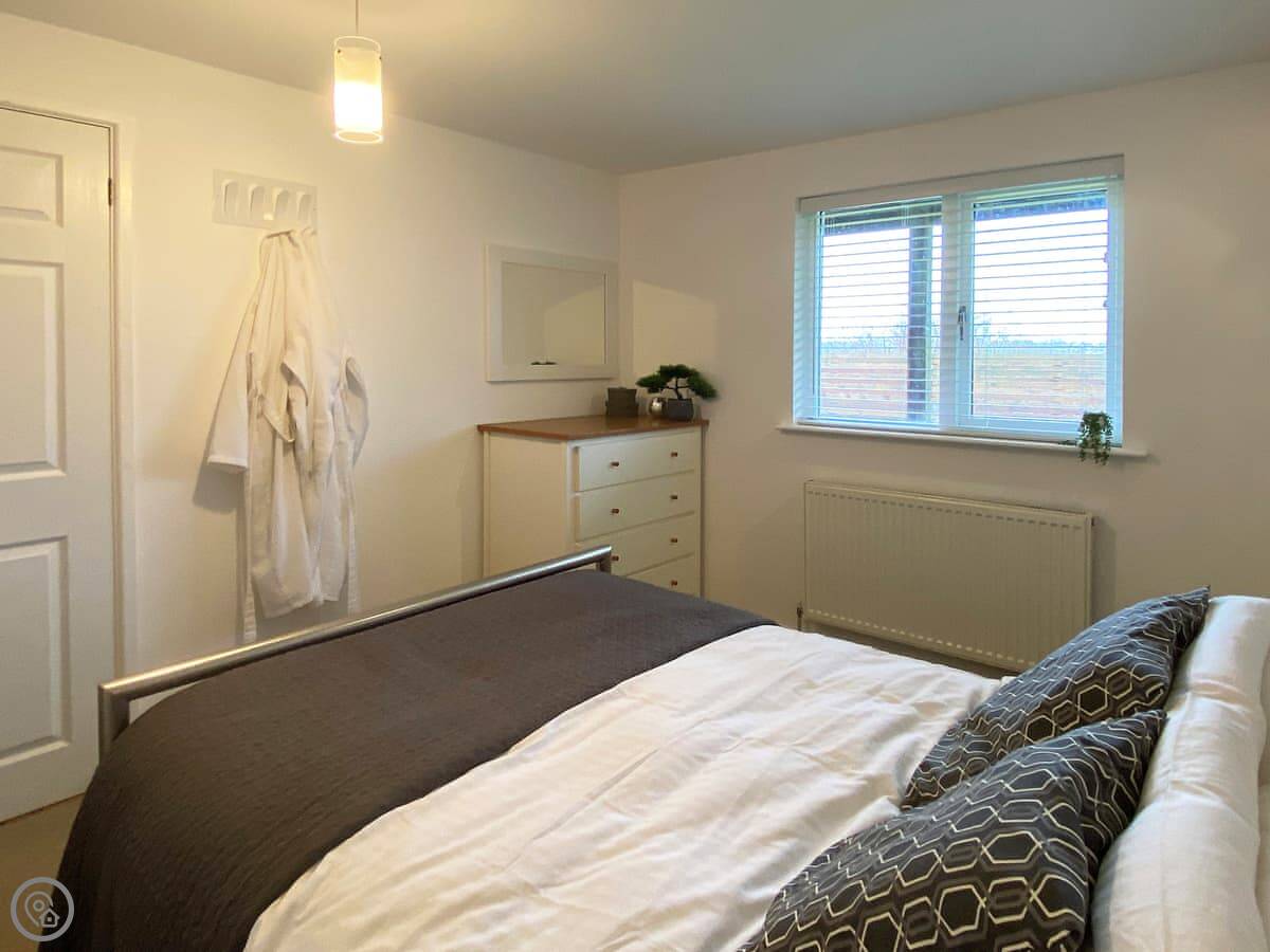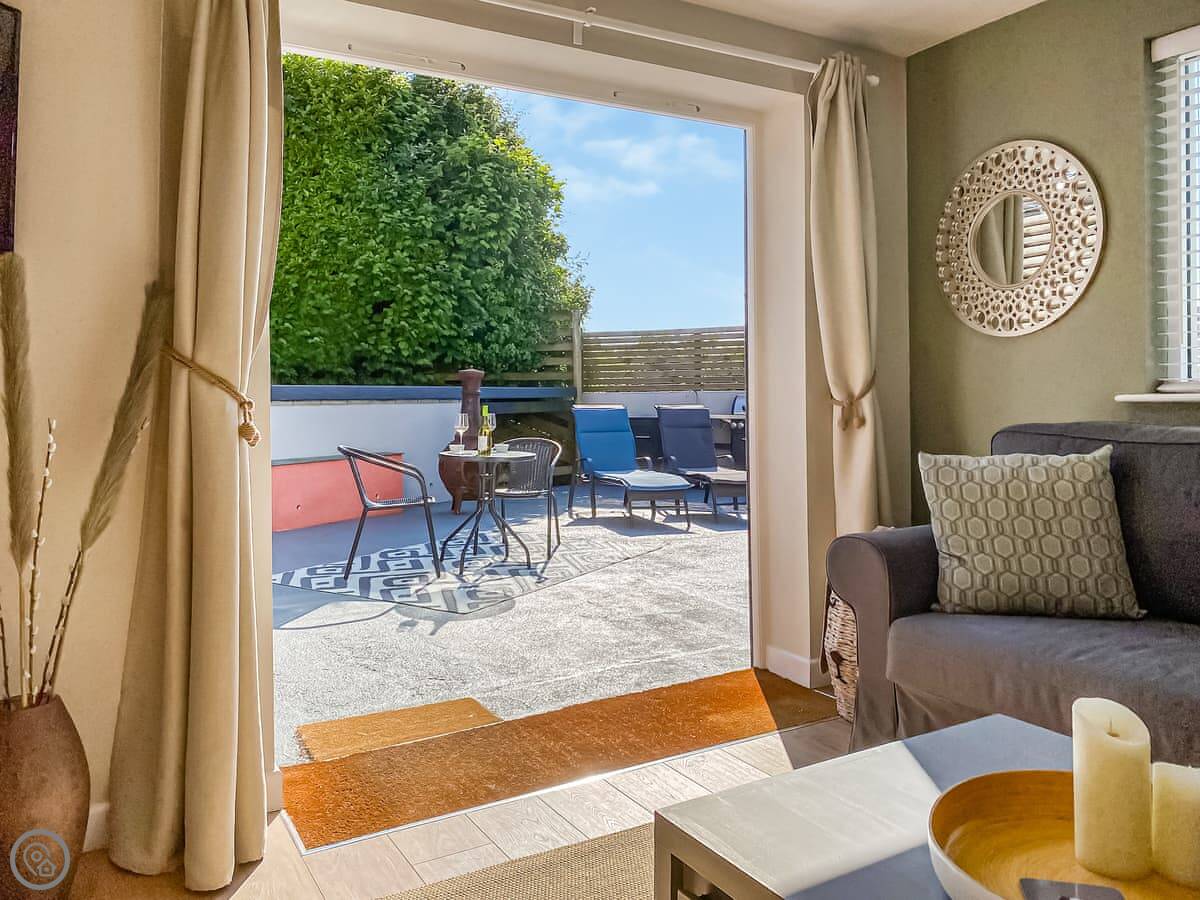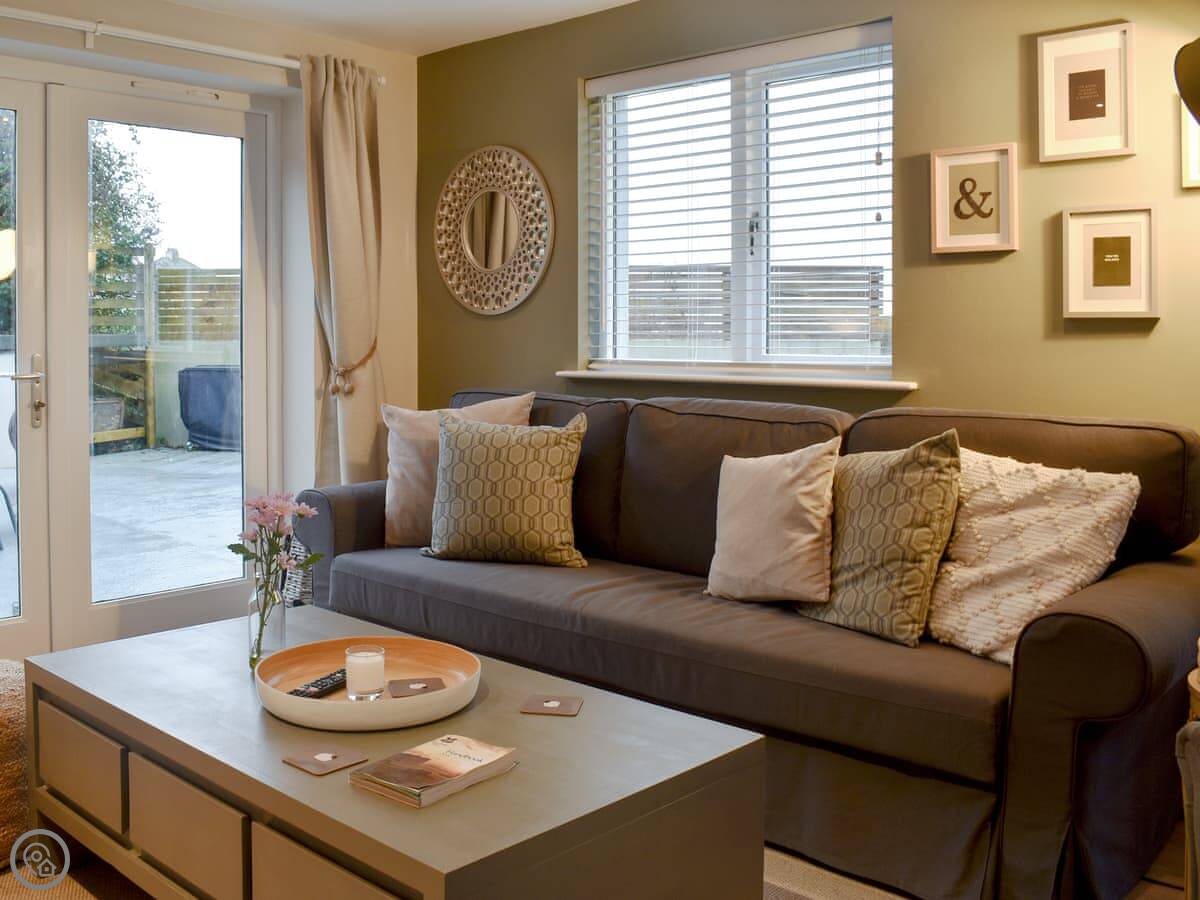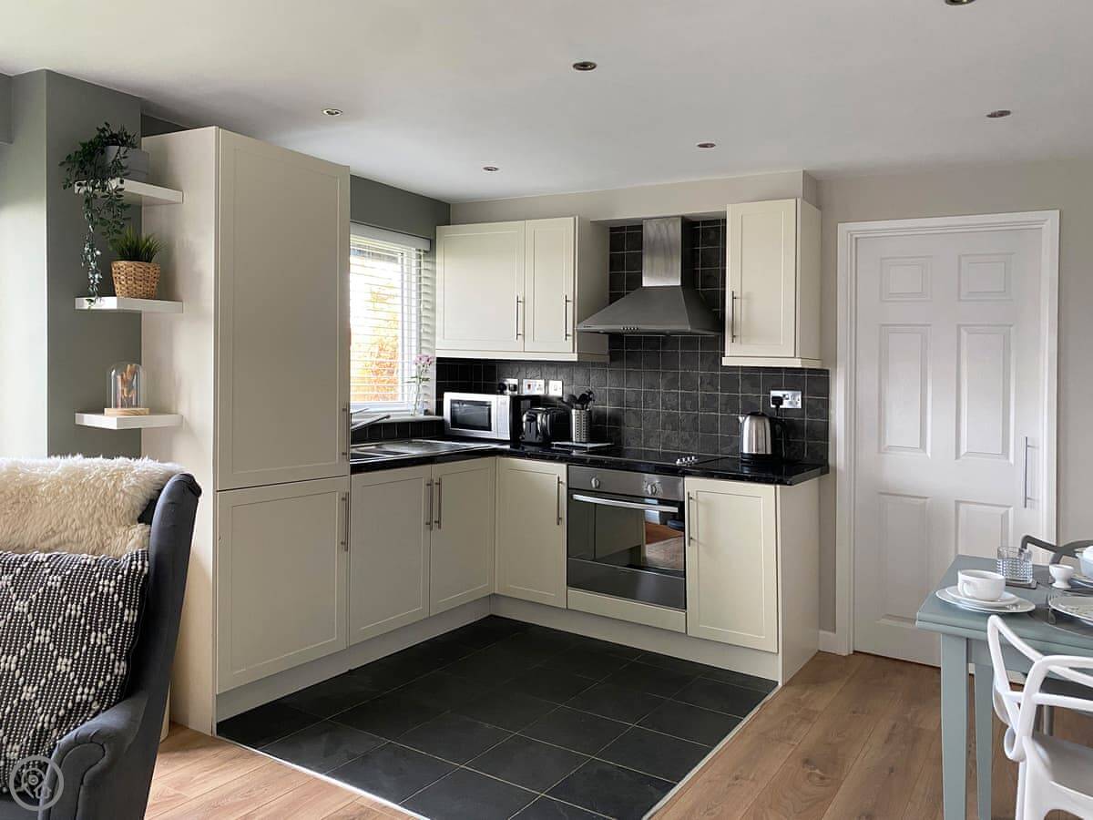 Inside, it's open plan. Patio doors from the living area go out to the garden. The bedroom is at the other end and has its own en-suite shower room. The kitchen has what you need. We include all bedding and towels.