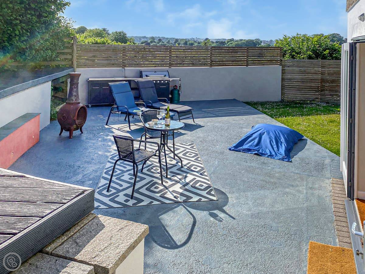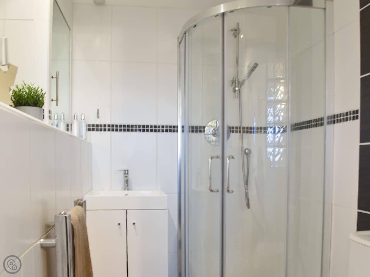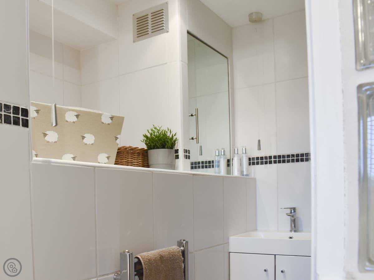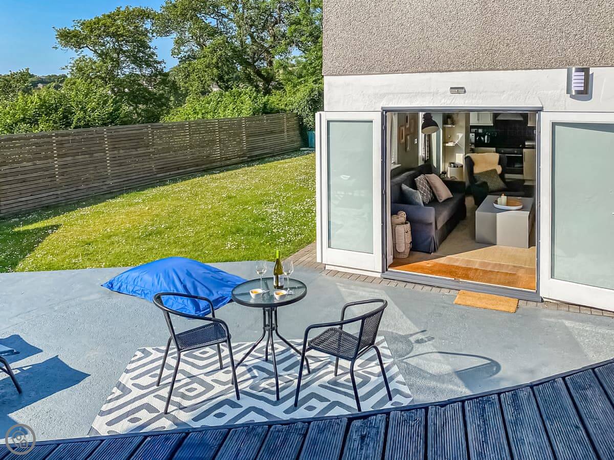 Inside, it's open plan. Patio doors from the living area go out to the garden. The bedroom is at the other end and has its own en-suite shower room. The kitchen has what you need. We include all bedding and towels.