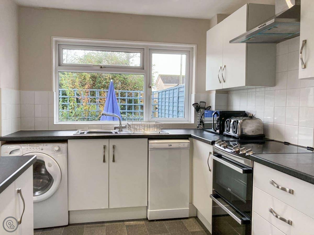 Downstairs, you've got separate rooms: a living room and a dining room. The kitchen has what you need and a washer/dryer. Door leads out to the back garden. It's enclosed, so it's safe for dogs. There's a table and chairs out there.