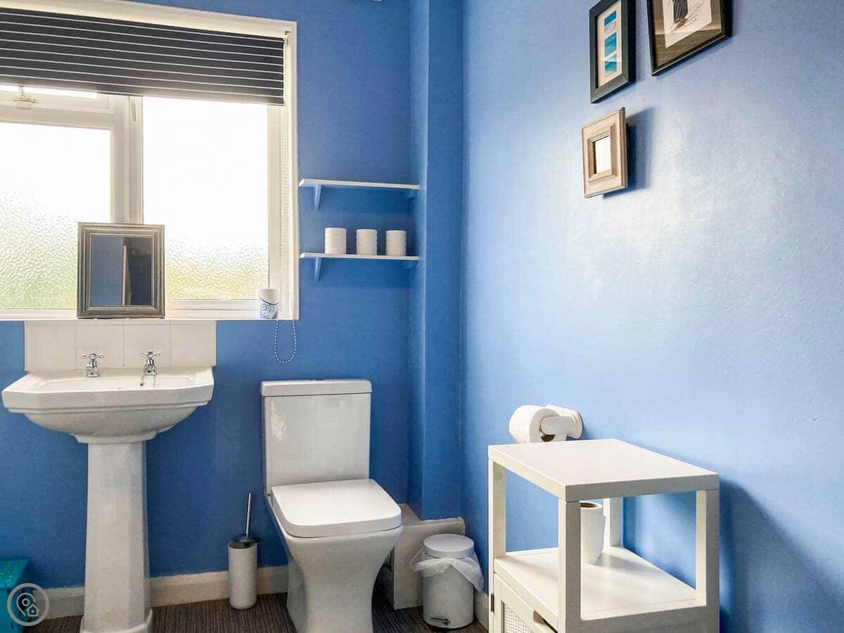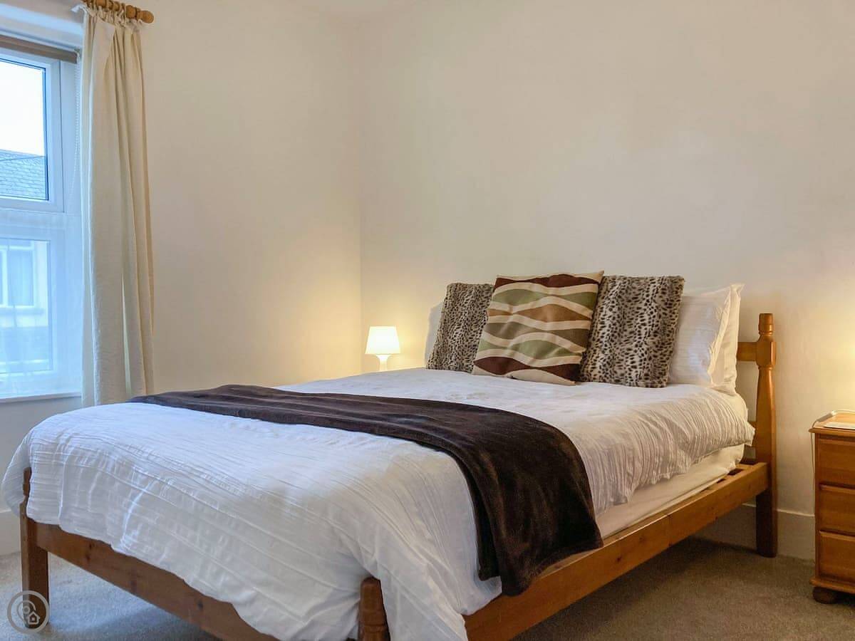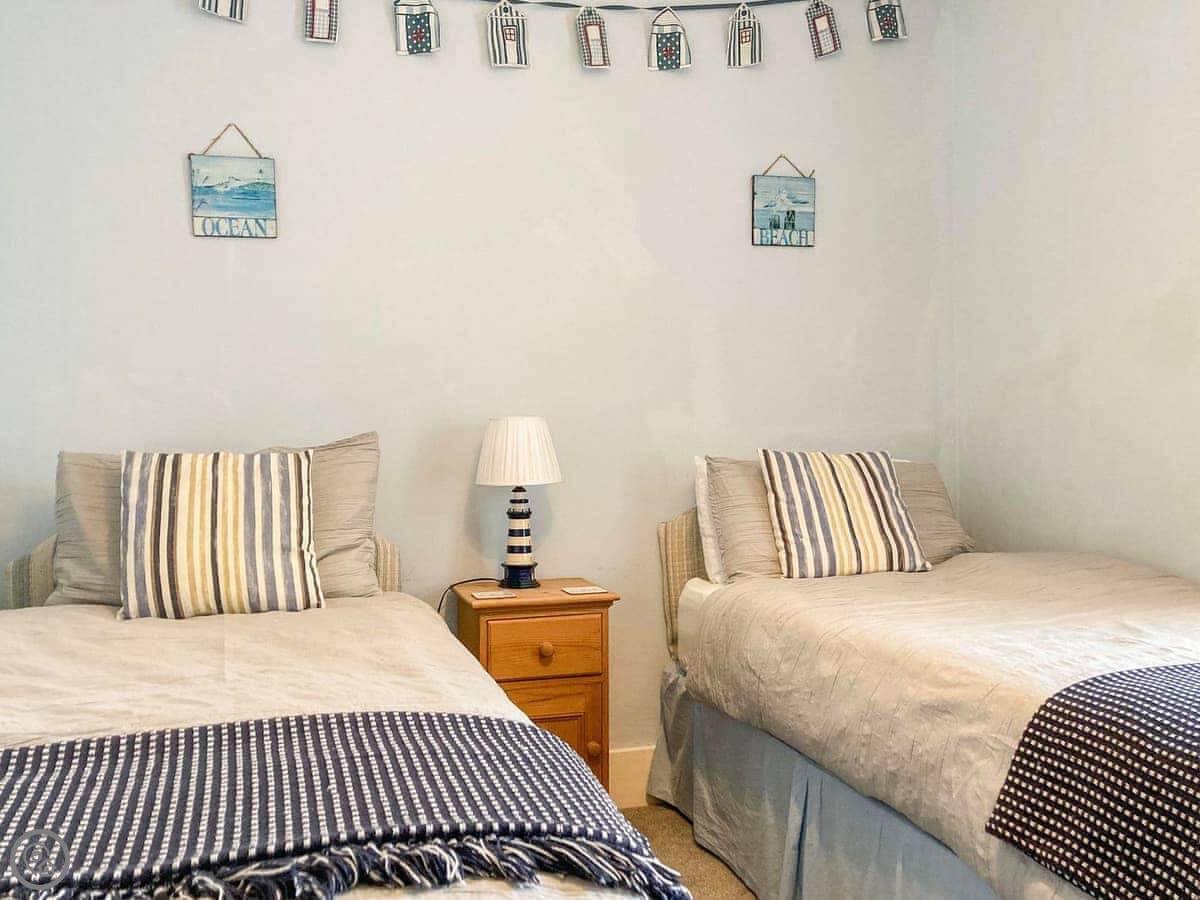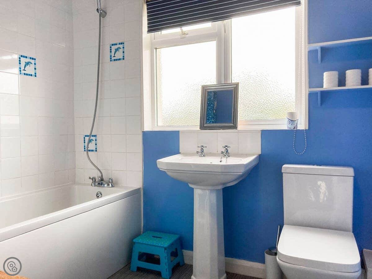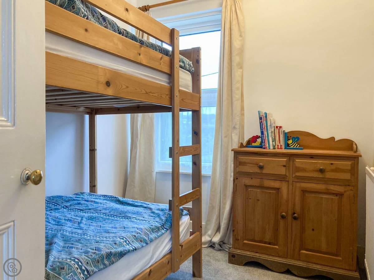 Dolphin Cottage is in Braunton, in a terrace of similar houses. It's a three bed place, sleeps five, good for a family. There's a double, a twin, and a bunk room. One bathroom upstairs with a bath and a shower attachment.