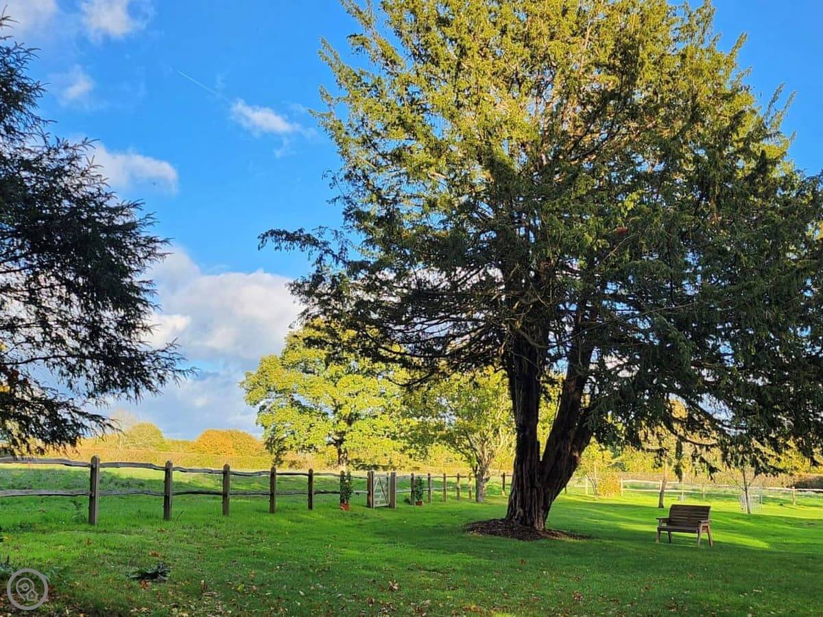 It’s two separate huts. One hut is the bedroom and bathroom, with a kingsize bed and an en-suite shower. You have to go outside to get to the other hut, which is the kitchen and living space. It's a proper fitted kitchen with a dishwasher. The idea is you get a bit more room than in a single hut. It's in a wooded spot.