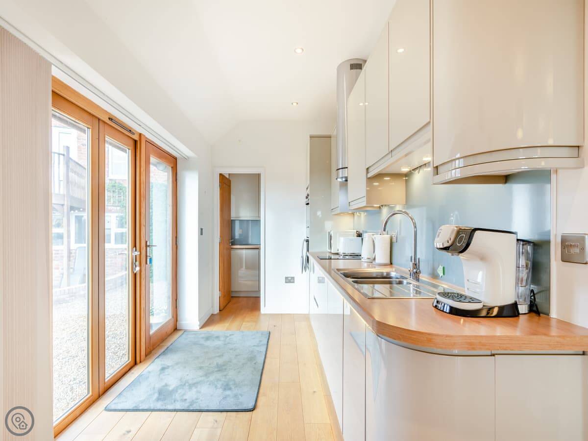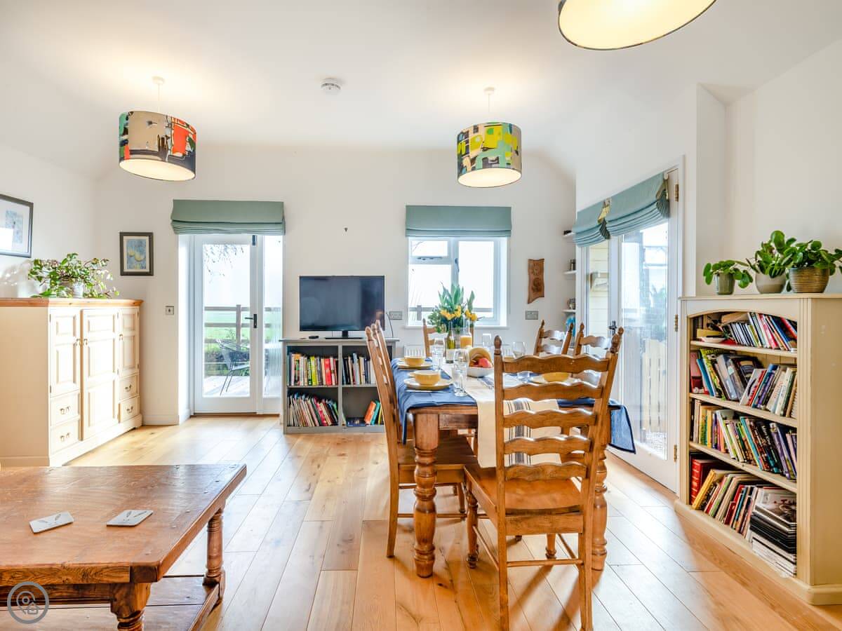 Inside, it's open plan. There's a kitchen area, a sofa, and a TV. It has a dishwasher and a washing machine. Bedding and towels are included. We allow up to two dogs.