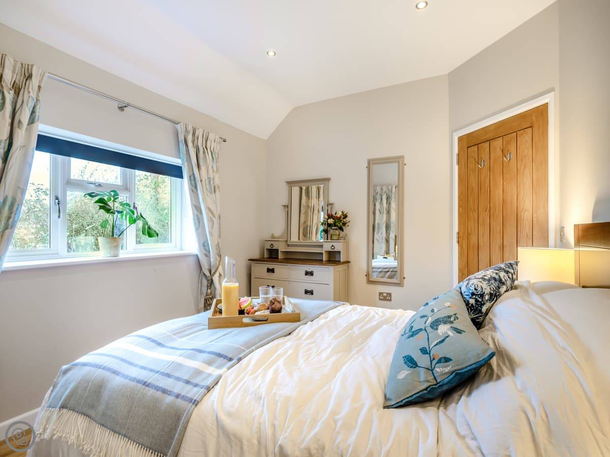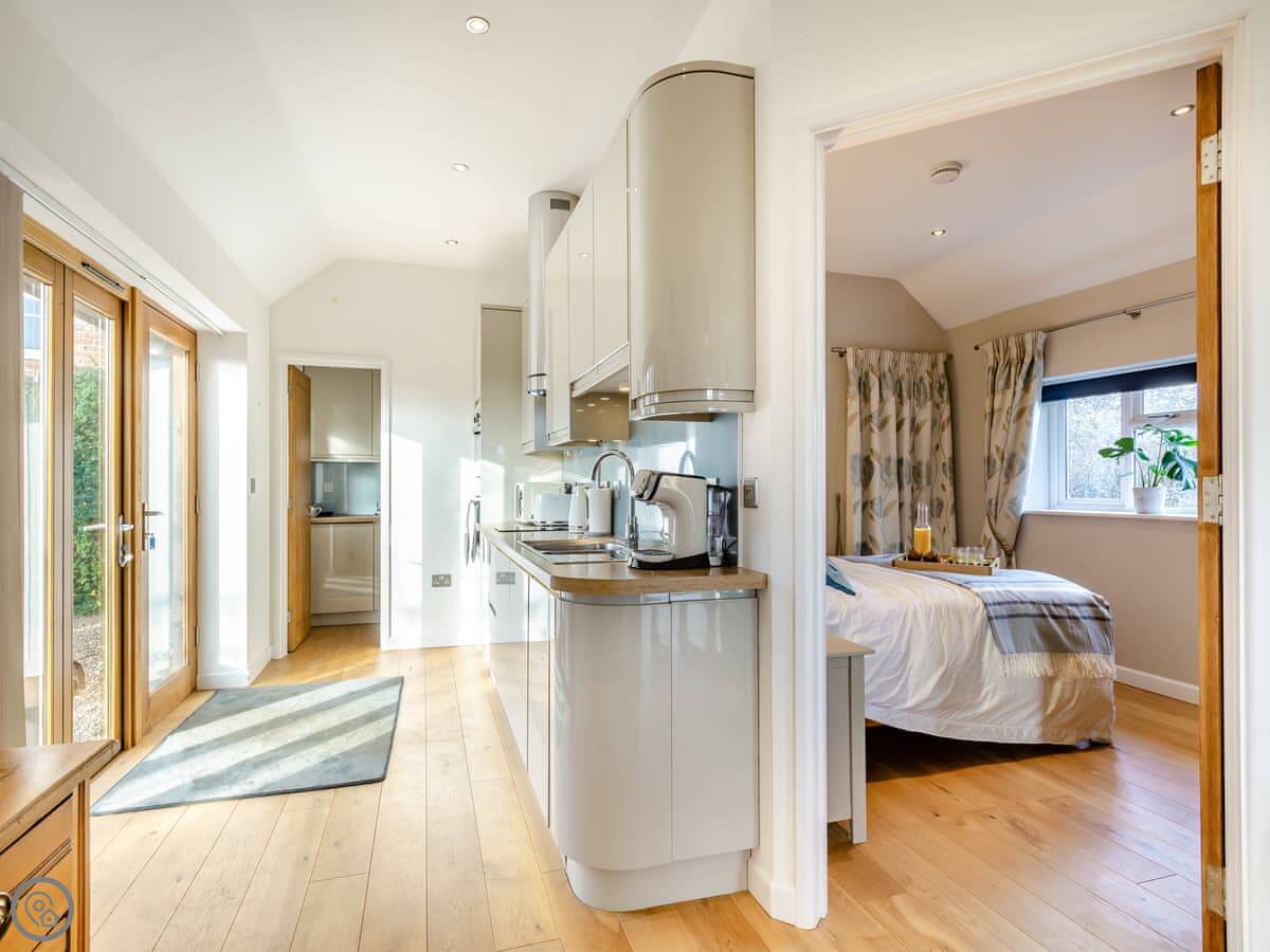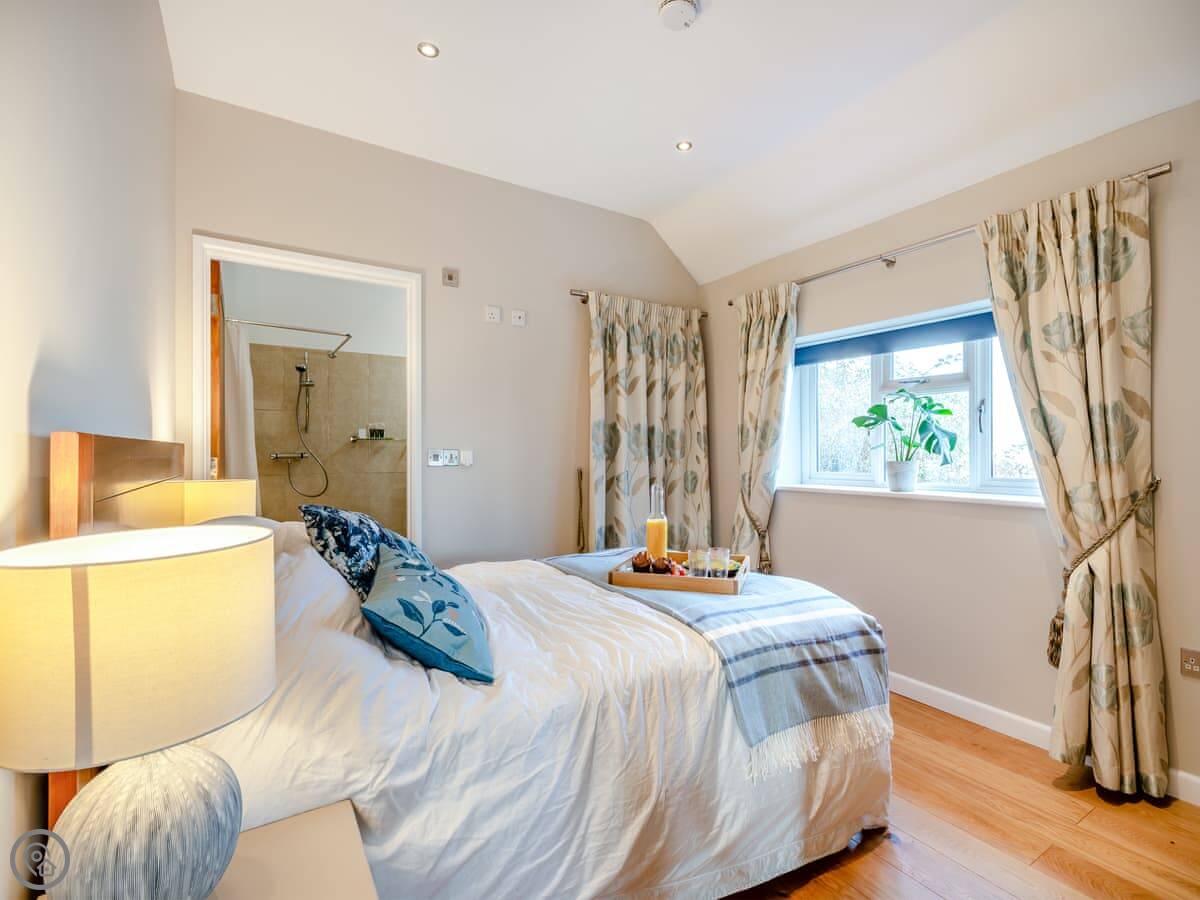 It sleeps three. One bedroom with a kingsize bed, one bathroom. It's got a 5 Star rating, which means it's well-equipped and comfortable. There are no steps or stairs anywhere, so it's all on one level. The bathroom is a wet room.